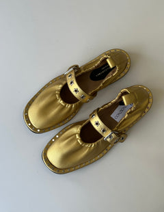 Estas zapatillas cuentan con detalles de tachuelas plateadas alrededor de la suela. Tienen una correa, con detalles de tachuelas plateadas con forma de estrellas, que se asegura en el empeine con hebilla.