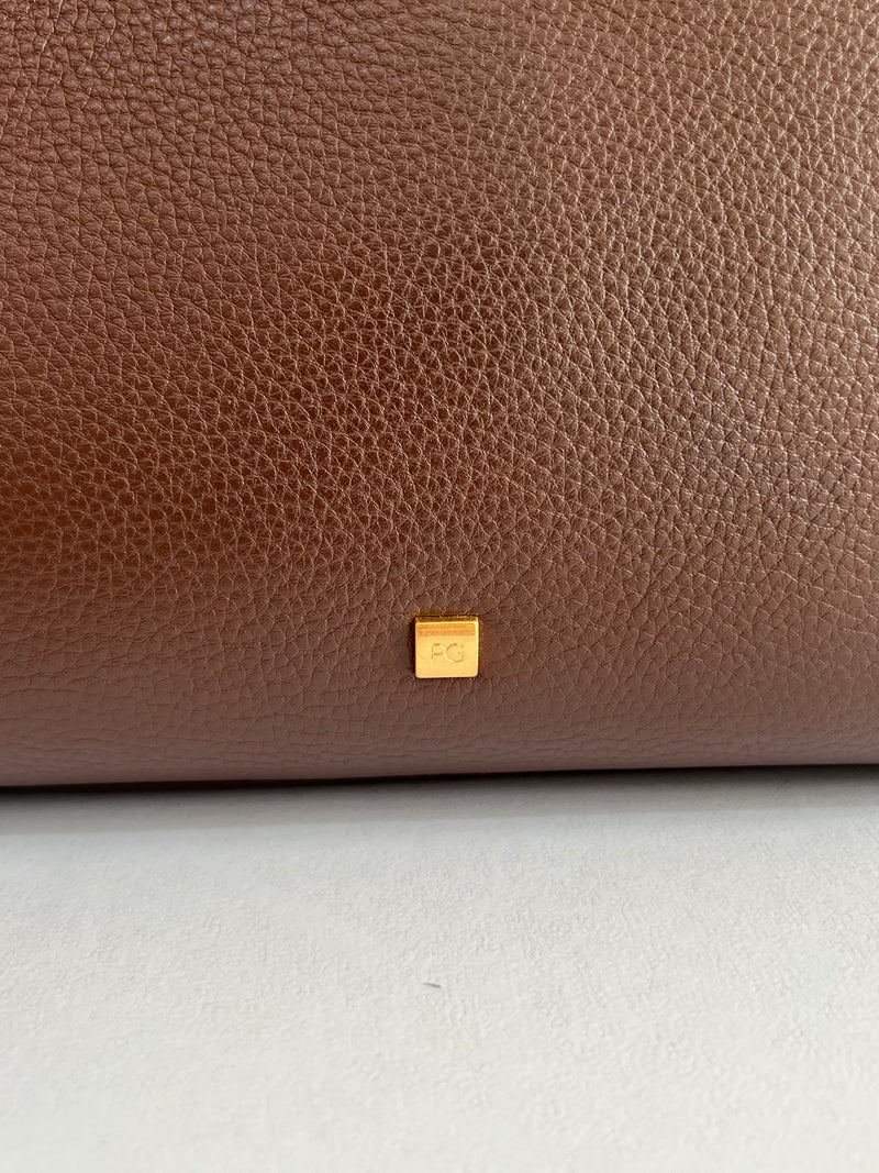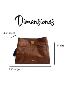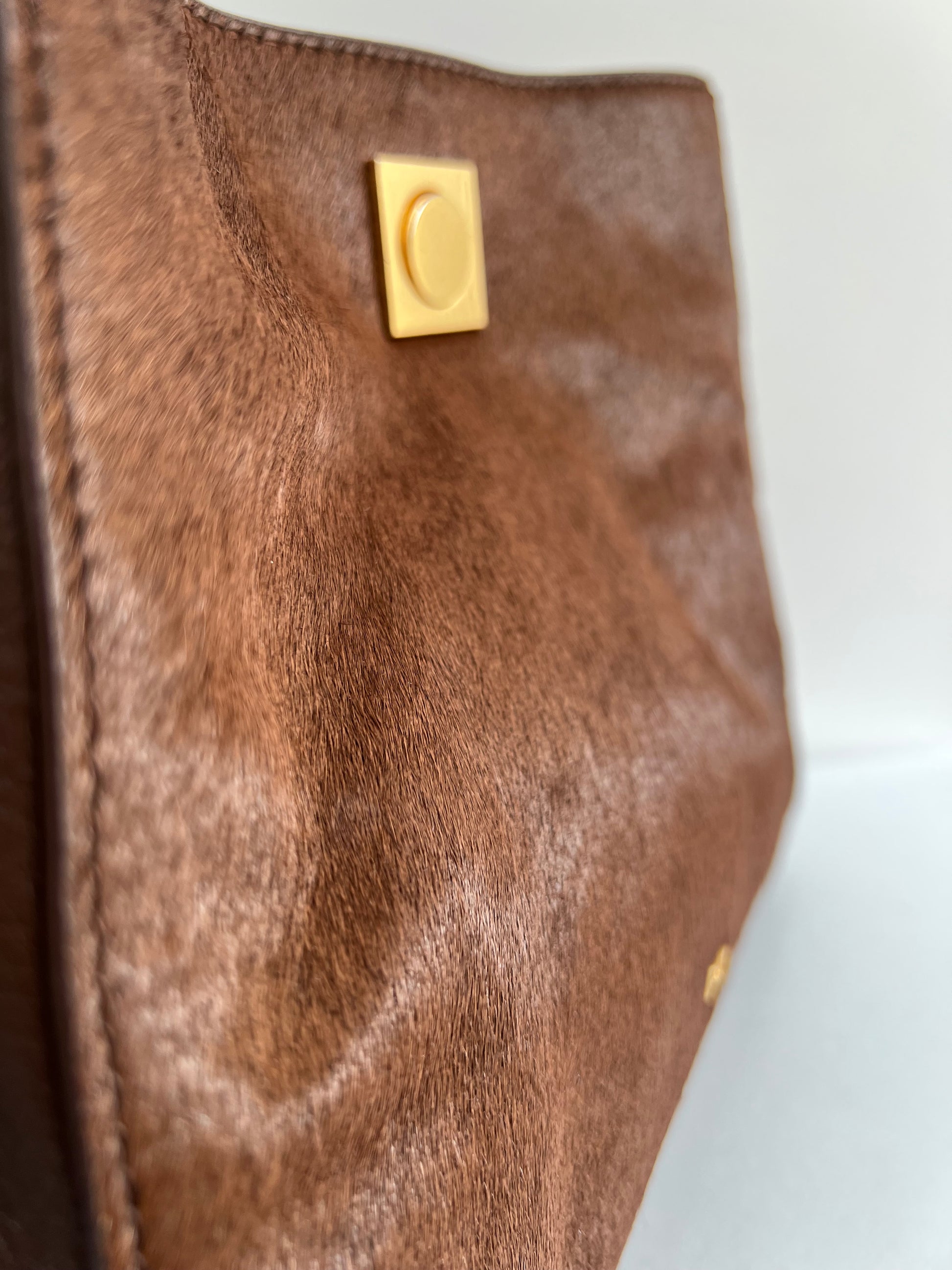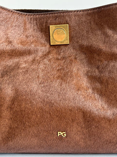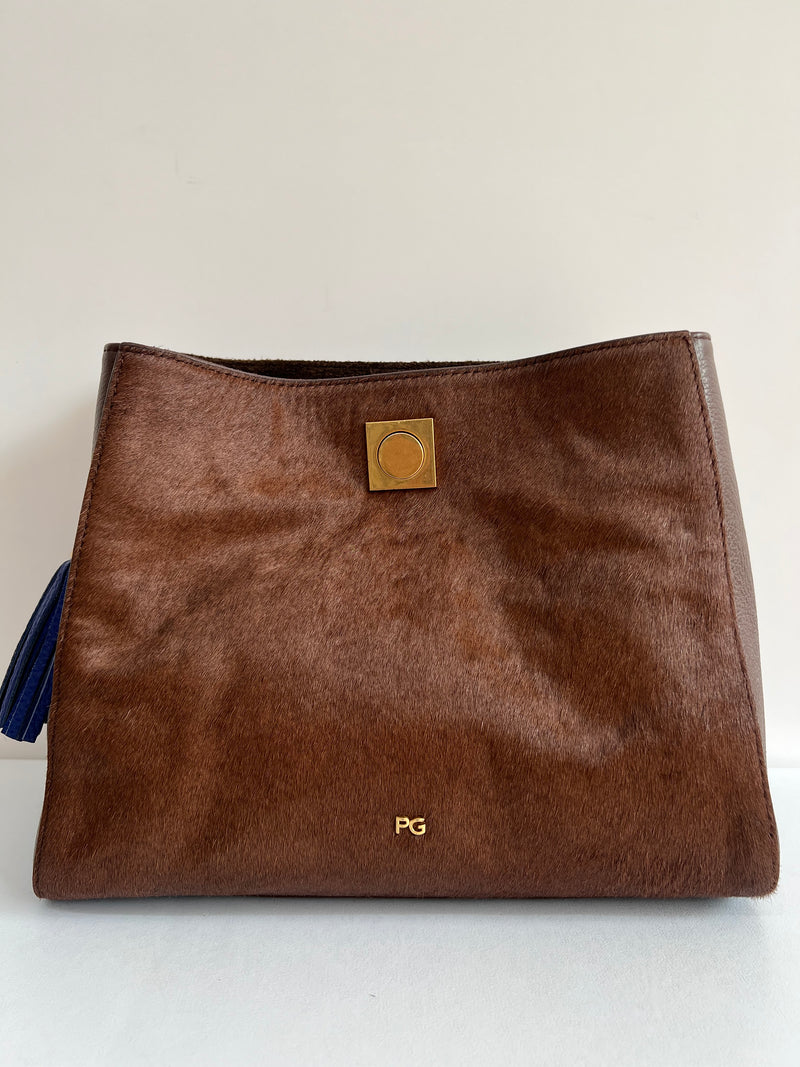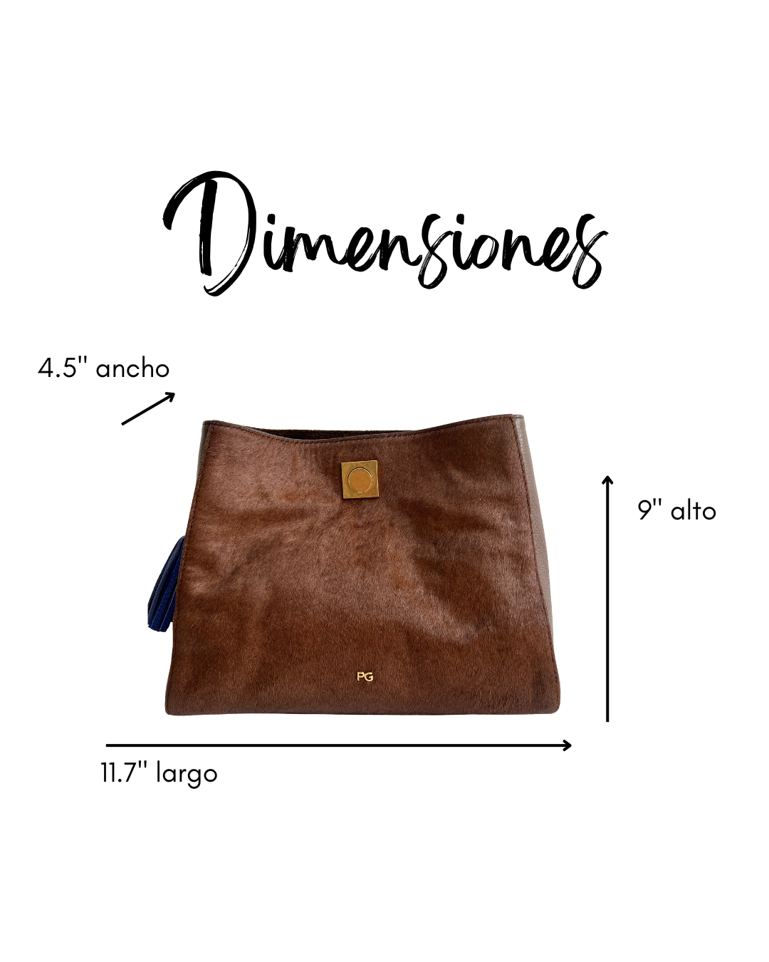 Bolso en piel sintética con acabado de pelo en tono almendra .El bolso cuenta con una forma rectangular con asas cortas superiores.