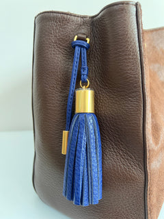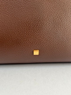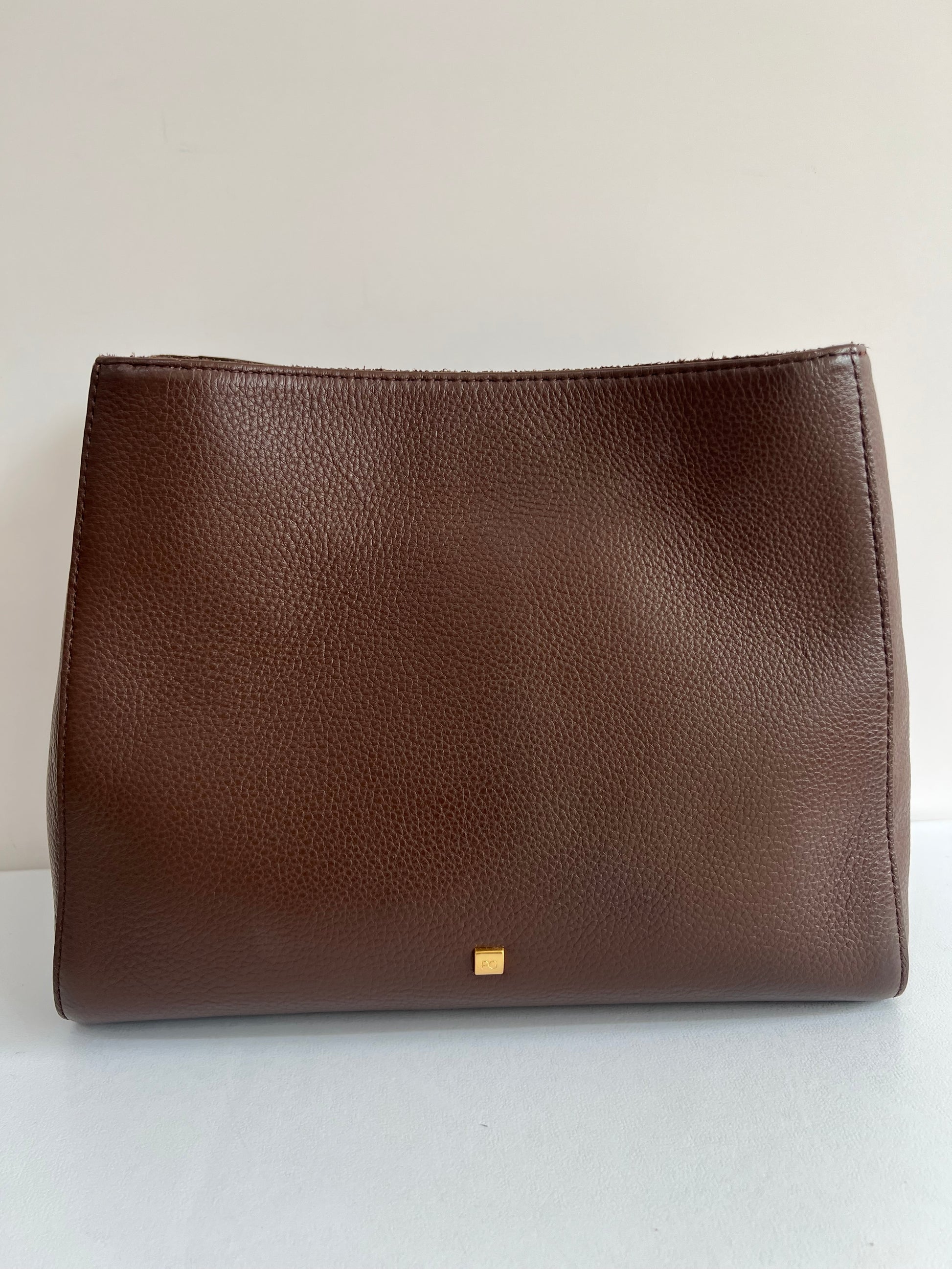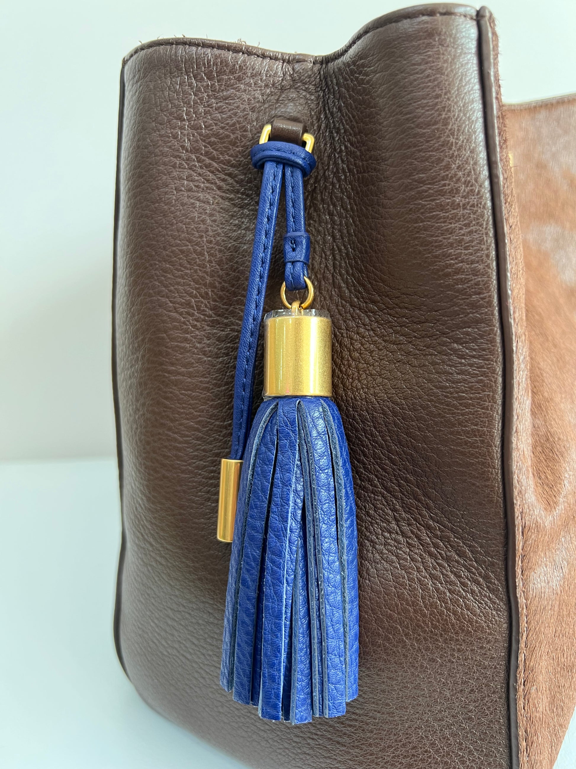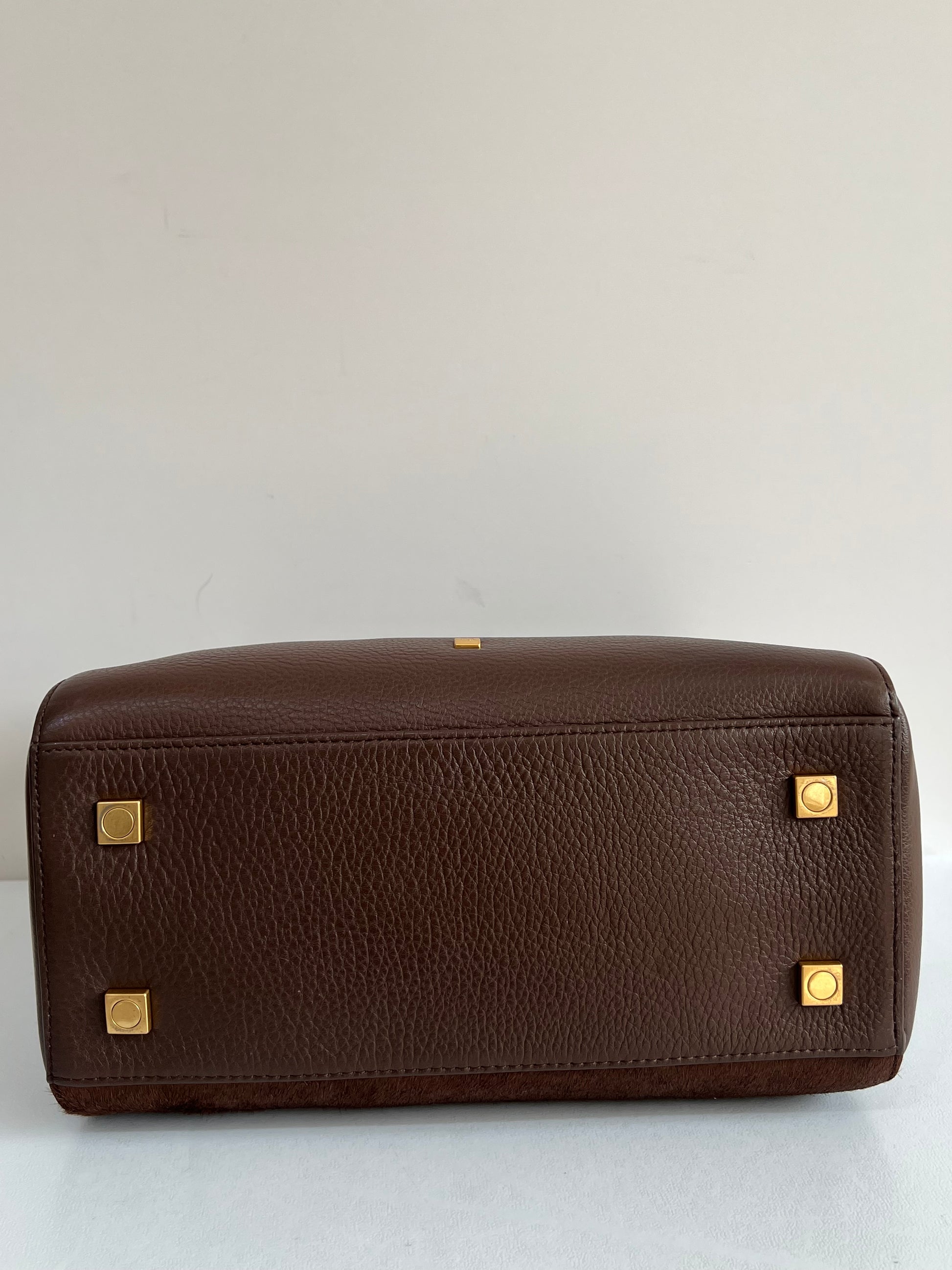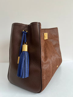Bolso en piel sintética con acabado de pelo en tono almendra .El bolso cuenta con una forma rectangular con asas cortas superiores.