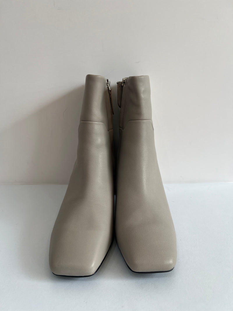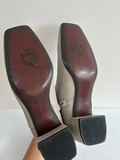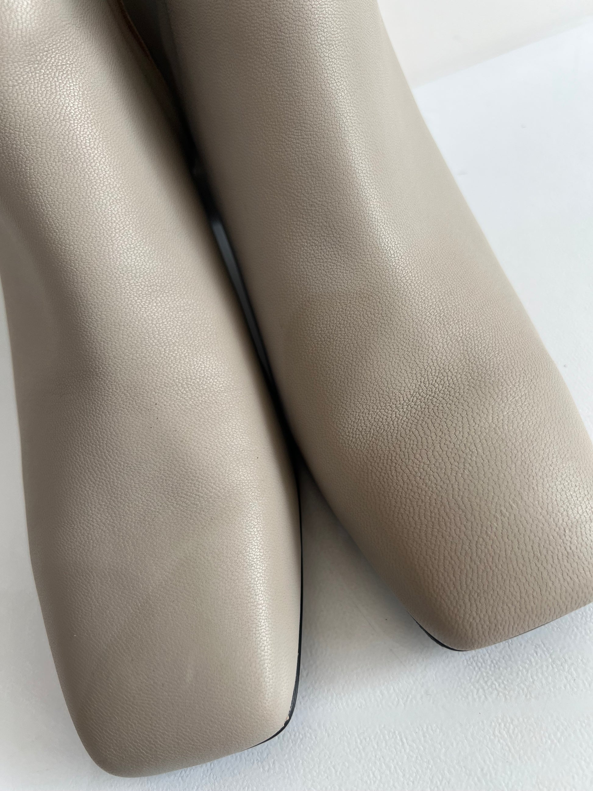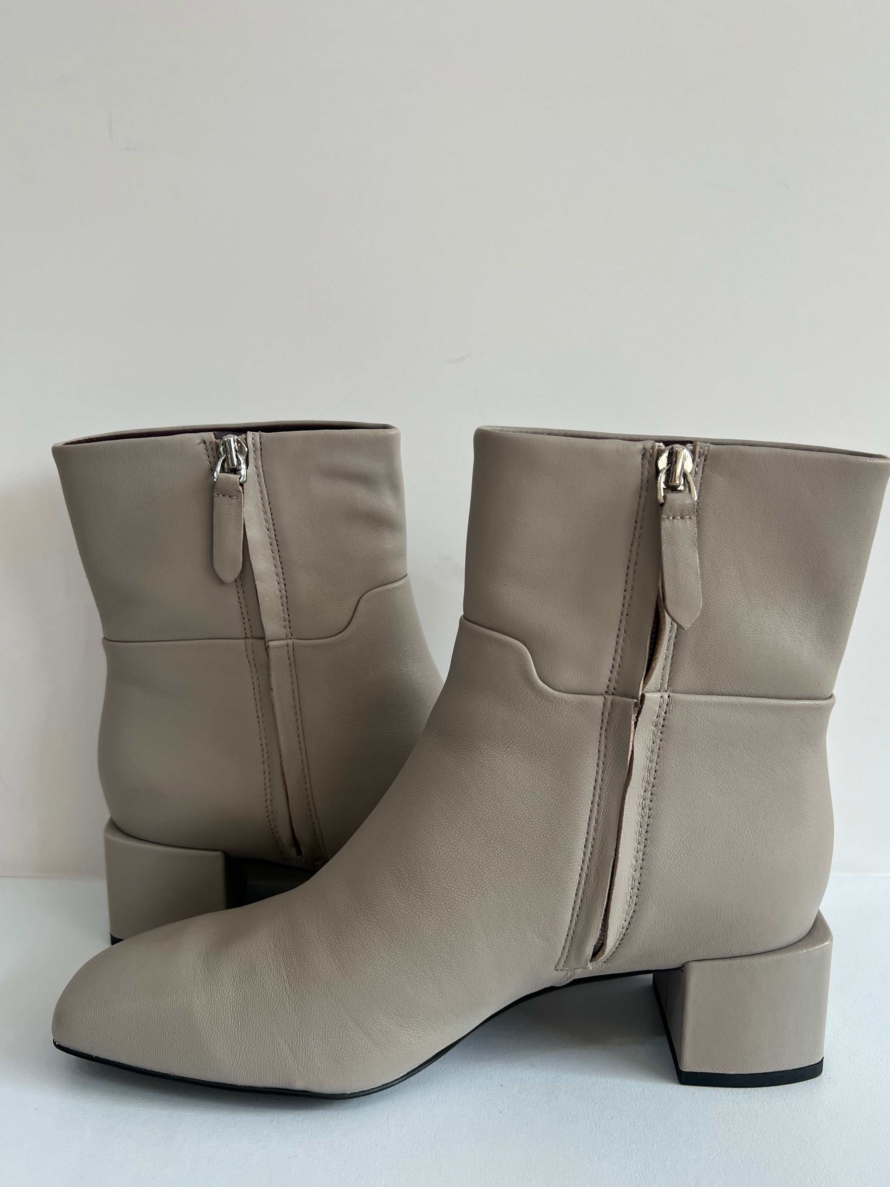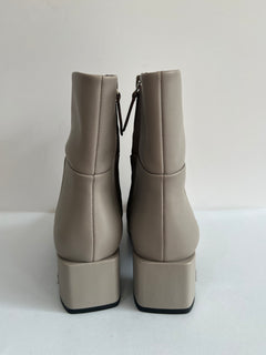 Elaborado en cuero con diseño de punta cuadrada y tacón bloque bajo. Cuenta con cierre lateral con cremallera.