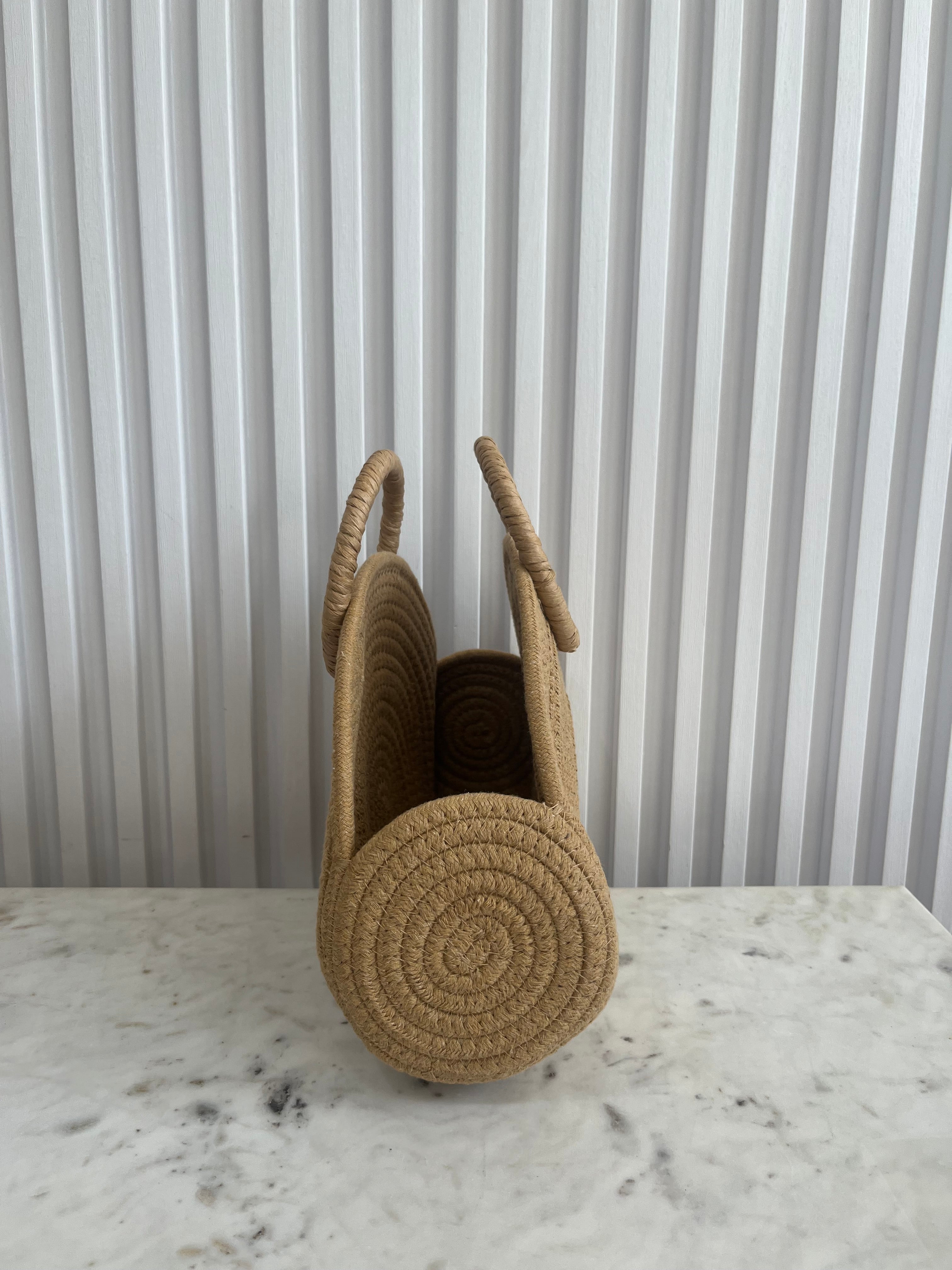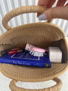 Este bolso es ideal para la playa. Tiene un top handle circular, caben muchas cosas adentro. No tiene cierre de ningun tipo.