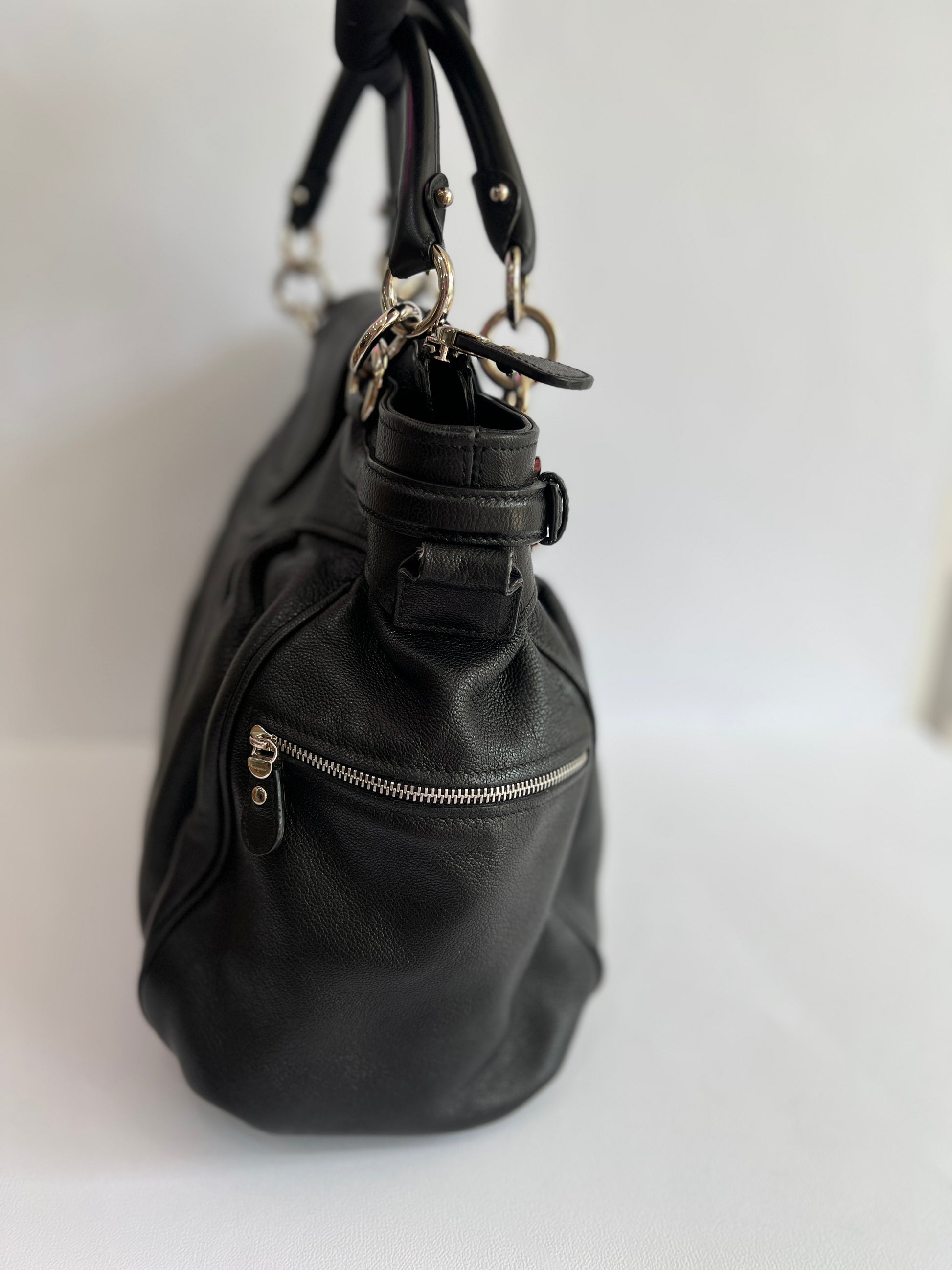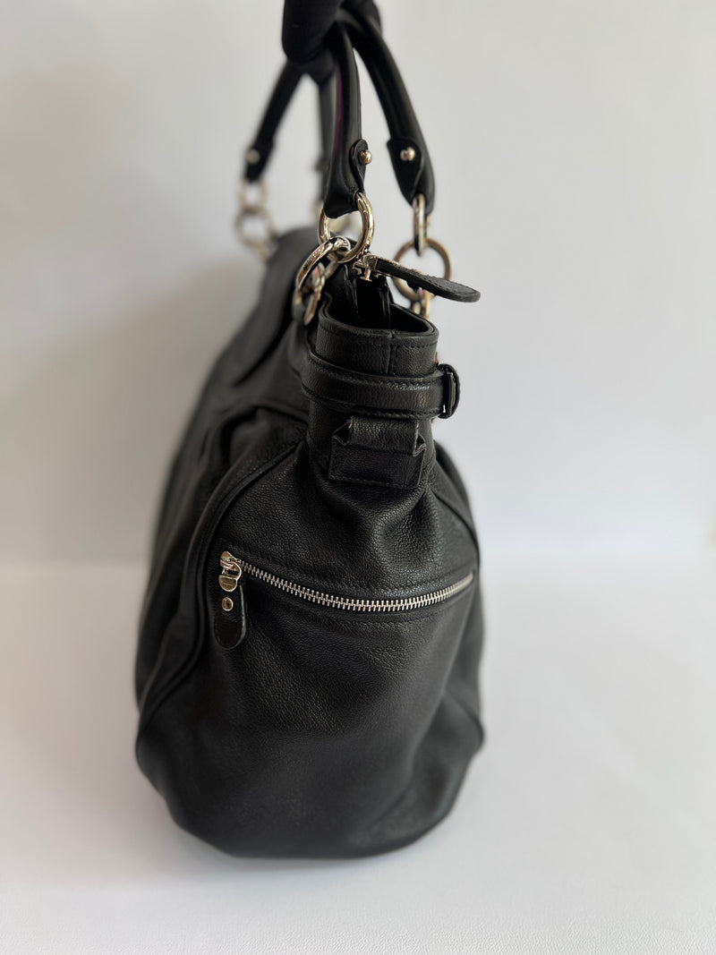 Este bolso cuenta con un top handle junto a una correa ajustable y desmontable. Su compartimento principal tiene un cierre de broche y zipper. En el interior, incluye un bolsillo con cierre de zipper en uno de los costados y bolsillos abiertos en el costado opuesto. En el exterior, presenta bolsillos con cierre de zipper en cada extremo.