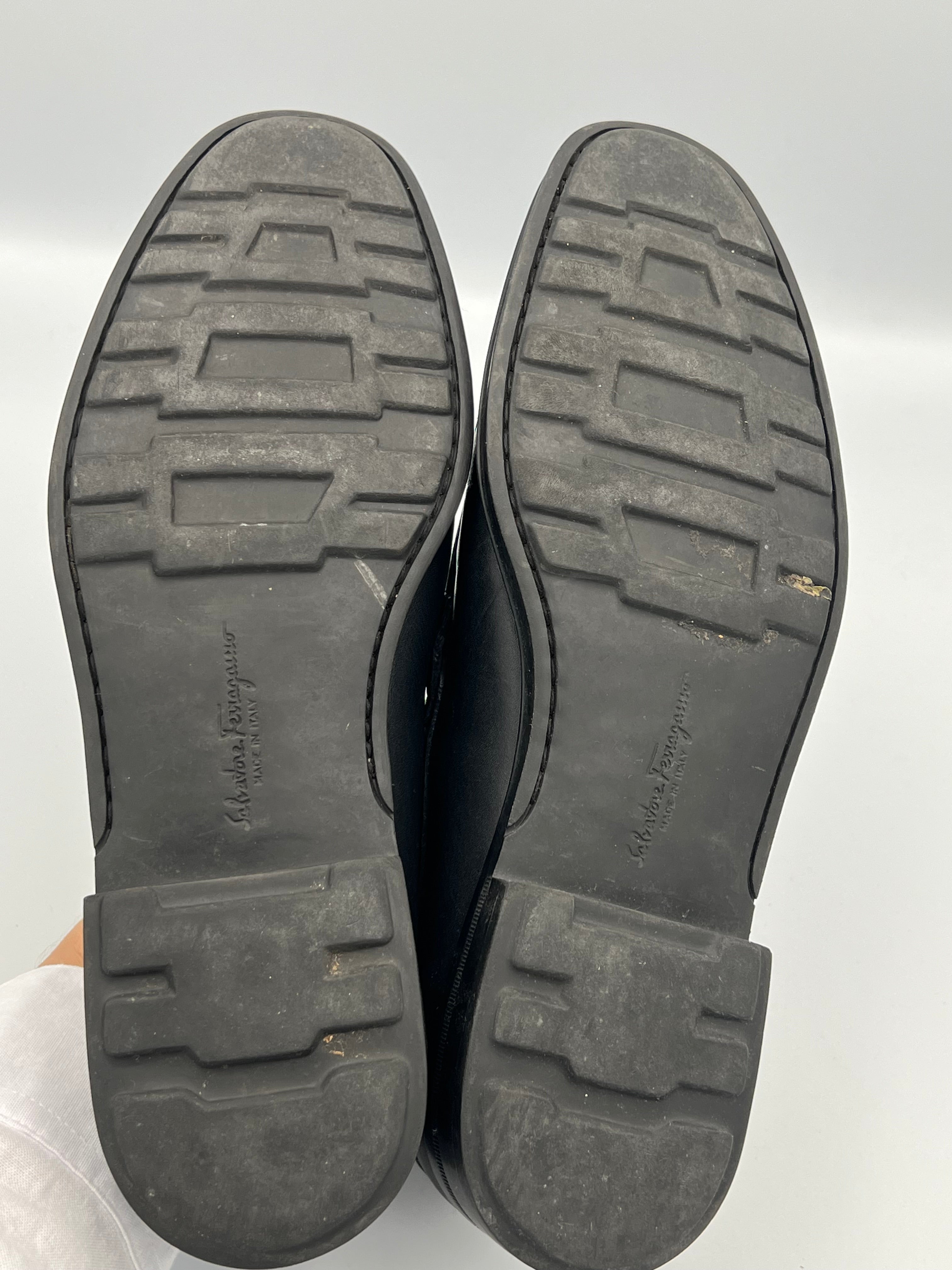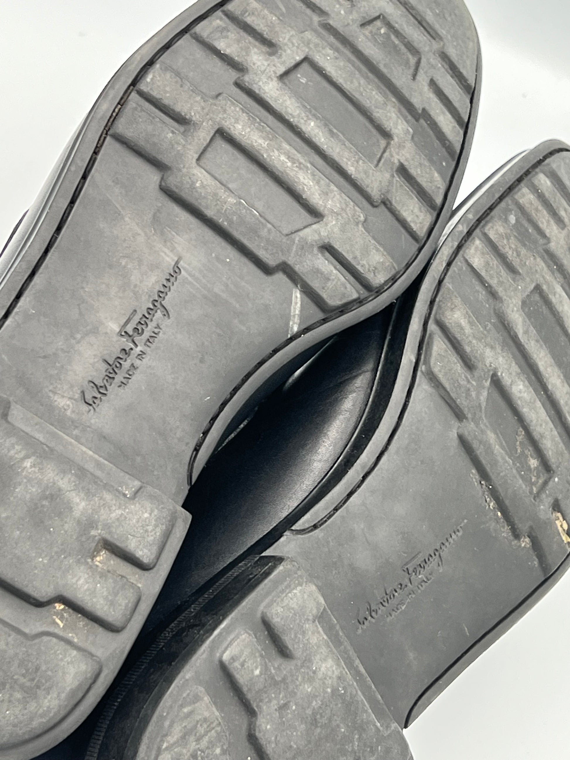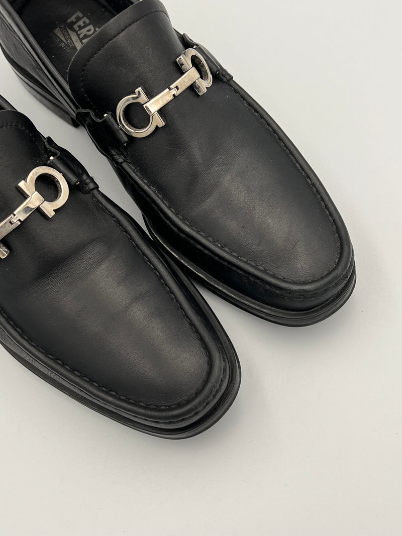 Mocasines Salvatore Ferragamo Gancini confeccionados en piel lisa de alta calidad. Presentan empeine de una sola pieza, detalle Gancini metálico aplicado en el frente, forro interior en cuero y plantilla acolchada para soporte. La estructura se completa con suela de cuero con inserciones de goma y costuras reforzadas que aseguran firmeza y durabilidad.