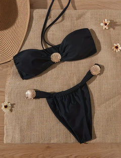Este traje de baño de dos piezas cuenta con detalles en dorados. La parte superior es ajustable al busto/espalda. Elaborado en 95% polyester, 5% Elastane.
