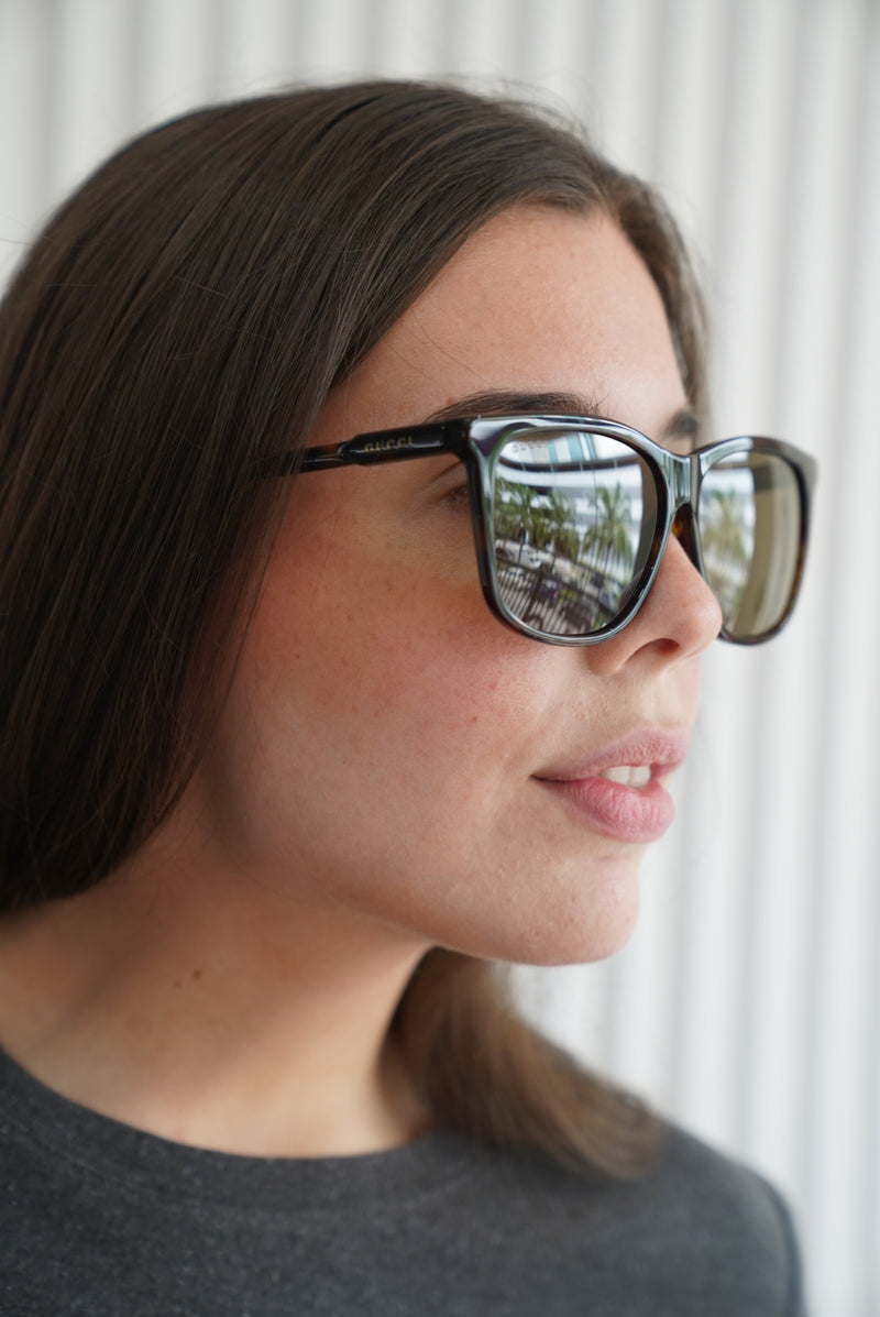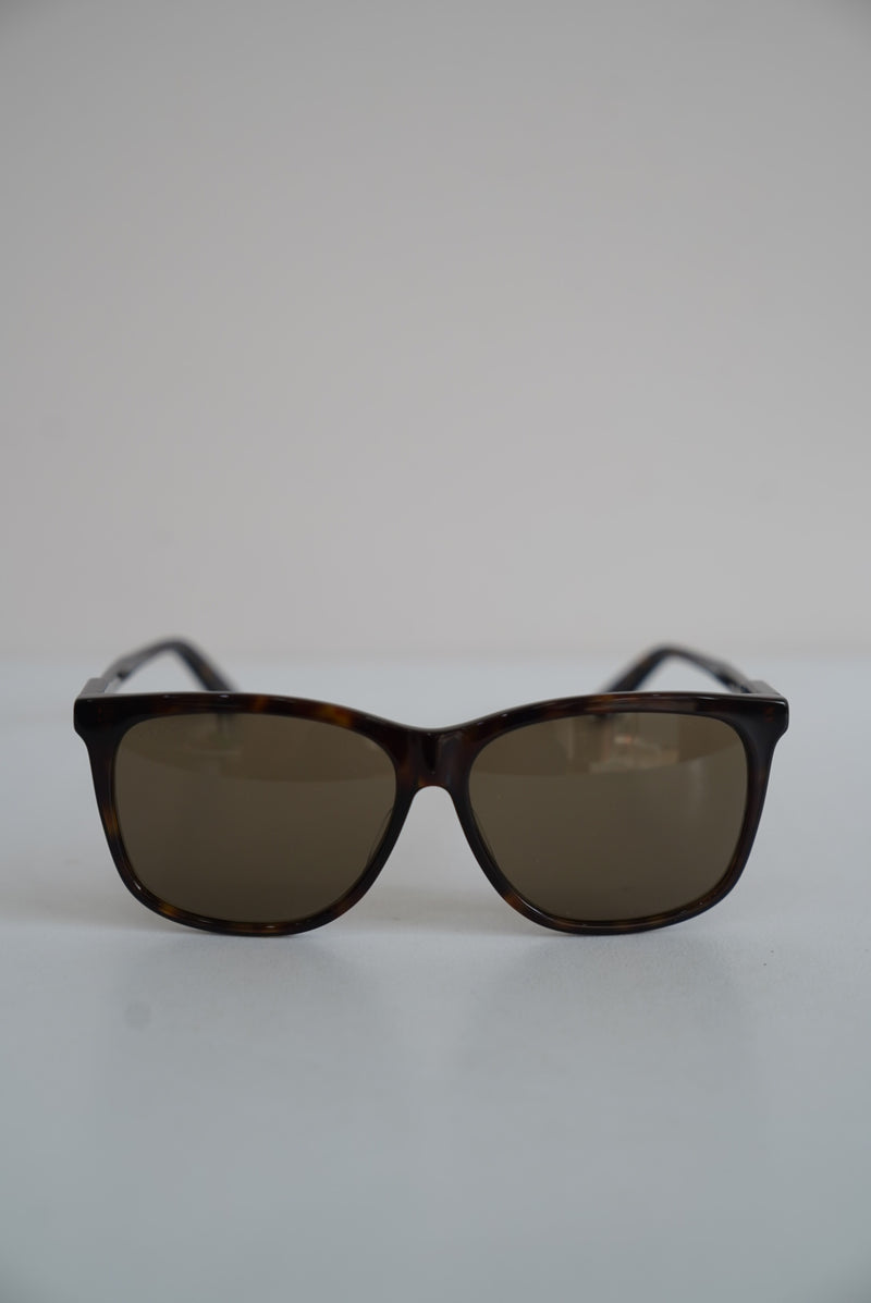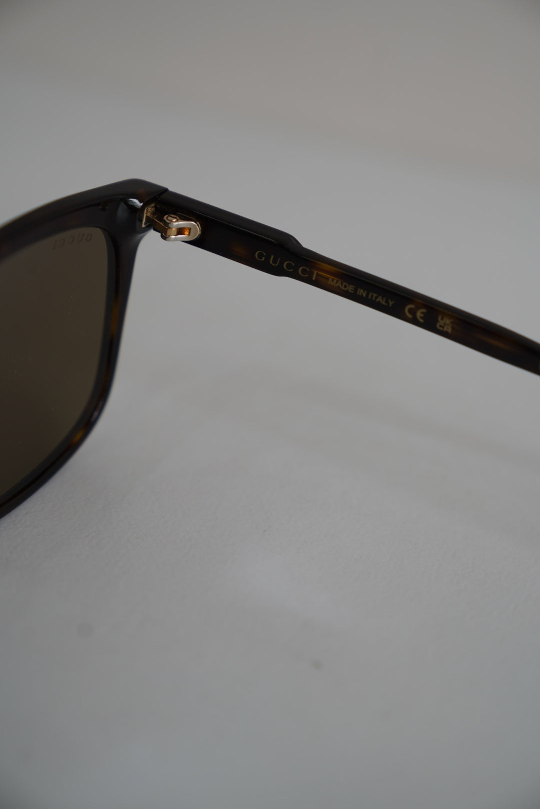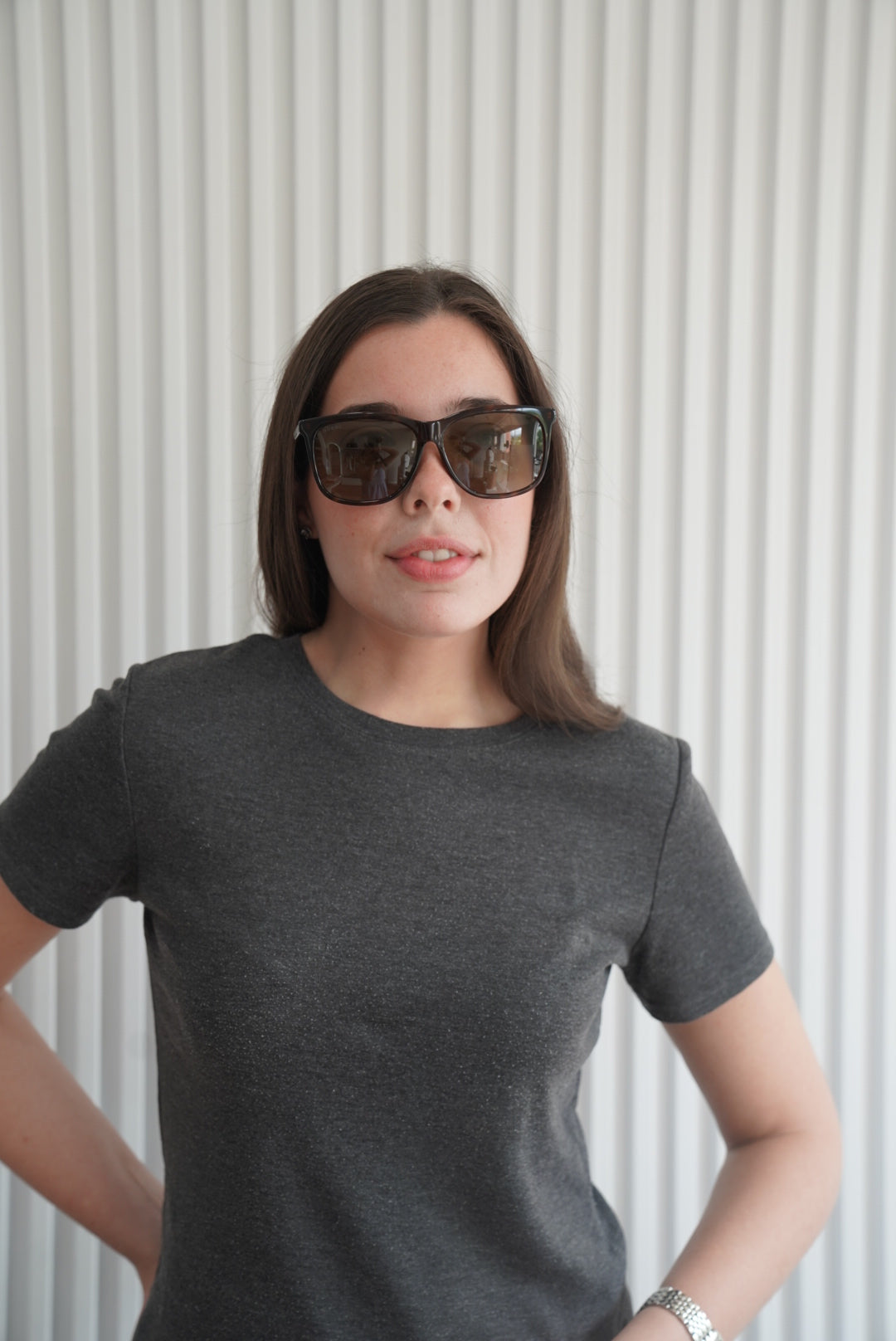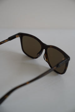Gafas de sol de acetato café con logo en dorado y en diseño cuadrado medianos.