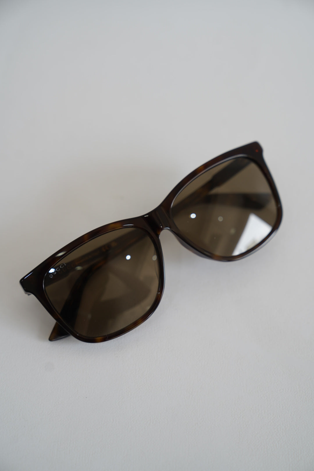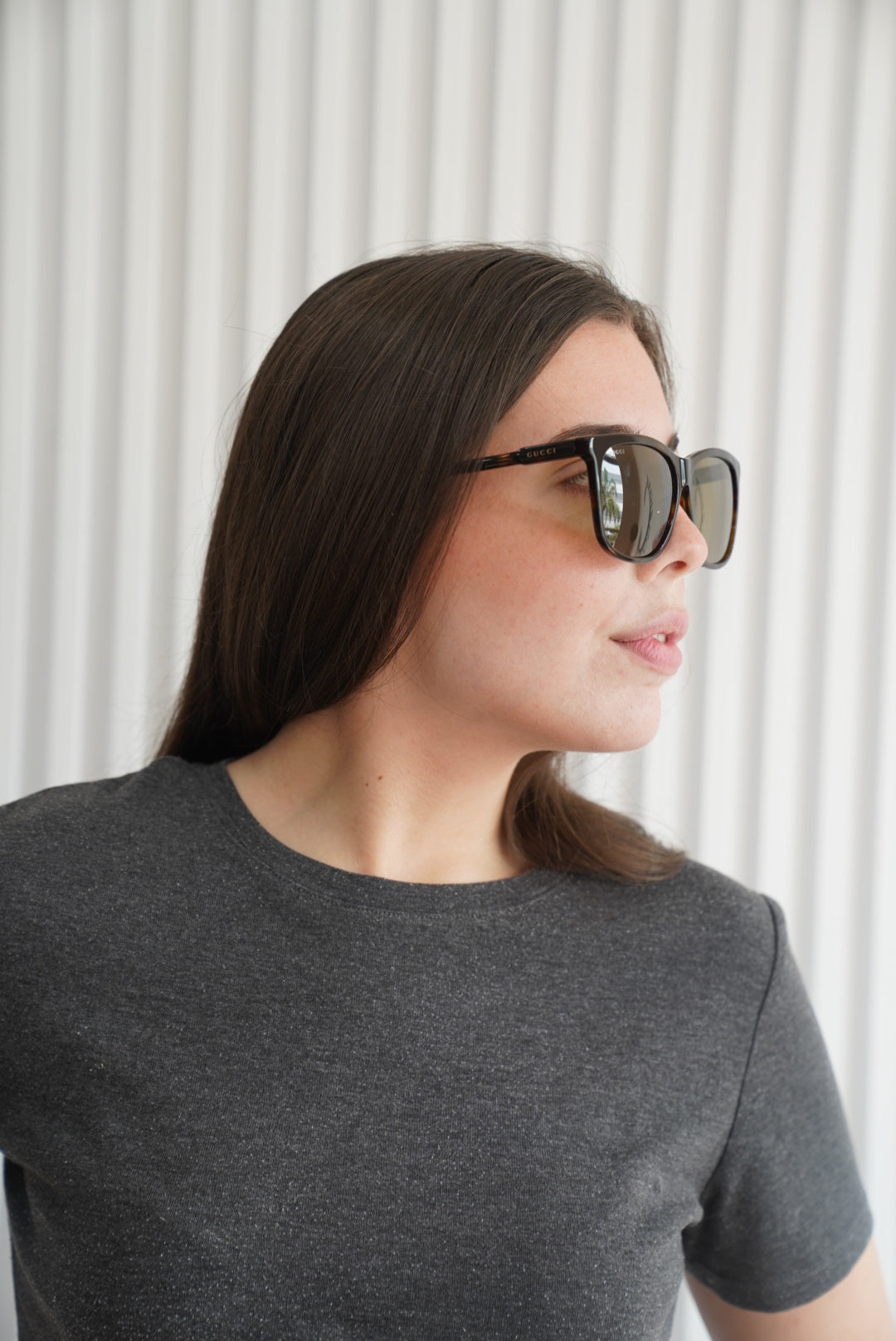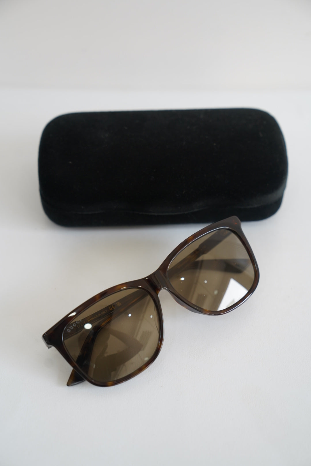 Gafas de sol de acetato café con logo en dorado y en diseño cuadrado medianos.