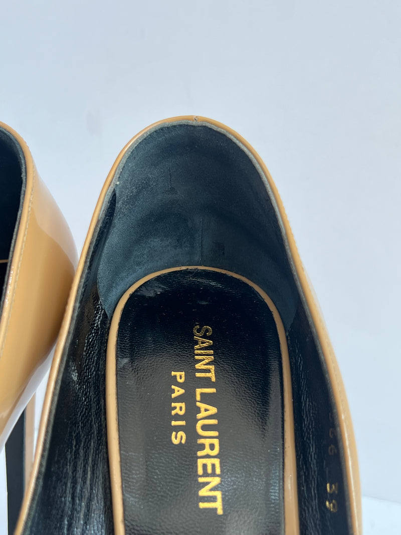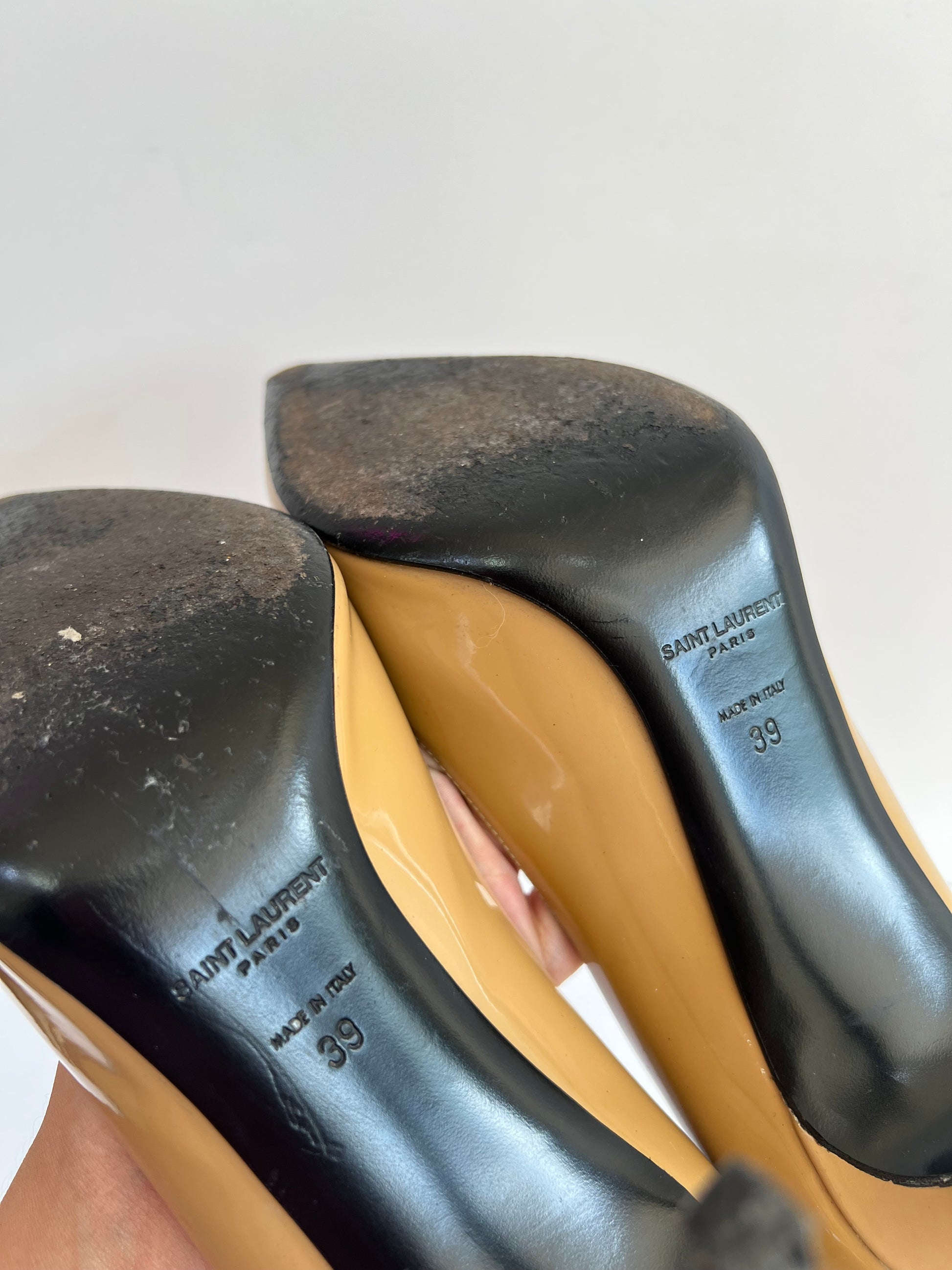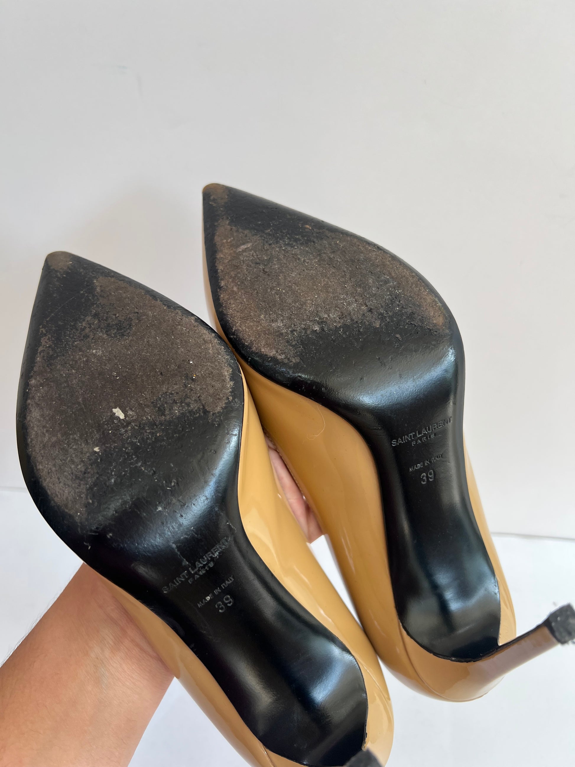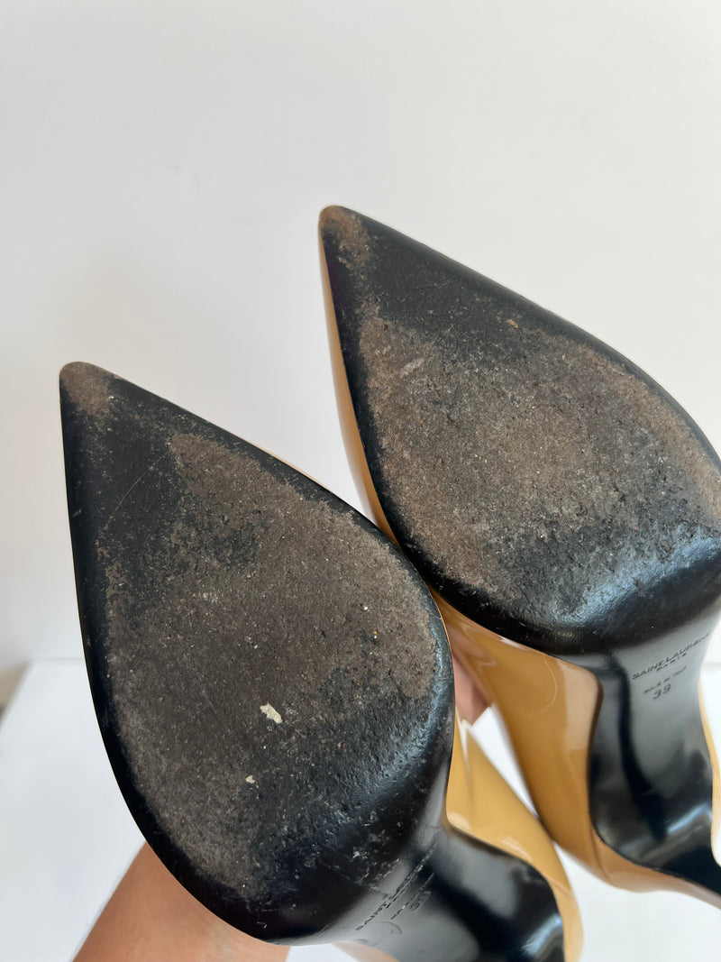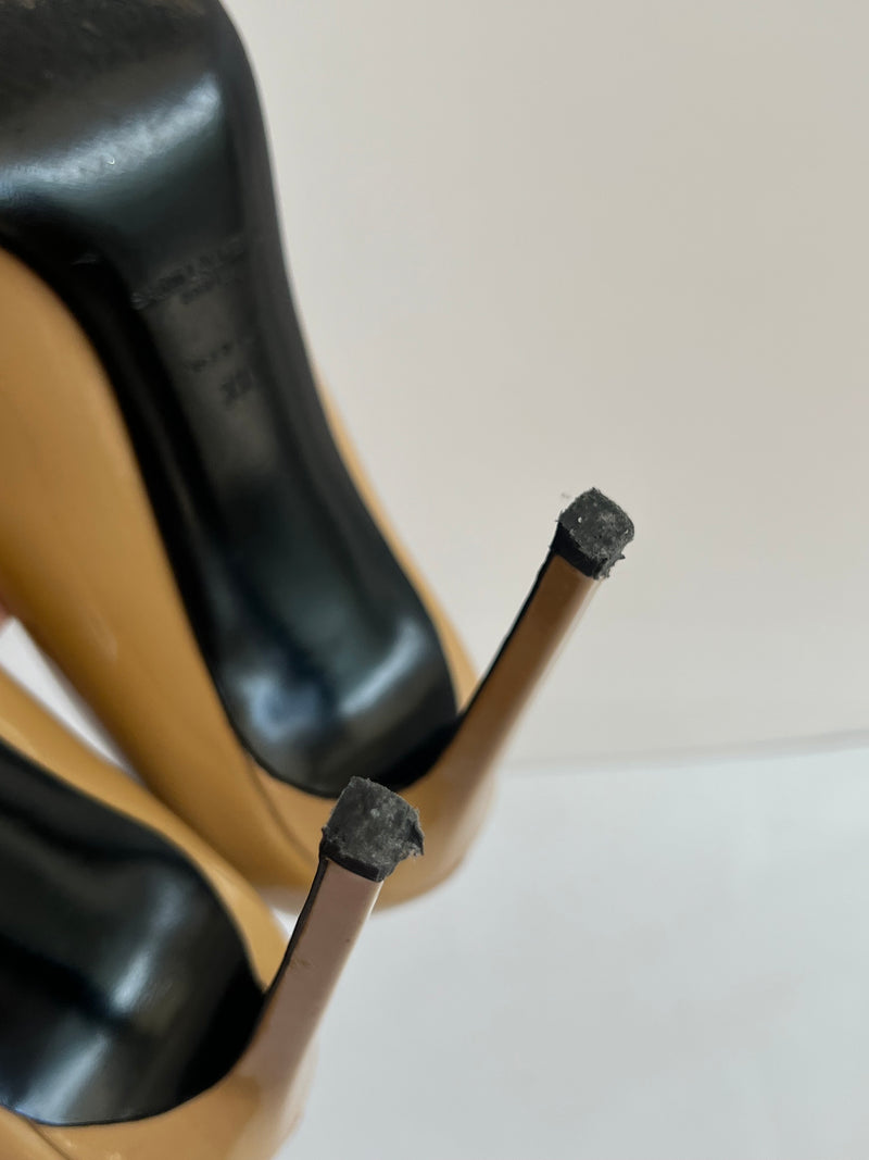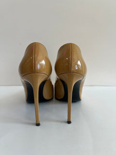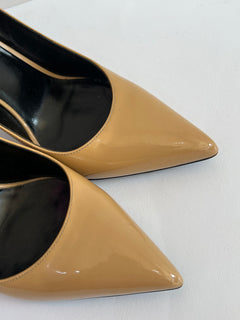 Pumps clásicos en tono nude, confeccionados en piel lisa con punta afilada. Incorporan tacón alto de aguja.
