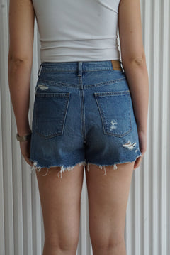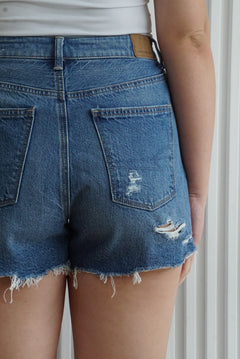 Shorts color azul claro elaborados de algodón, tiro alto, diseño Ripped en la parte frontal y bordes deshilachados, cierre frontal con Zíper y botón.