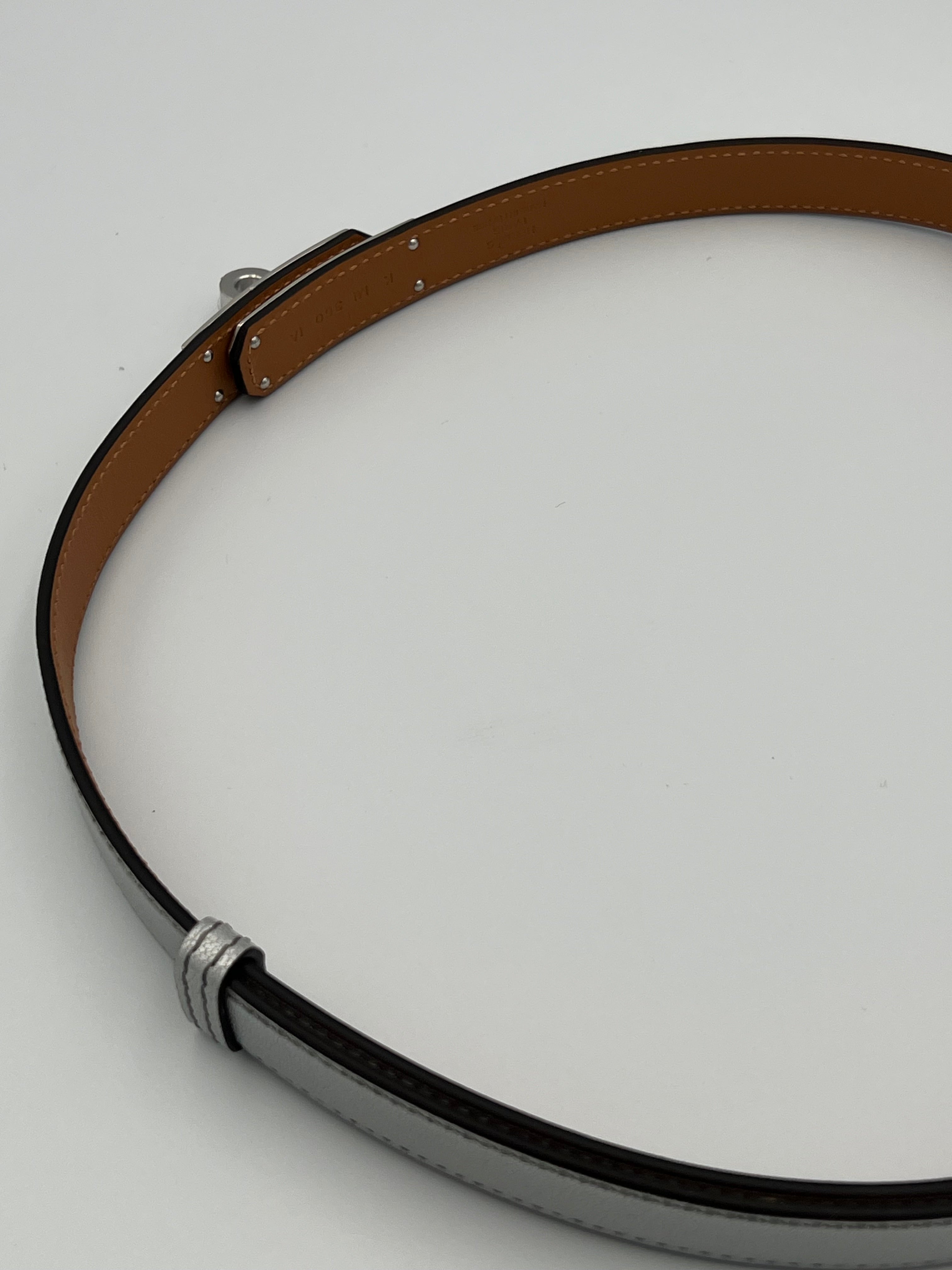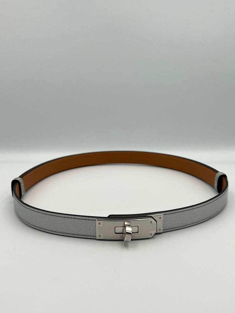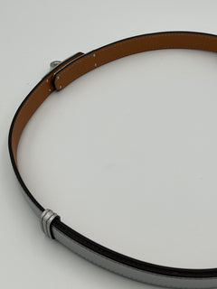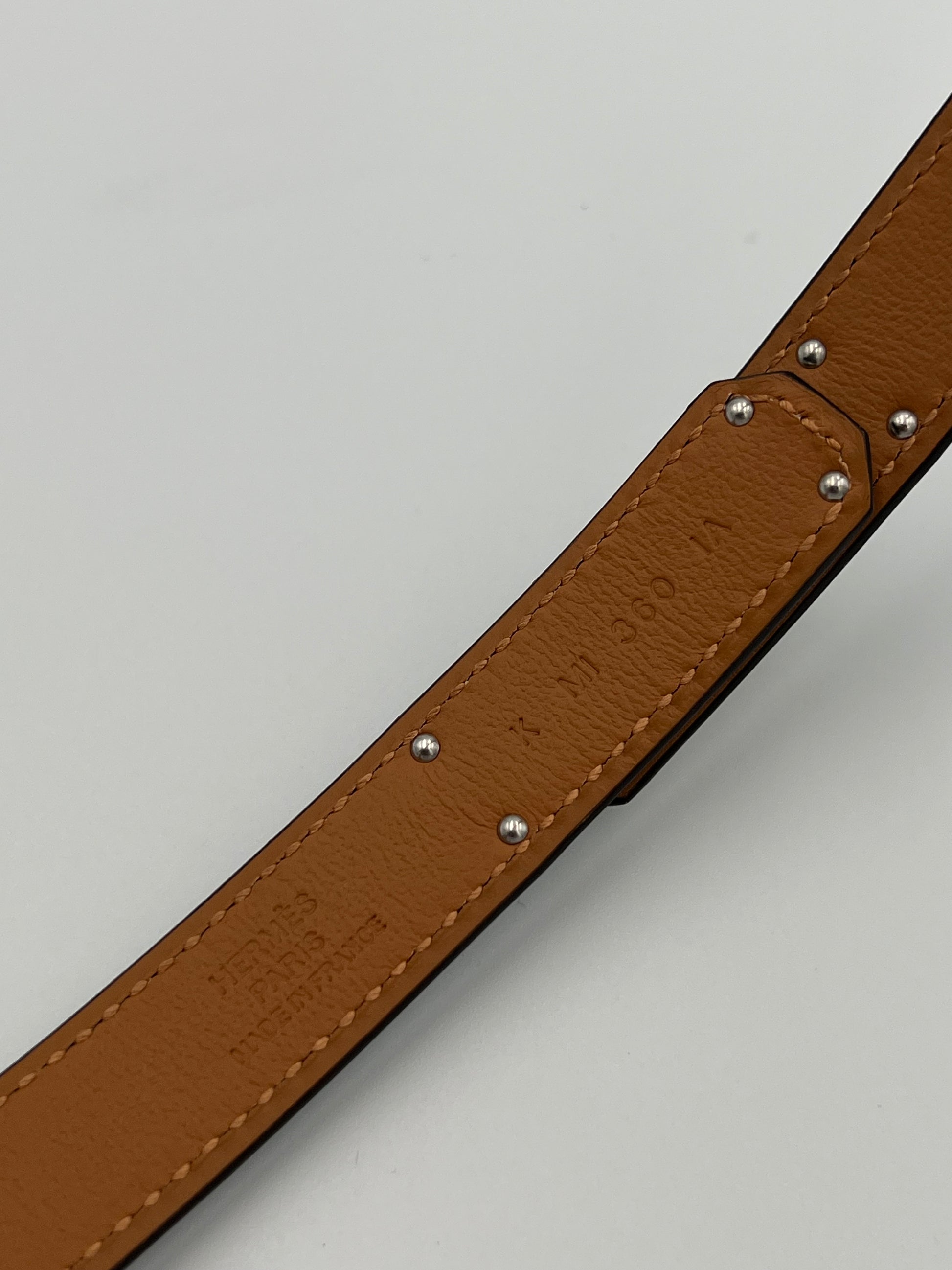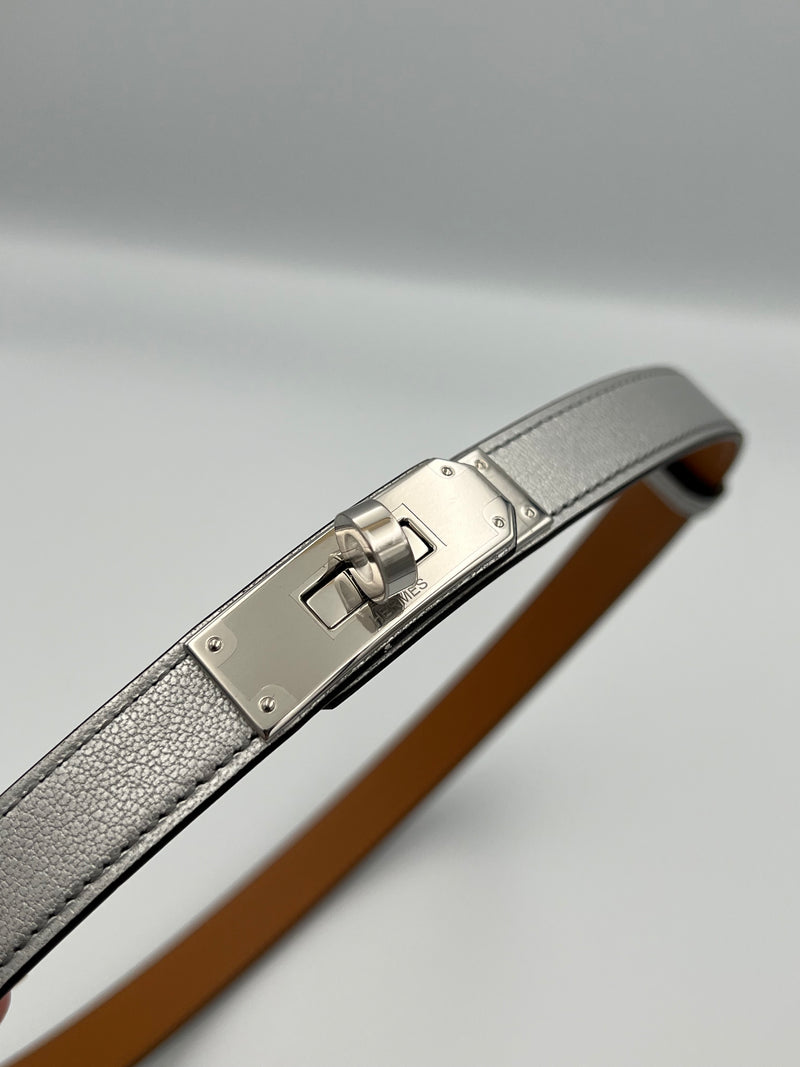 Es un cinturón con la icónica silueta Kelly. Está elaborado en cuero premium con la característica hebilla Kelly en metal pulido, y cuenta con un diseño ajustable de 18 mm de ancho que permite adaptarse perfectamente a la cintura o cadera.