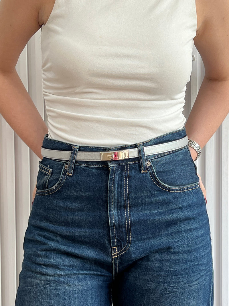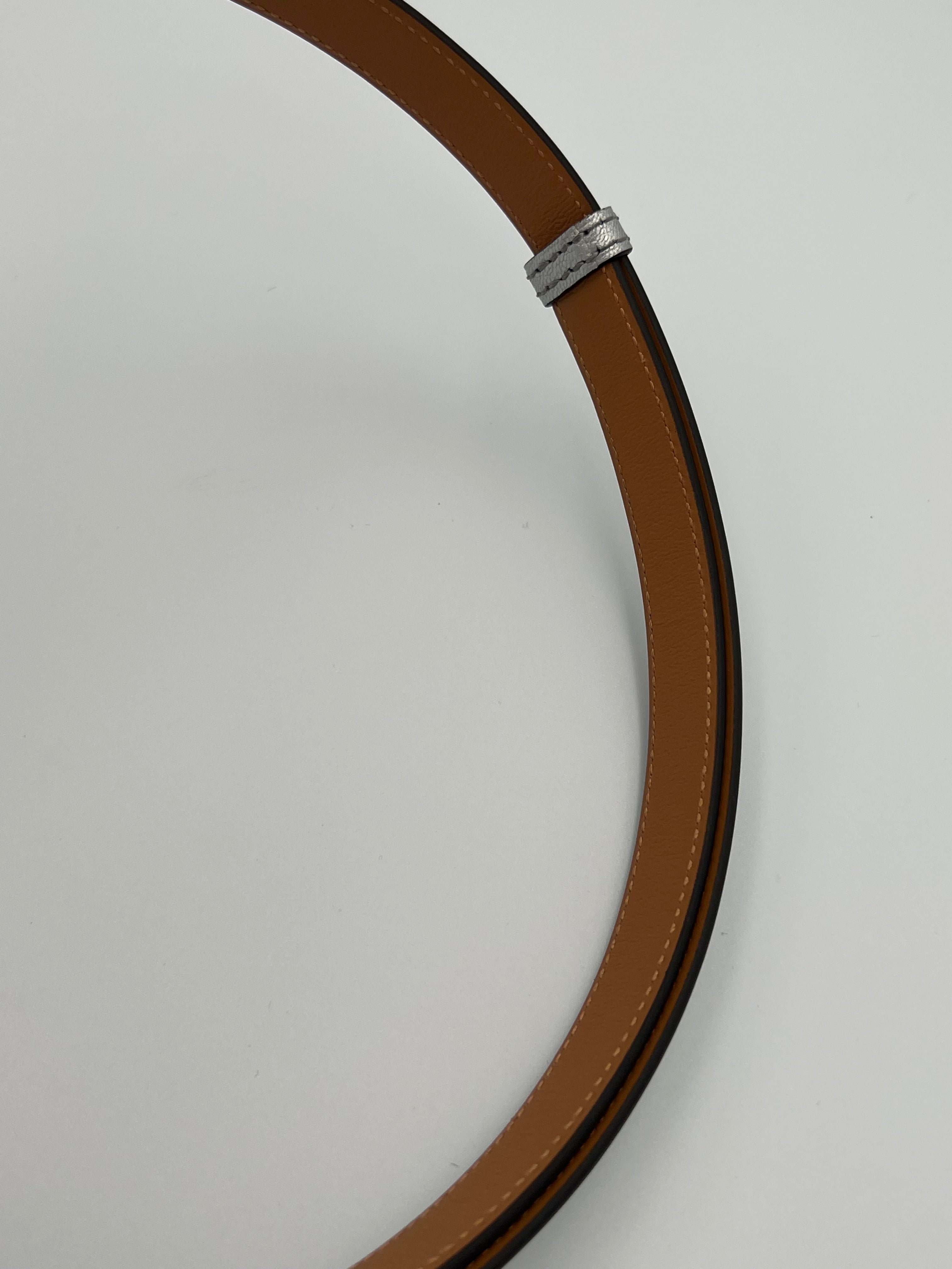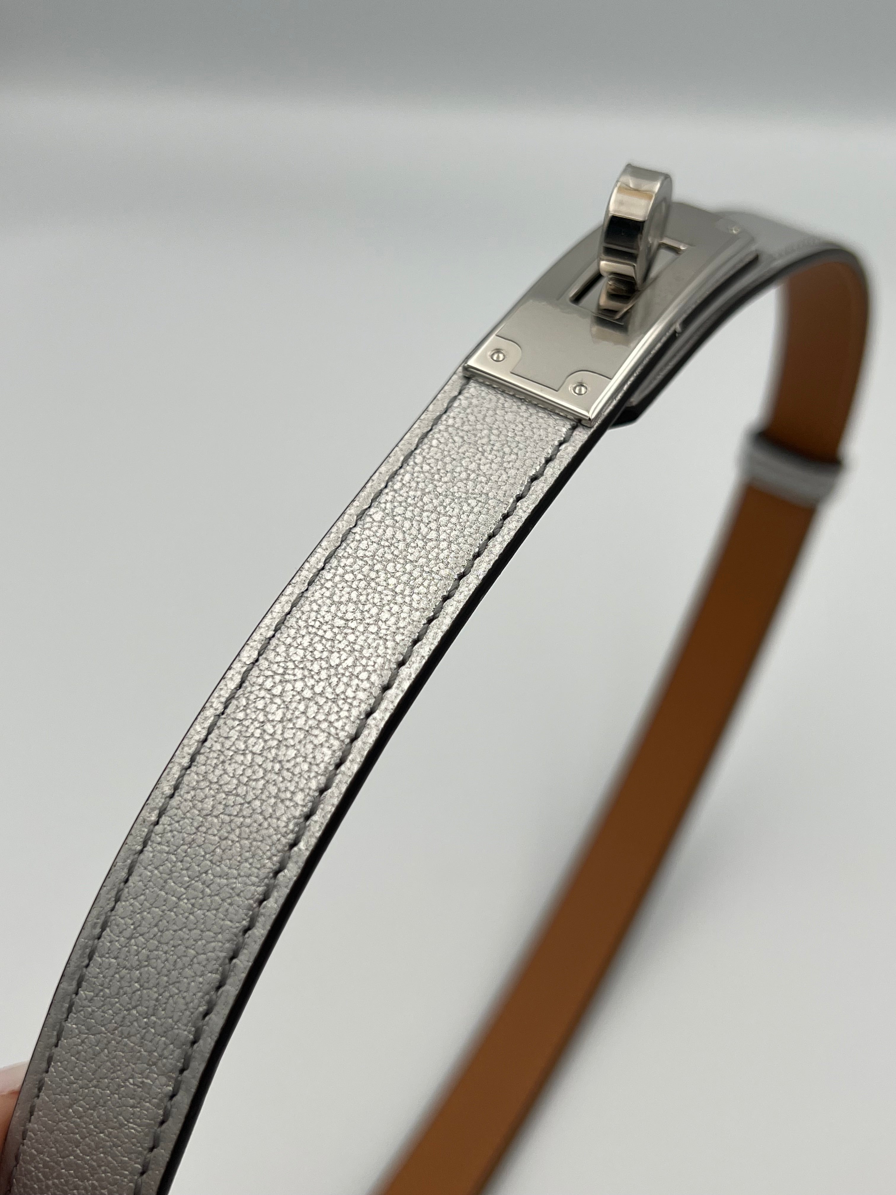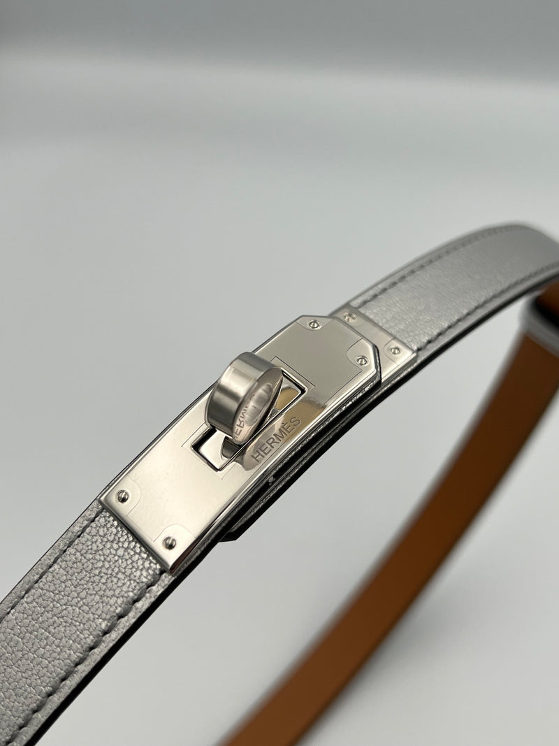 Es un cinturón con la icónica silueta Kelly. Está elaborado en cuero premium con la característica hebilla Kelly en metal pulido, y cuenta con un diseño ajustable de 18 mm de ancho que permite adaptarse perfectamente a la cintura o cadera.