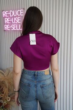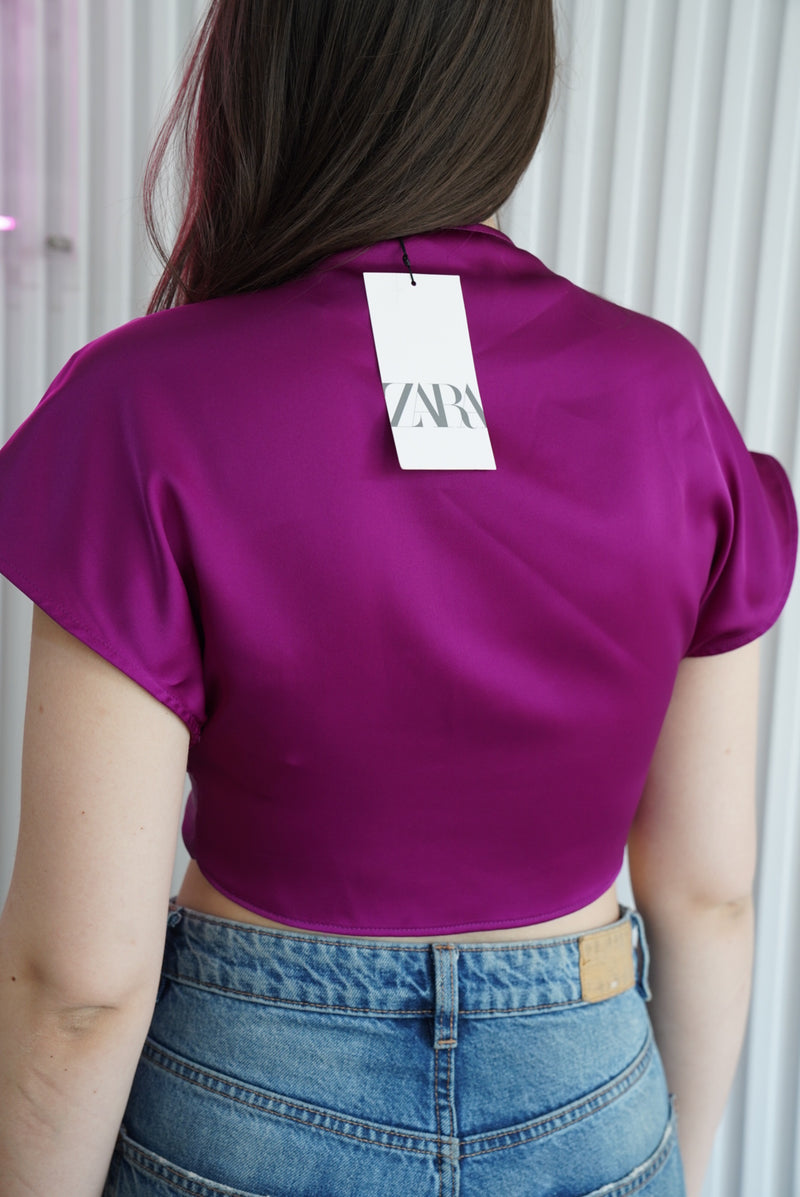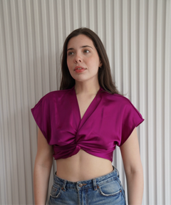 Este crop top de manga cortas tiene un diseño diferente de un nudo en la parte frontal.