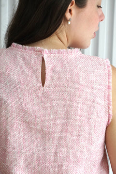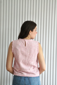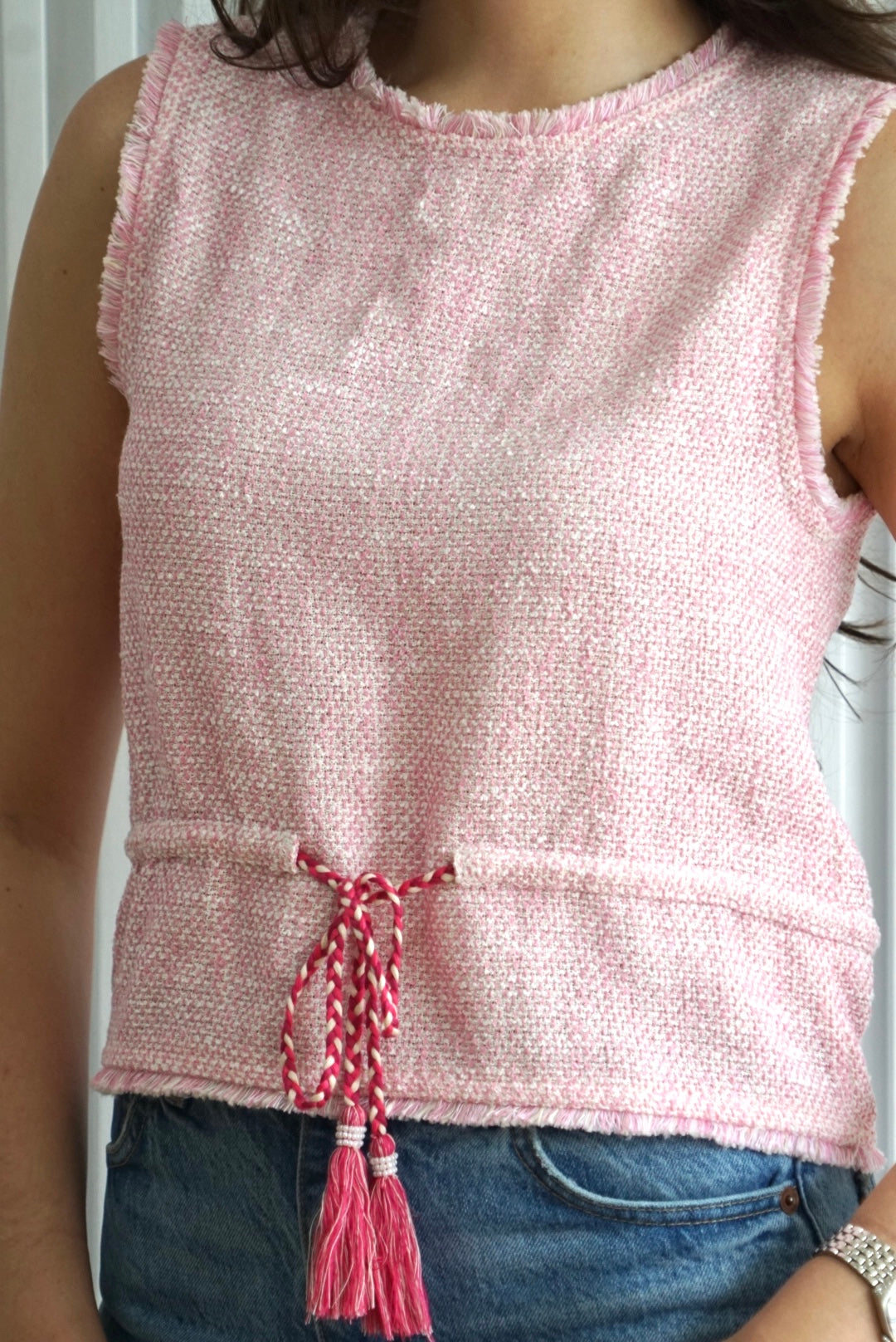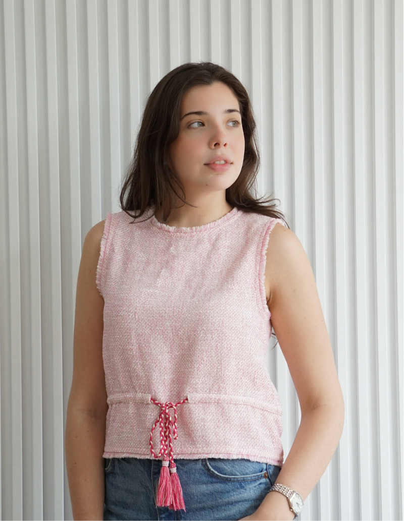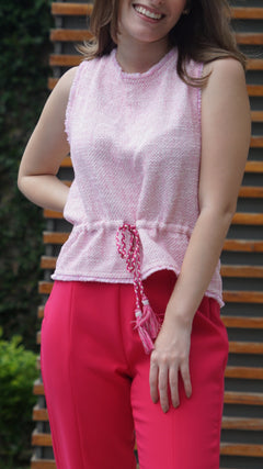 Top elaborado en lana con diferentes tonos de rosado, sin mangas. Cuenta con un cordón en la cintura.