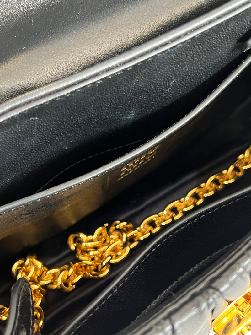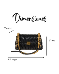 Está confeccionada en cuero de cordero con el icónico acolchado matelassé de la marca. Su diseño está combinado con herrajes metálicos dorados. Cuenta con cadena para llevarla como crossbody y al hombro.