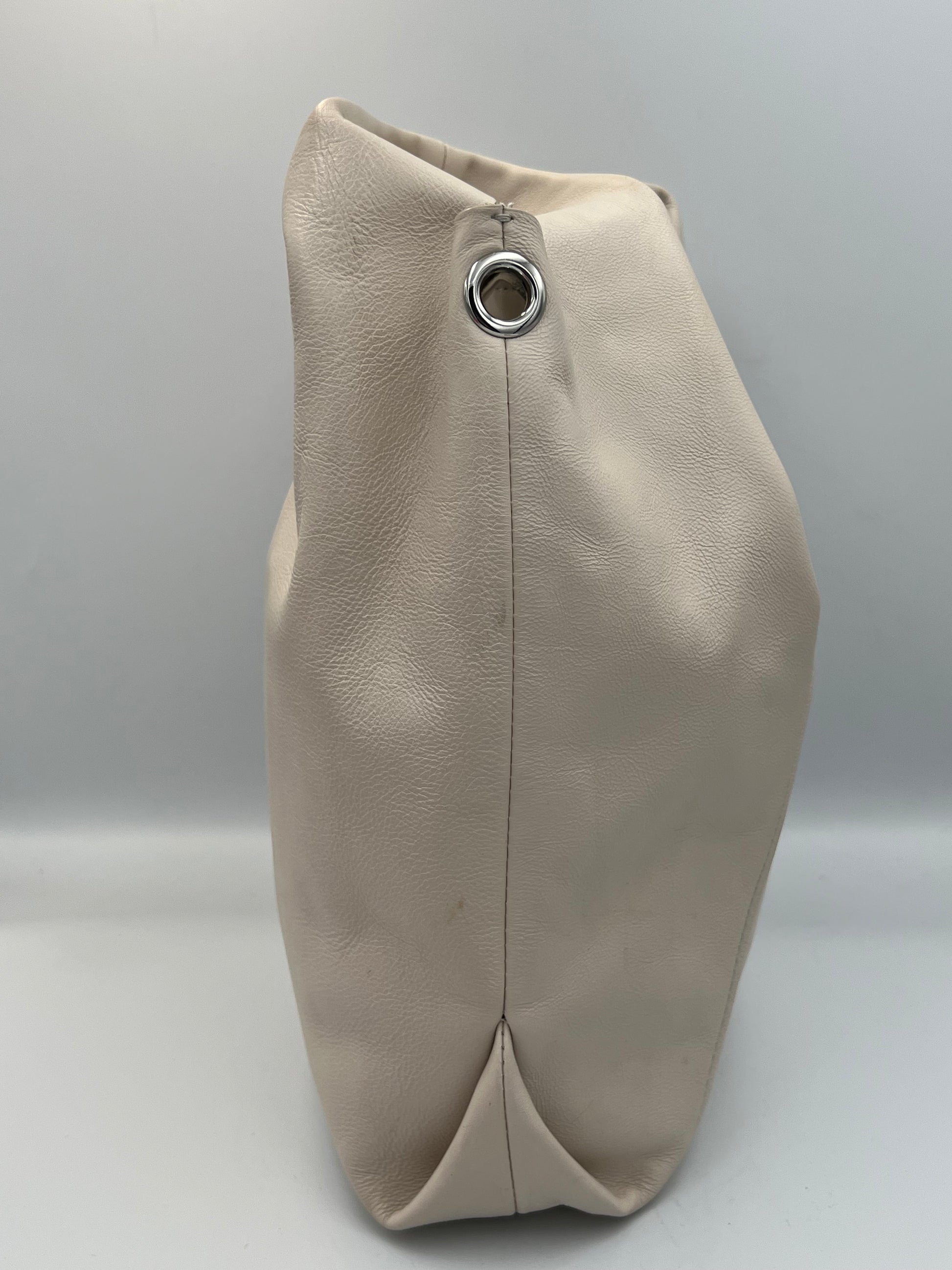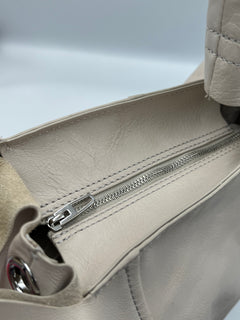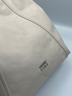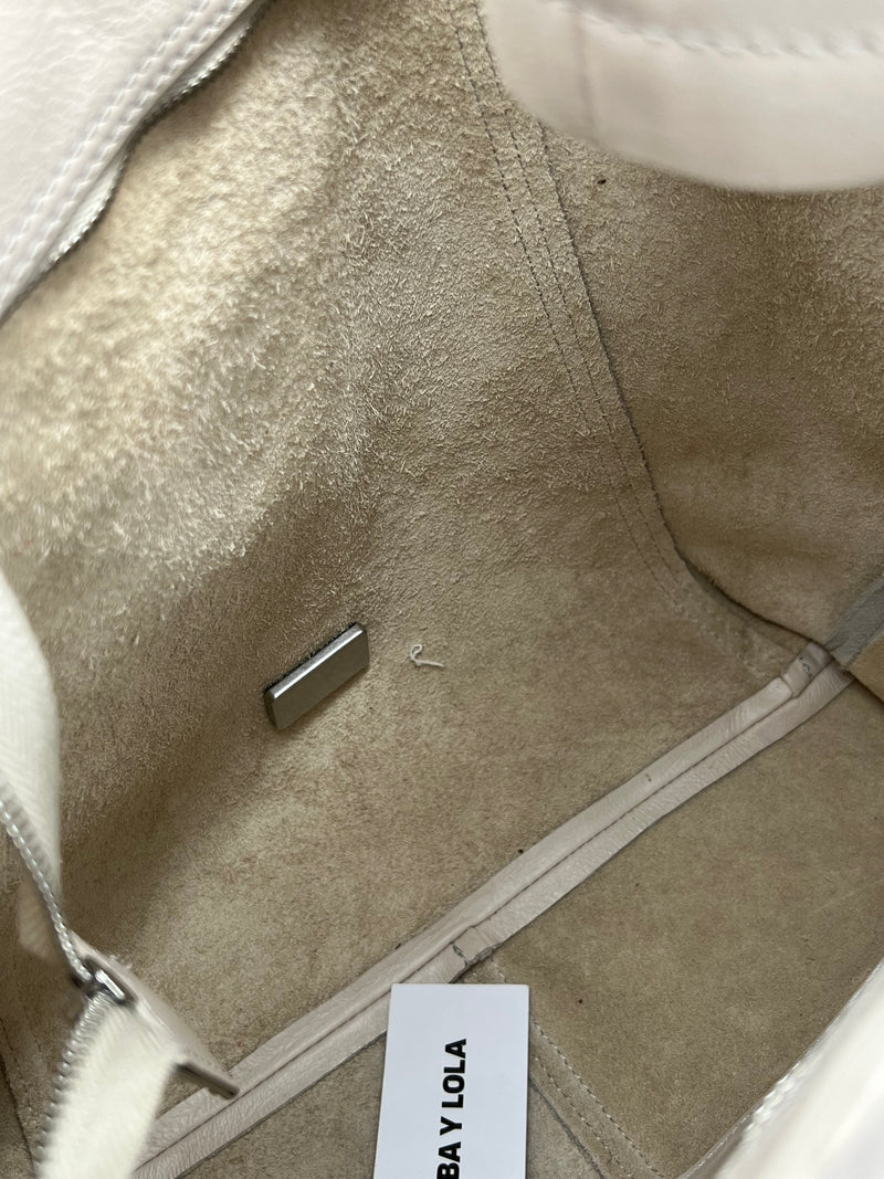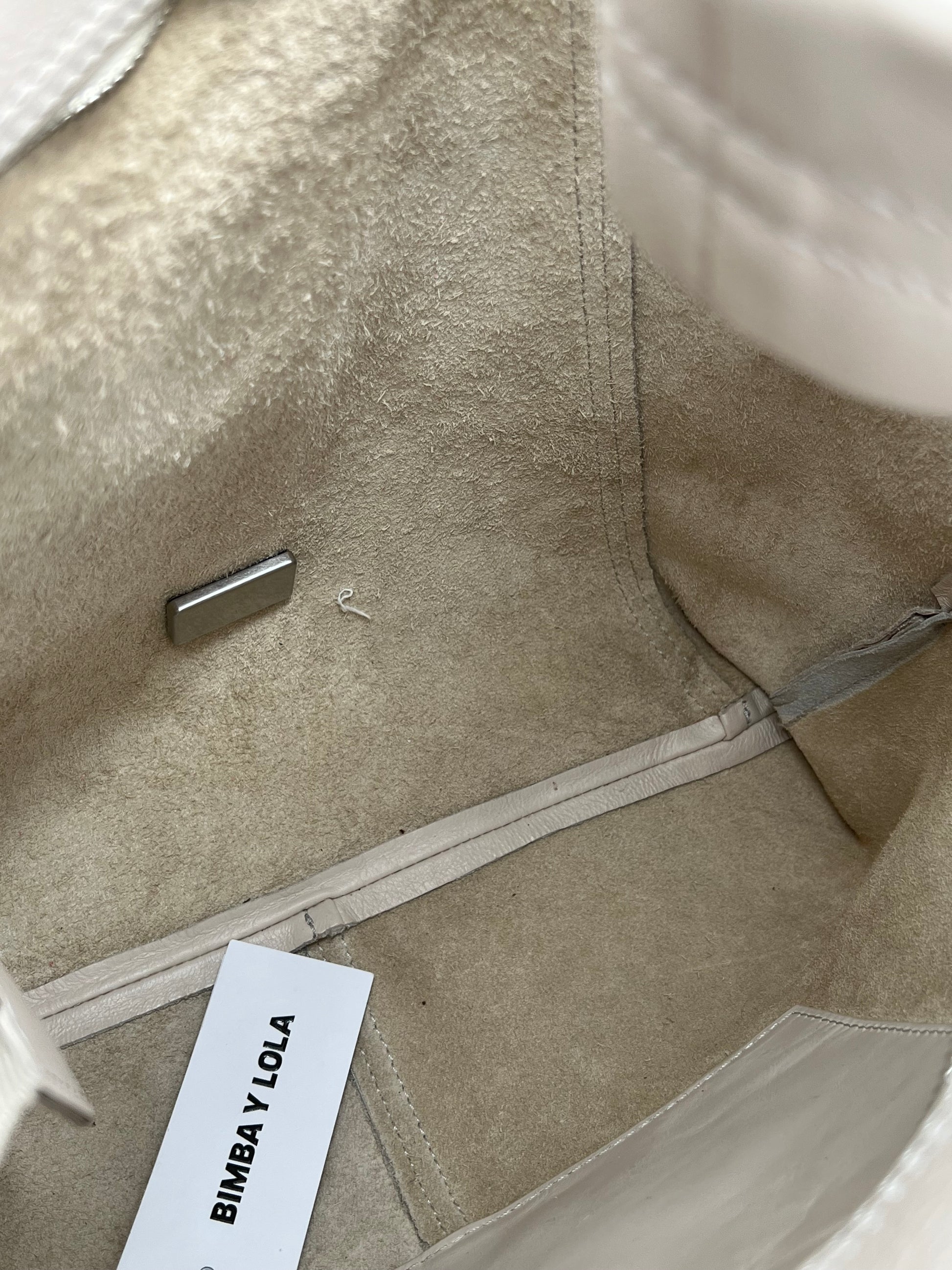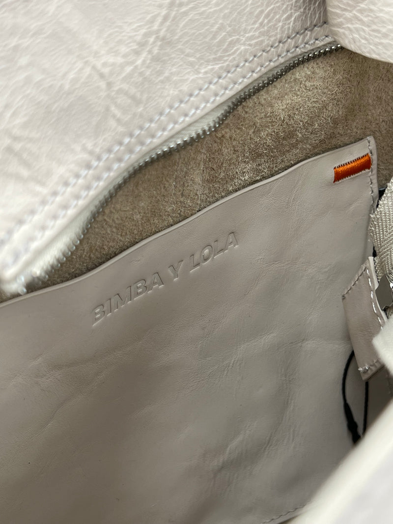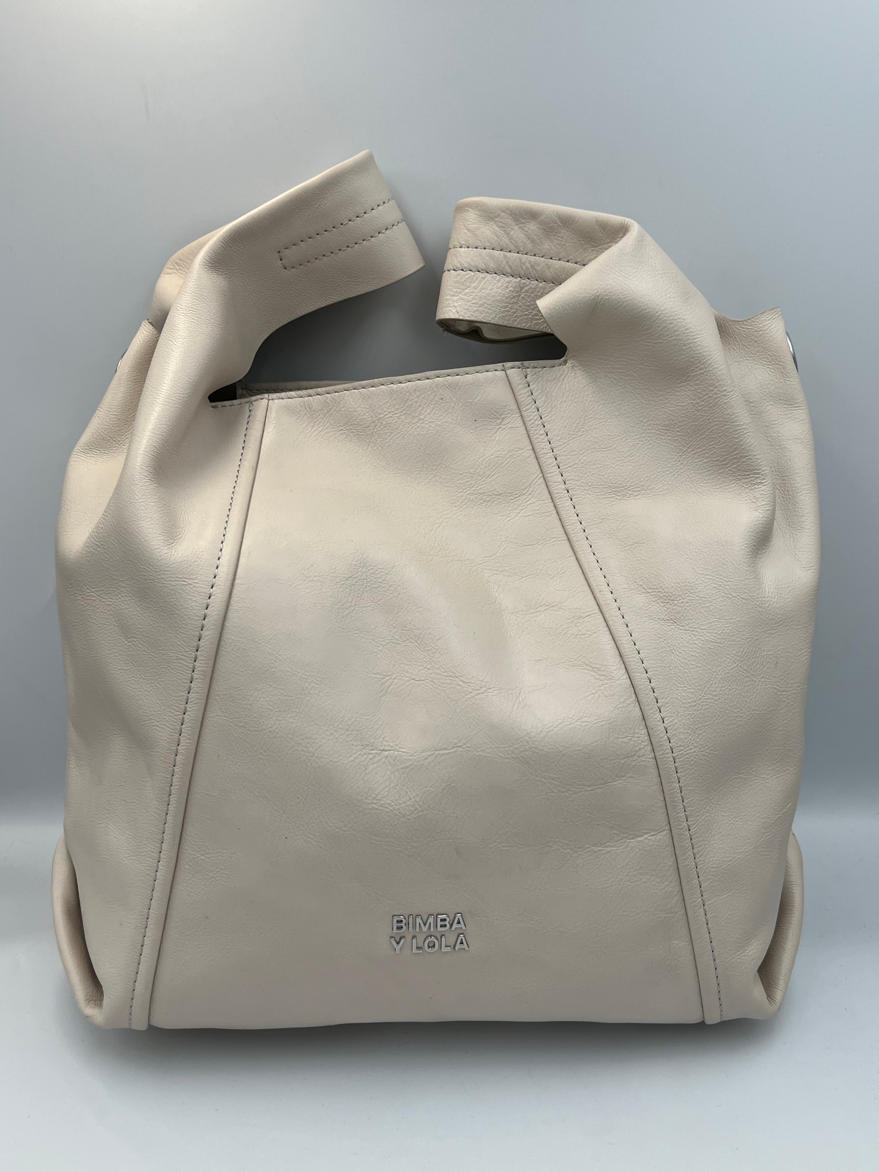 es un bolso tote de tamaño medio con exterior en piel auténtica de estructura suave, acabado elegante y el logo metálico de BIMBA Y LOLA en el frente para un toque distintivo. Cuenta con asa superior y correa desmontable para llevar al hombro o cruzado, cierre con cremallera y un interior espacioso con bolsillo interno para organizar pequeños objetos.