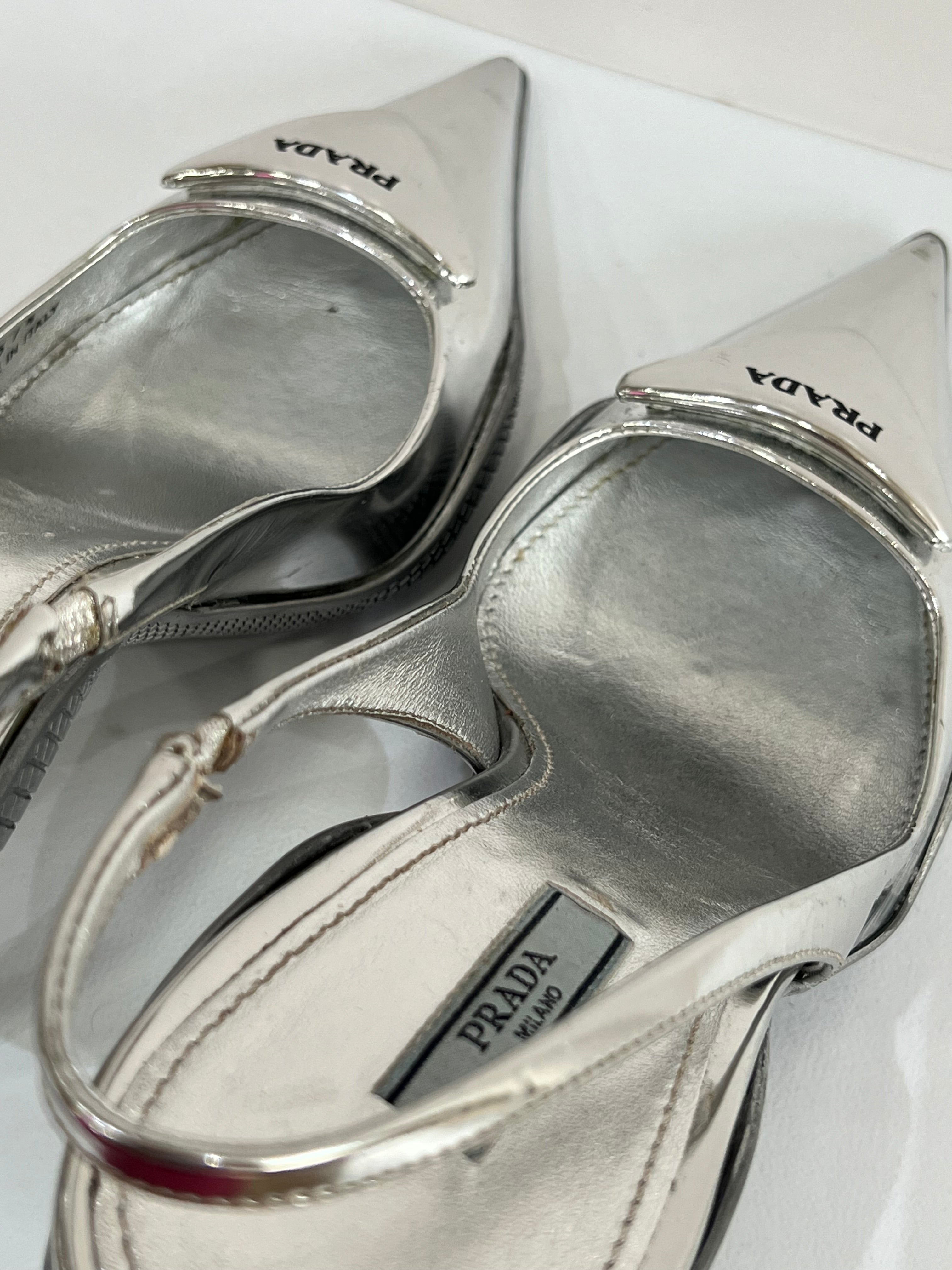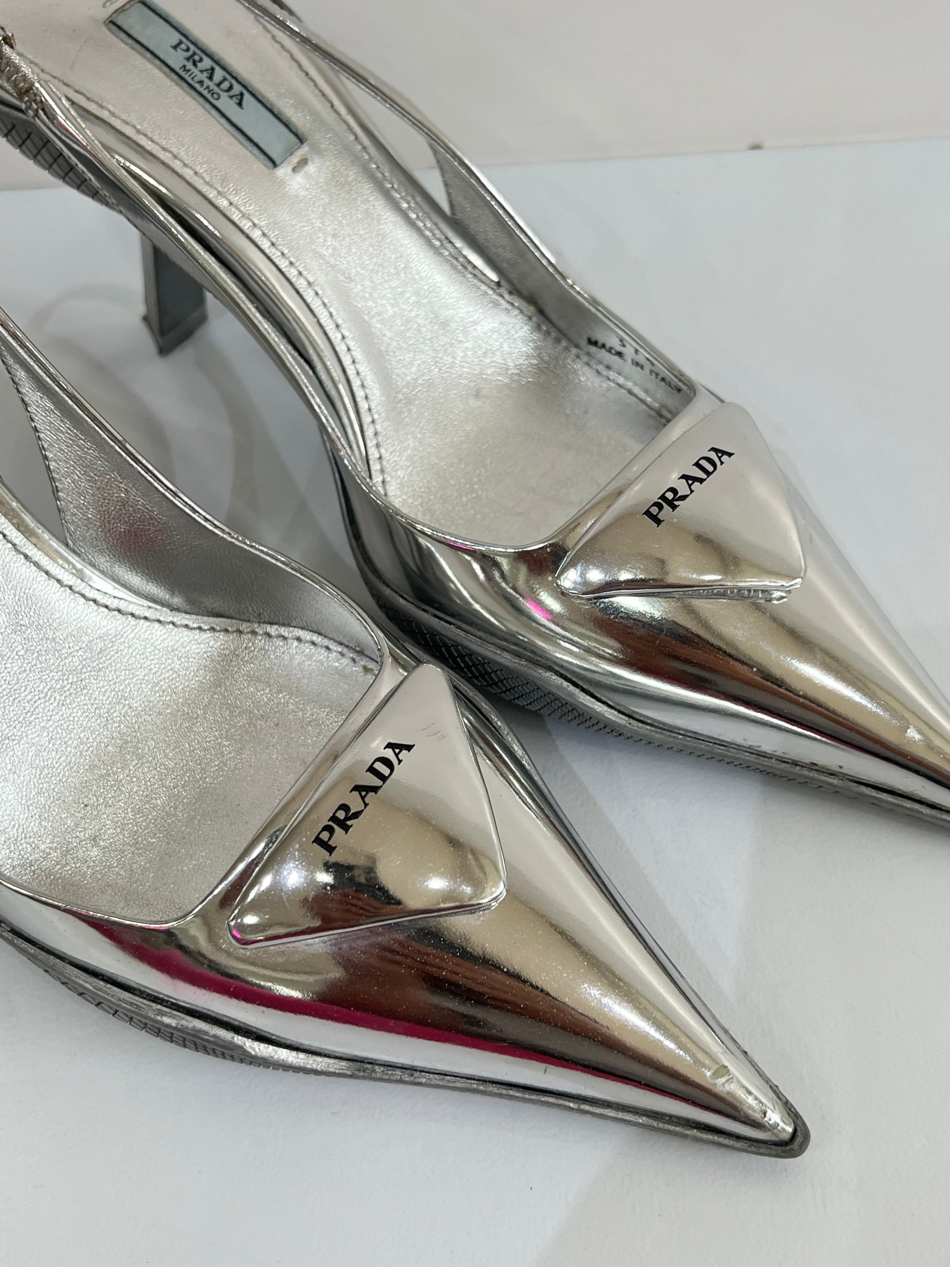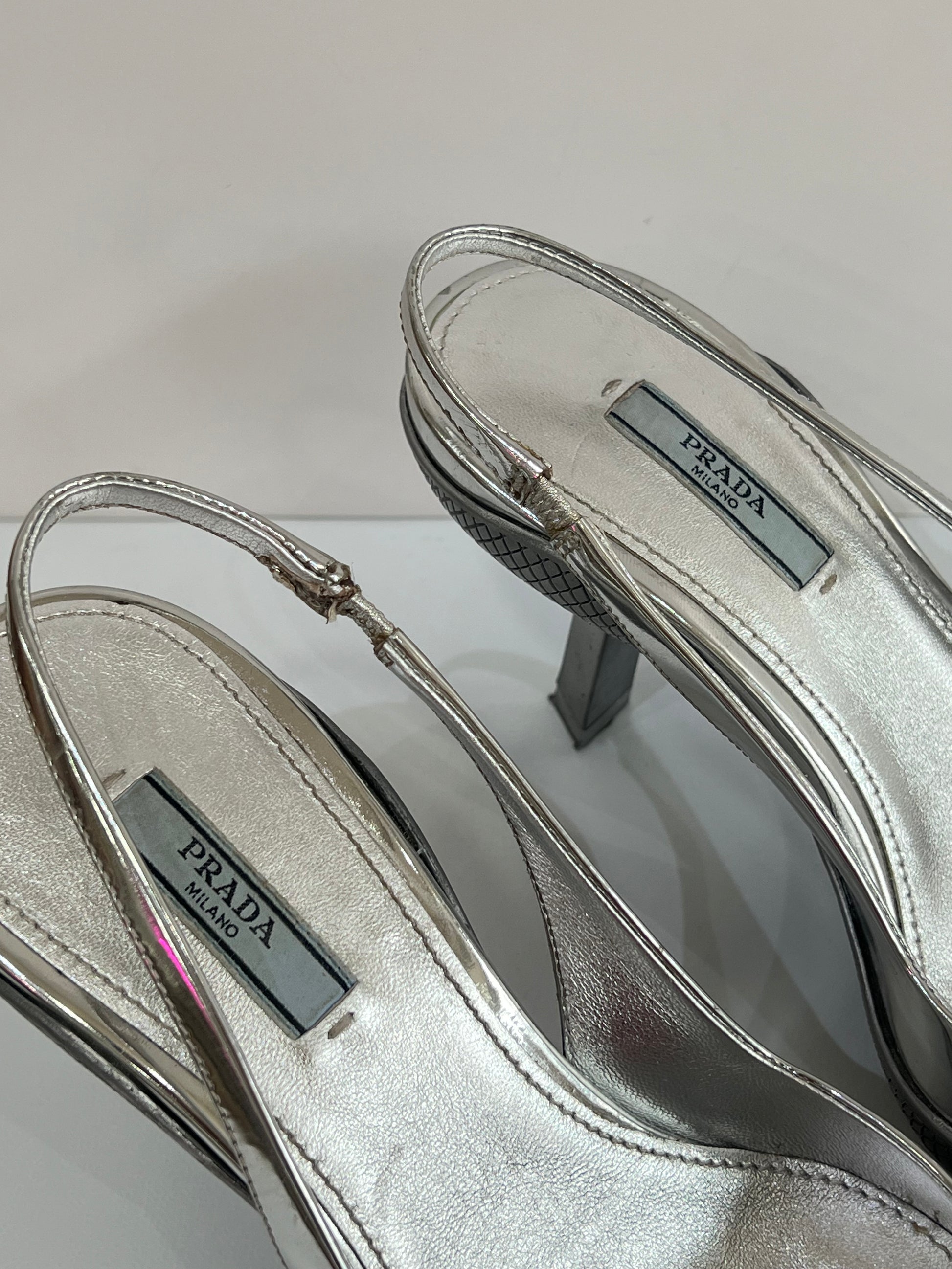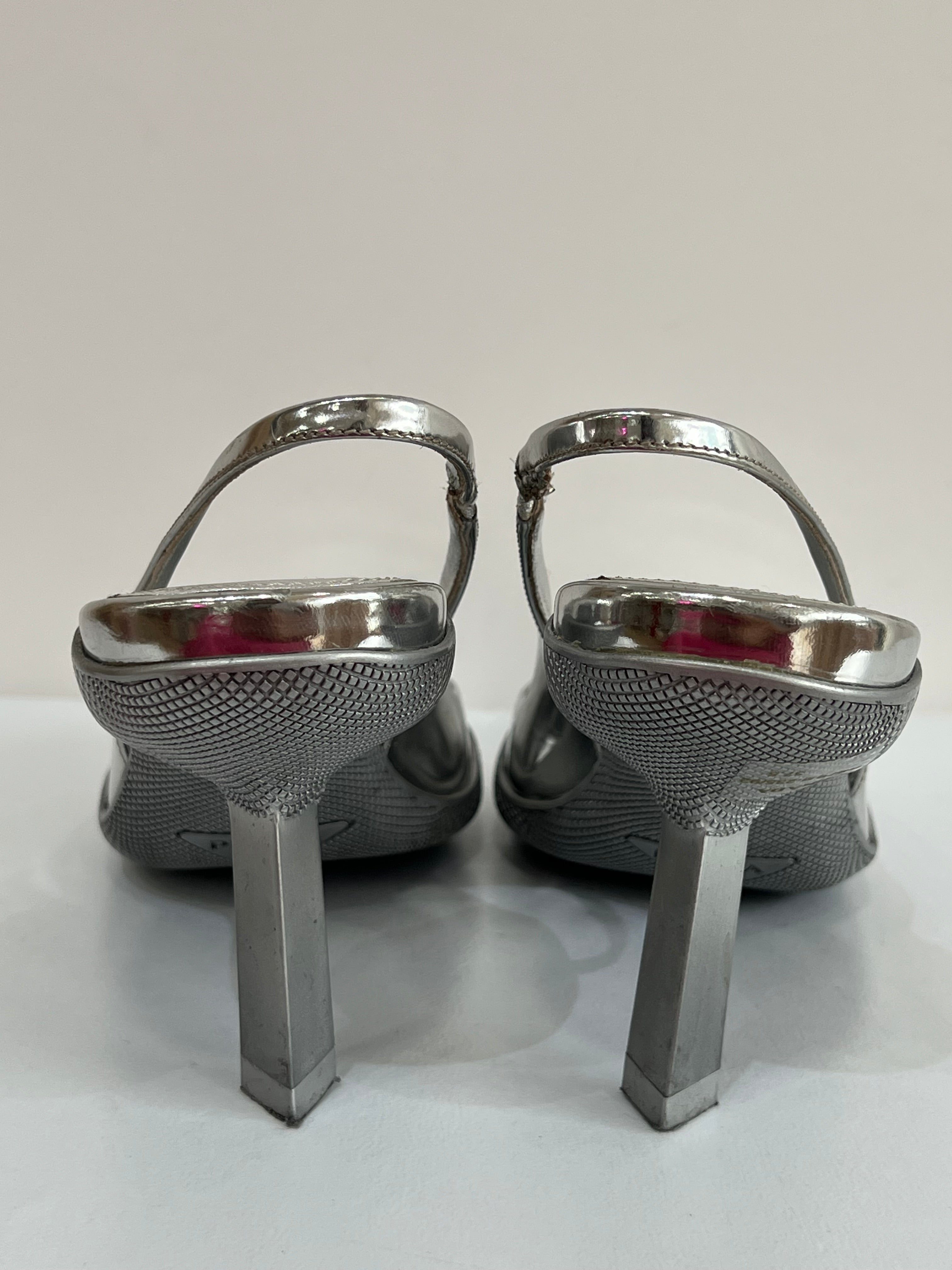 Zapatos de tacón slingback, plateados con acabado metálico. La parte de slingback cuenta con una tira stretch . Su suela es de goma.