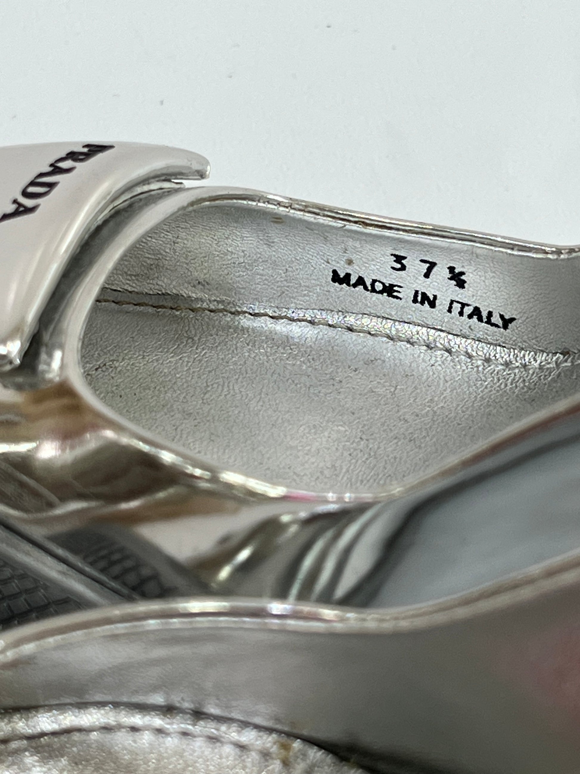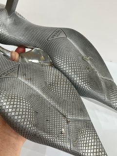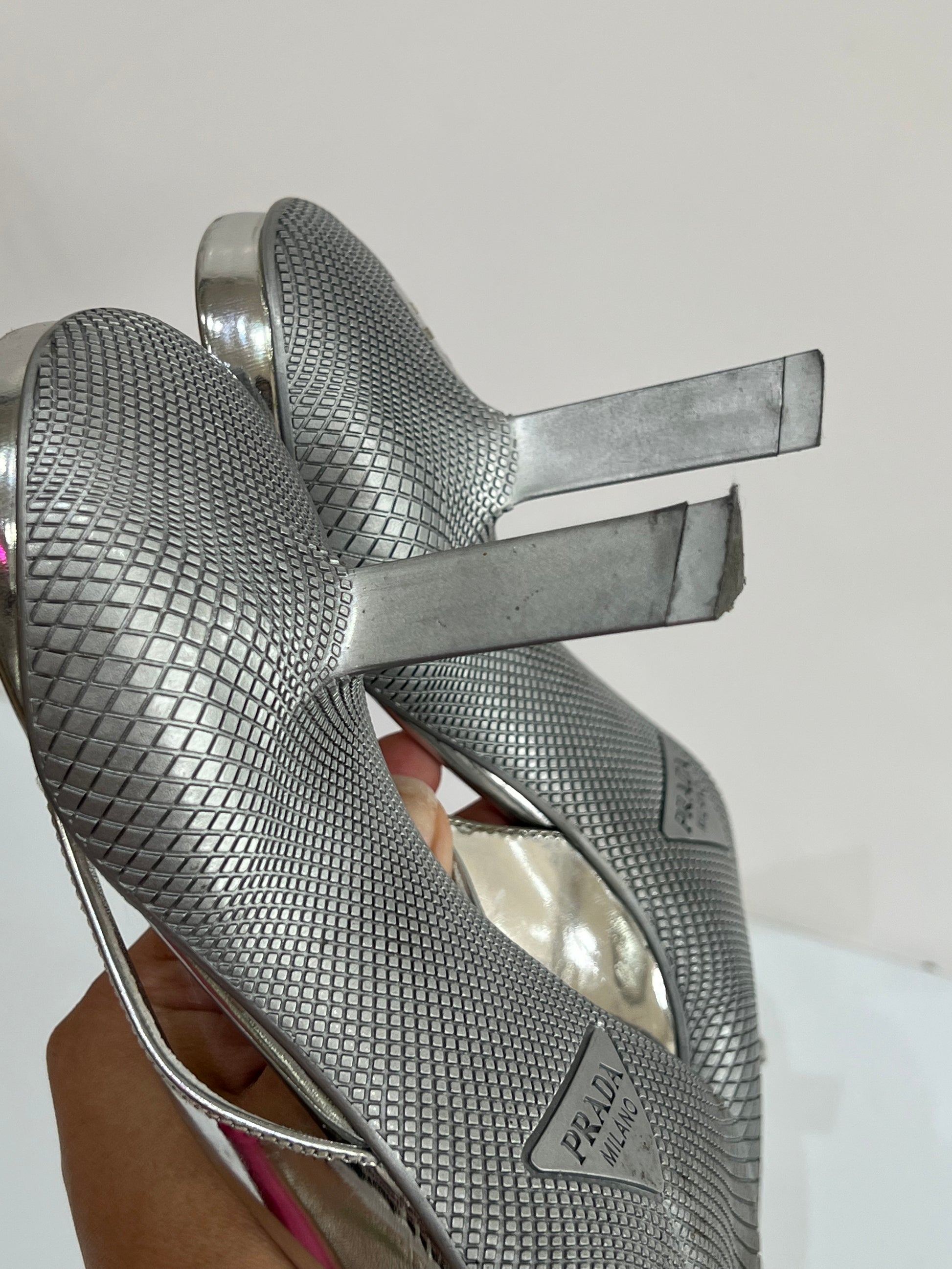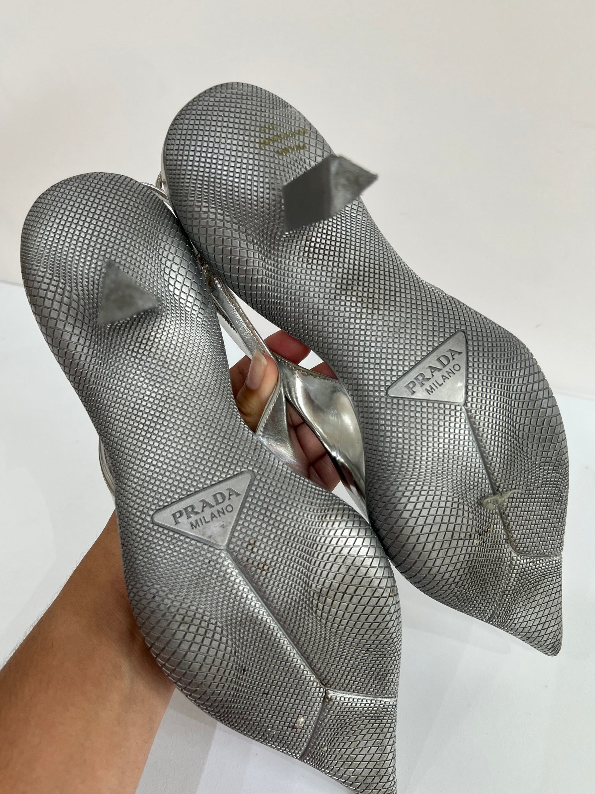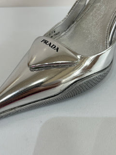 Zapatos de tacón slingback, plateados con acabado metálico. La parte de slingback cuenta con una tira stretch . Su suela es de goma.
