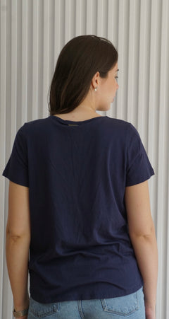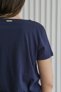 Blusa azul marino con cuello V y con detalle de cintas cruzadas en el cuello. Cómoda e ideal para usar de noche o de día como outfit casual.