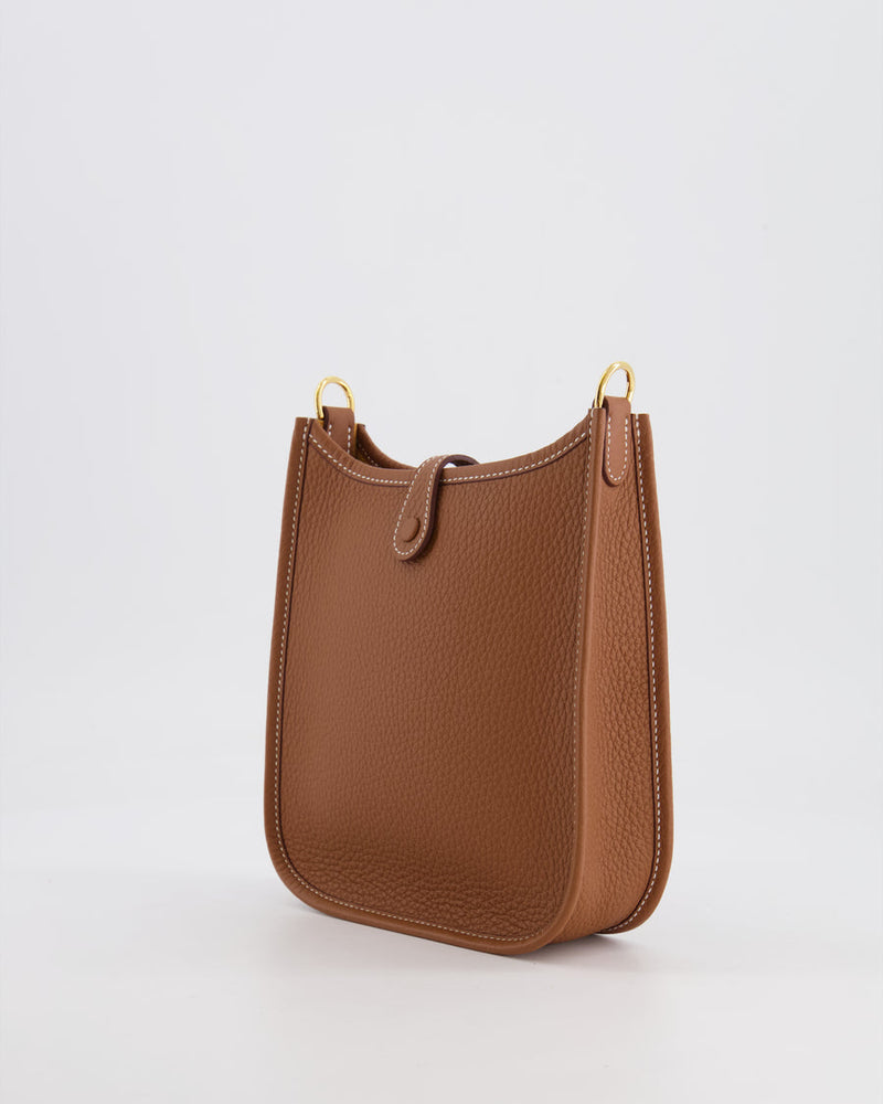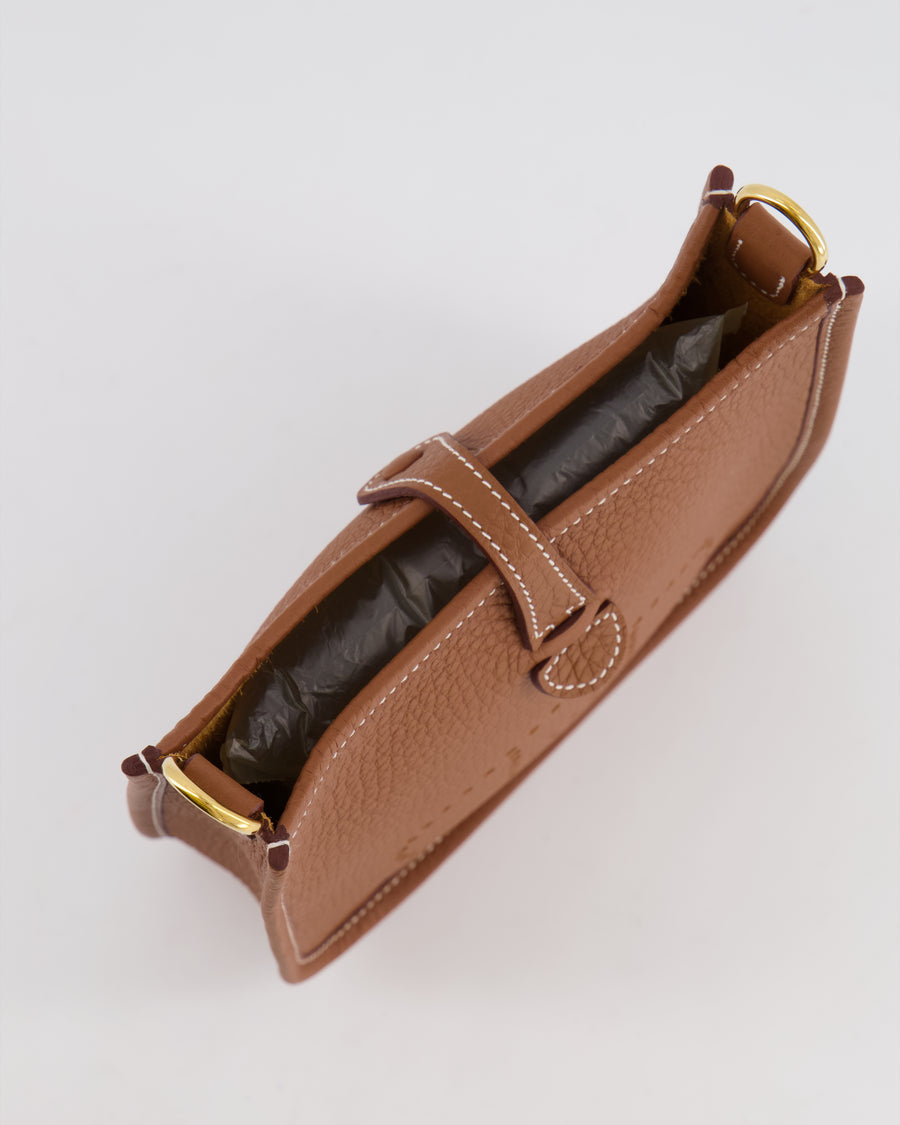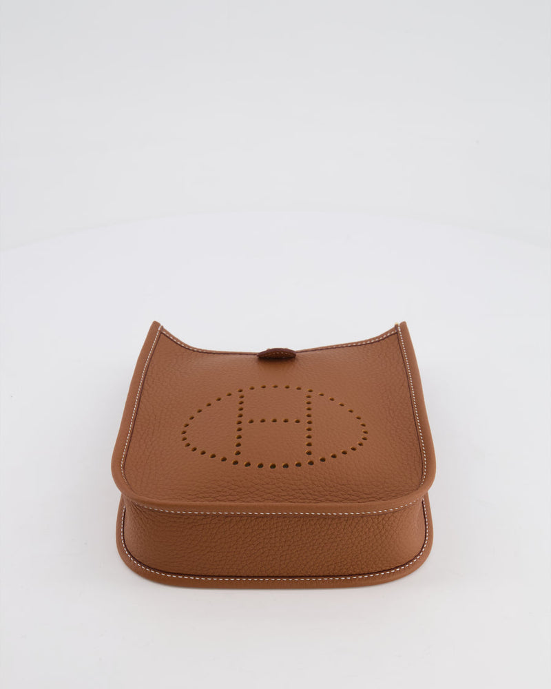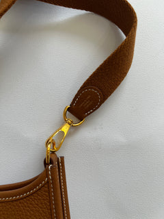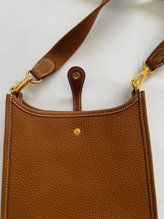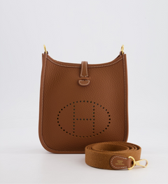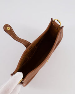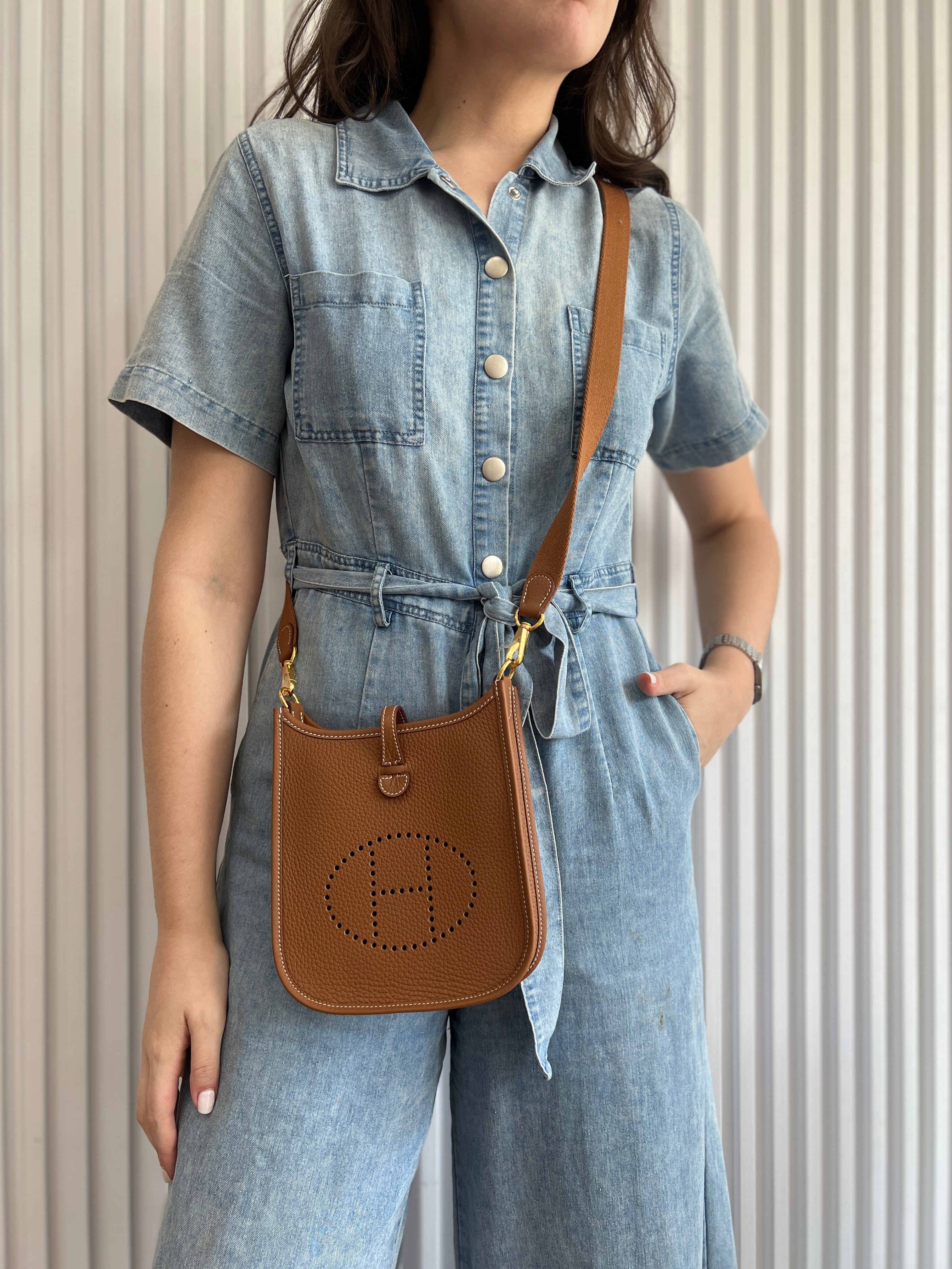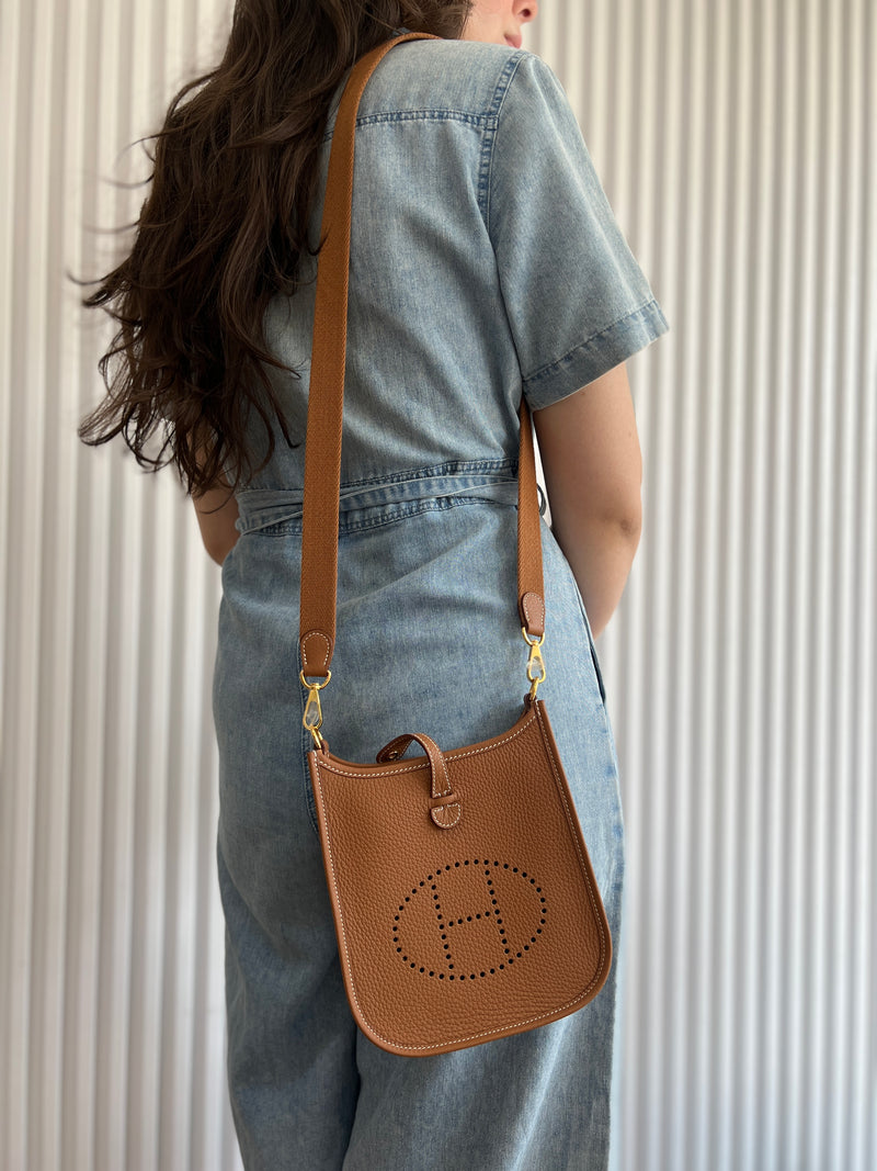 Esta crossbody bag está elaborada en cuero y cuenta con un diseño perforado en forma de 'H' en la parte frontal. Incluye una correa de canvas desmontable y un cierre de botón. Viene en color café con herrajes en tono dorado.
