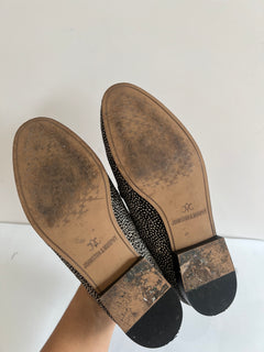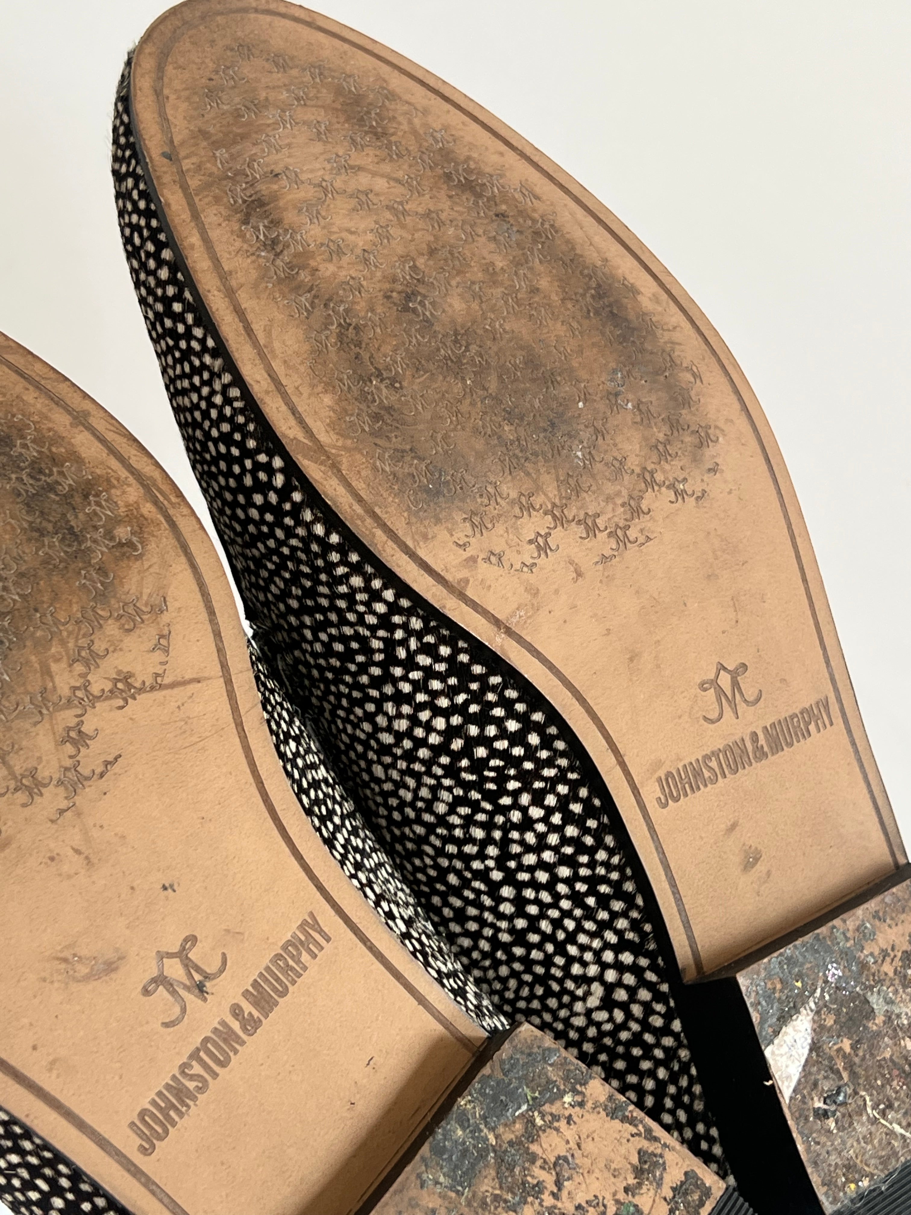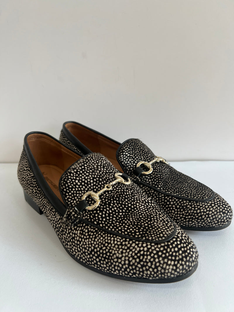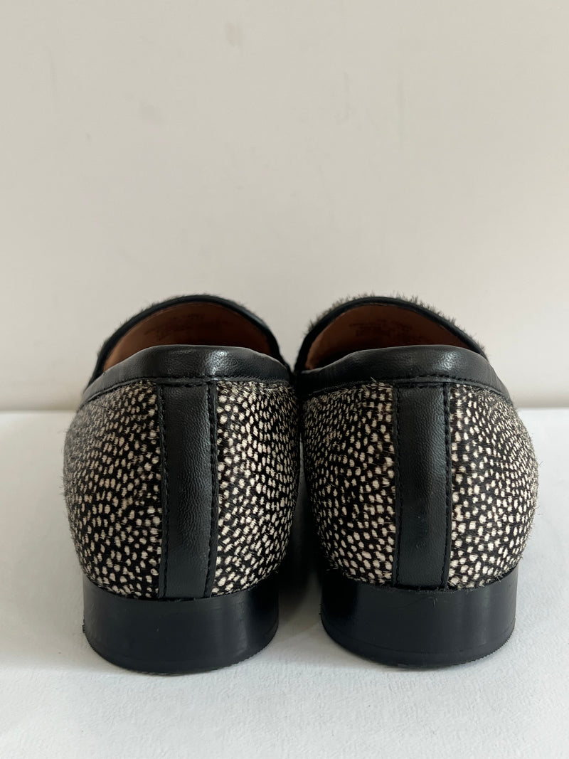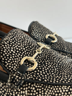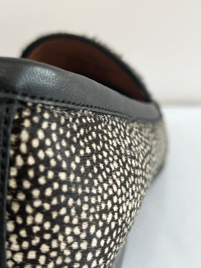 Mocasines en haircalf con estampado moteado en blanco y negro, diseño de punta redonda, detalle metálico tipo herraje en el empeine y suela plana de cuero.