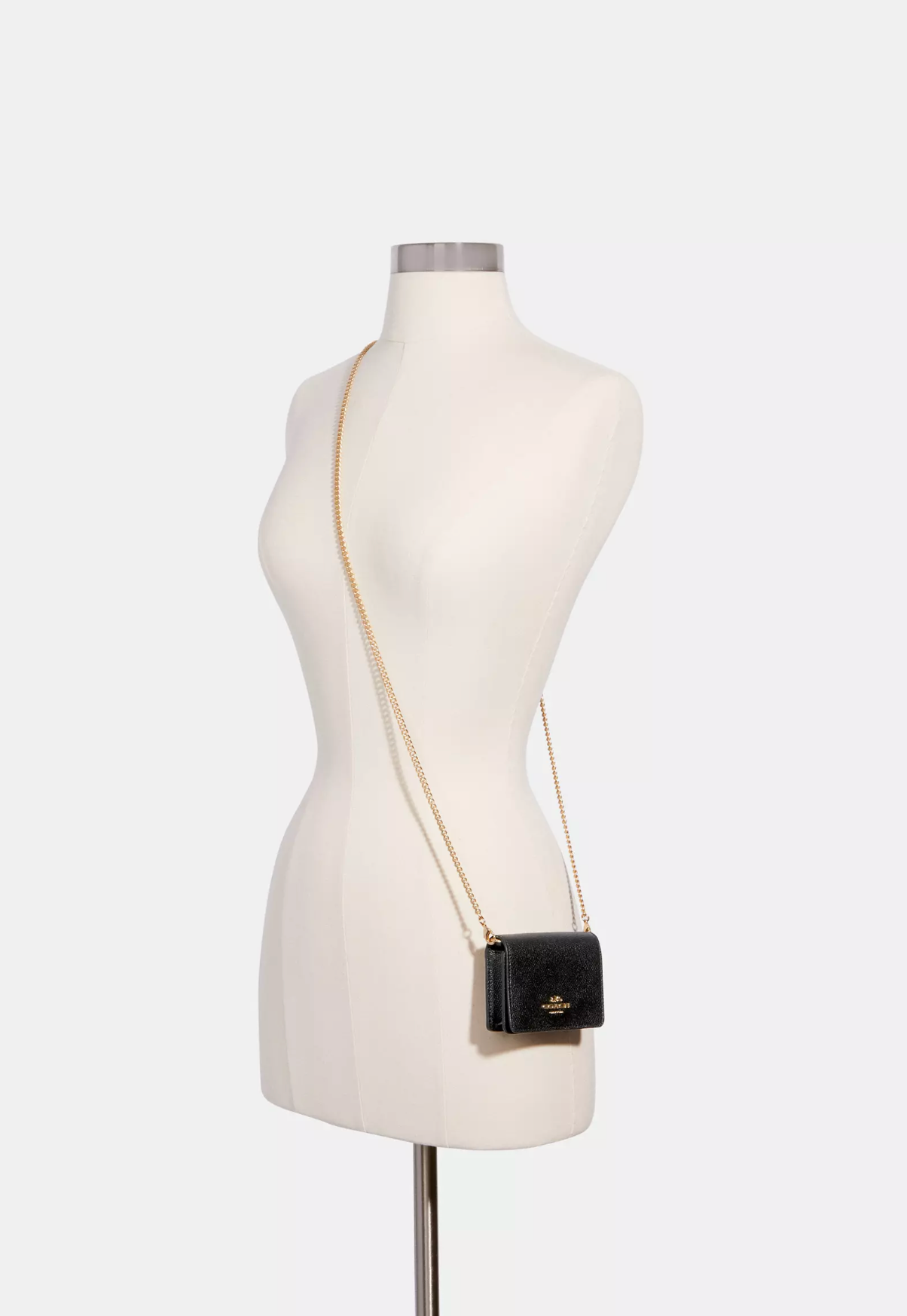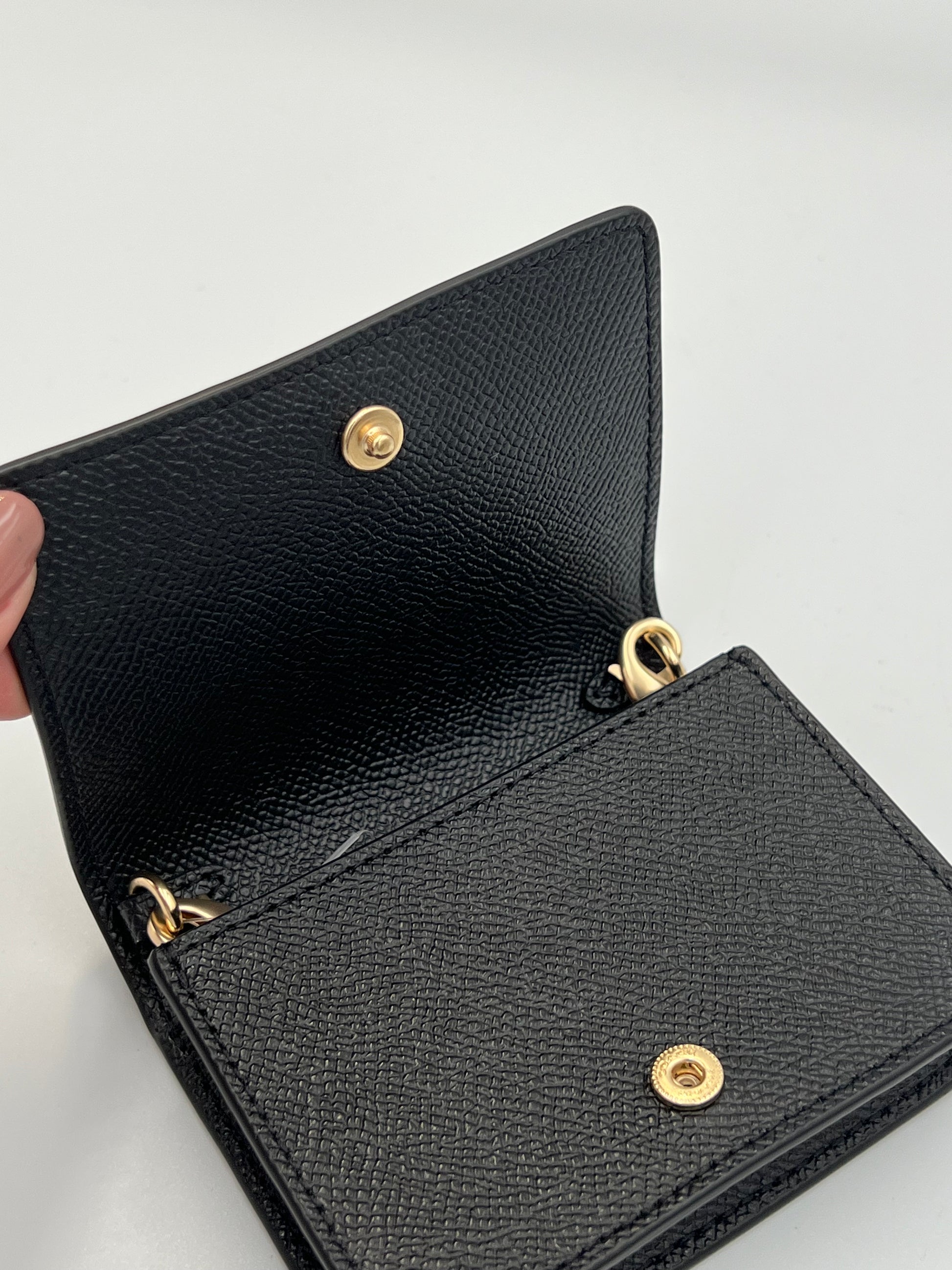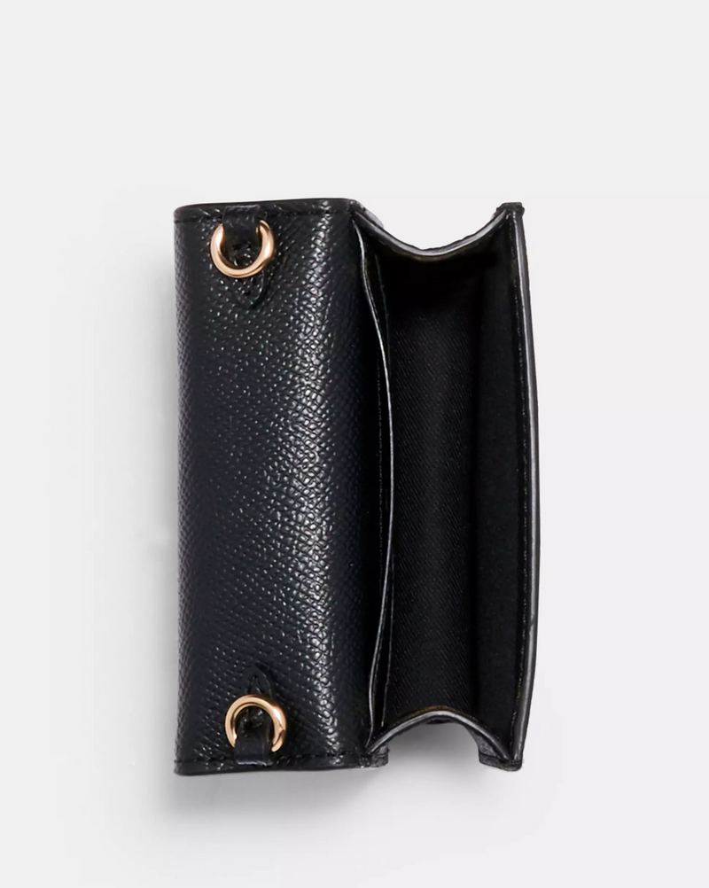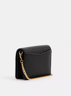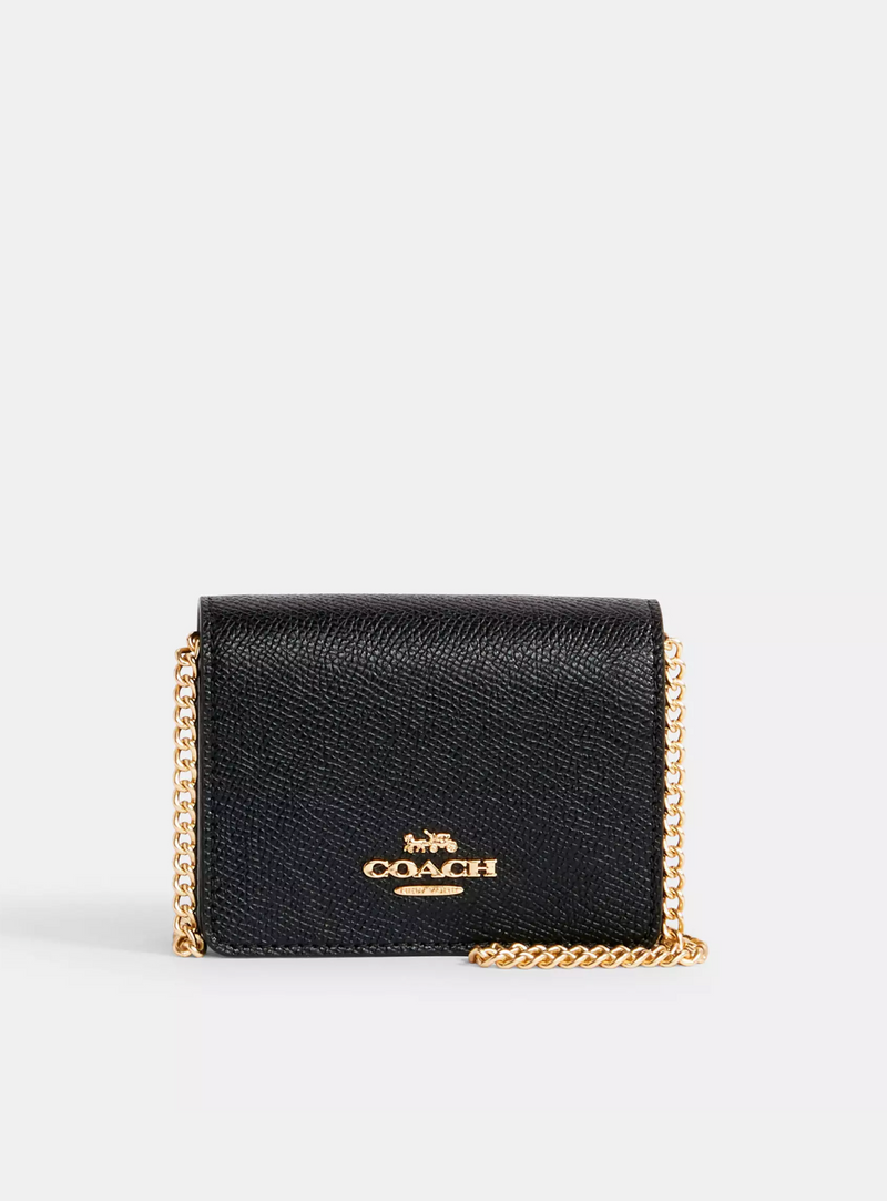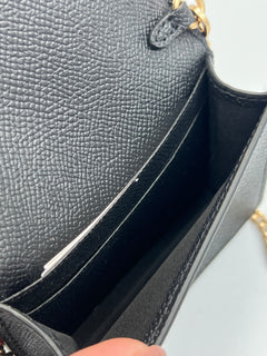 bolso mini con correa de cadena desmontable. Su exterior e interior es de cuero granulado. En el exterior hay un bolsillo abierto de acceso rápido, y en el interior tiene dos ranuras para tarjetas y cierre con broche.