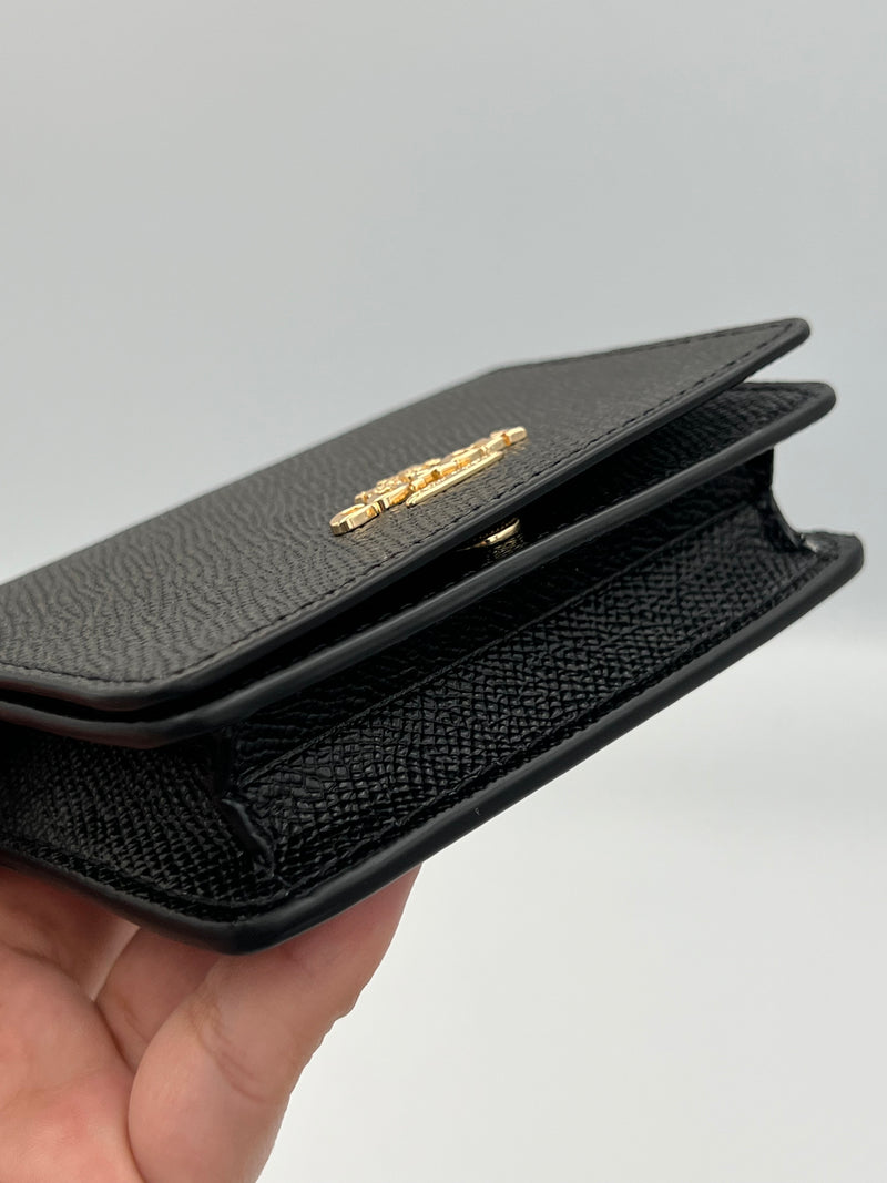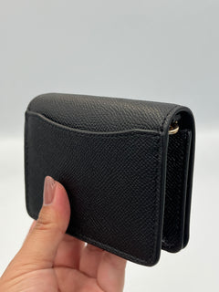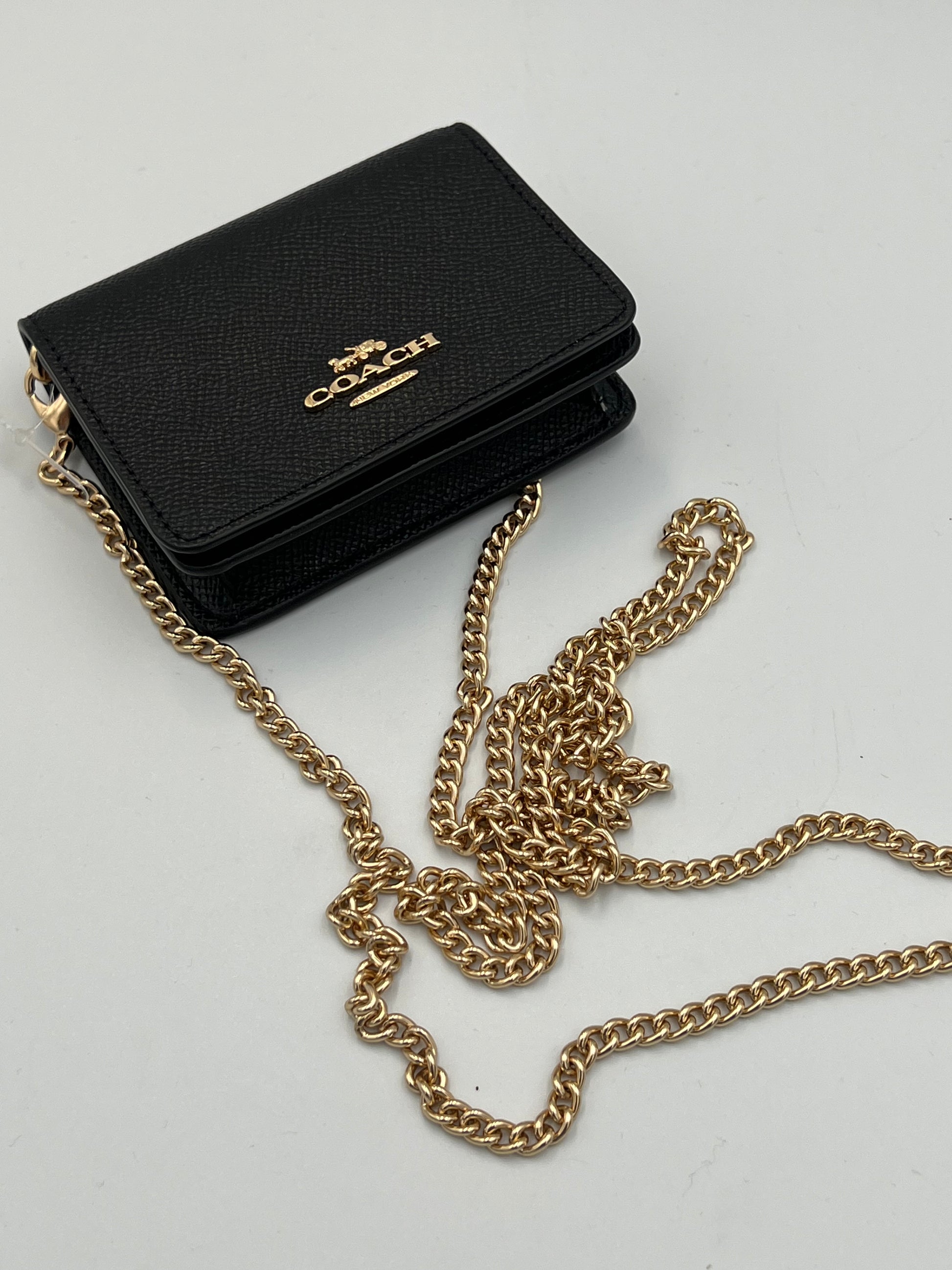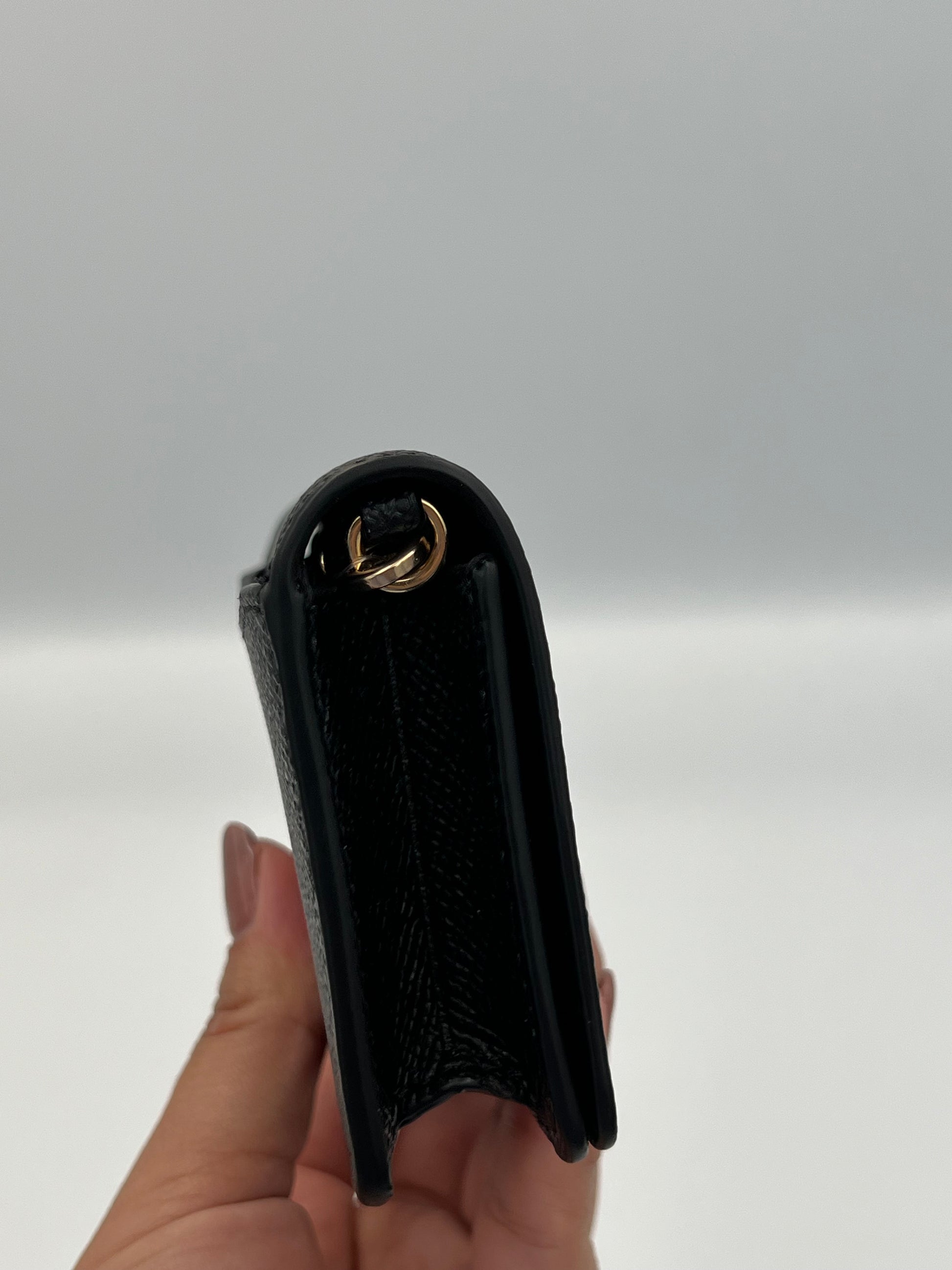 bolso mini con correa de cadena desmontable. Su exterior e interior es de cuero granulado. En el exterior hay un bolsillo abierto de acceso rápido, y en el interior tiene dos ranuras para tarjetas y cierre con broche.