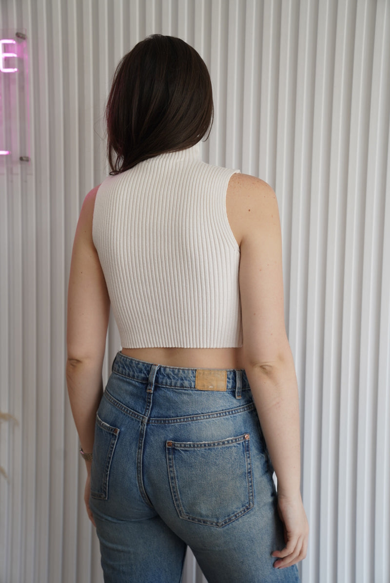 Este crop top tipo sueter de cuello alto y sin mangas.