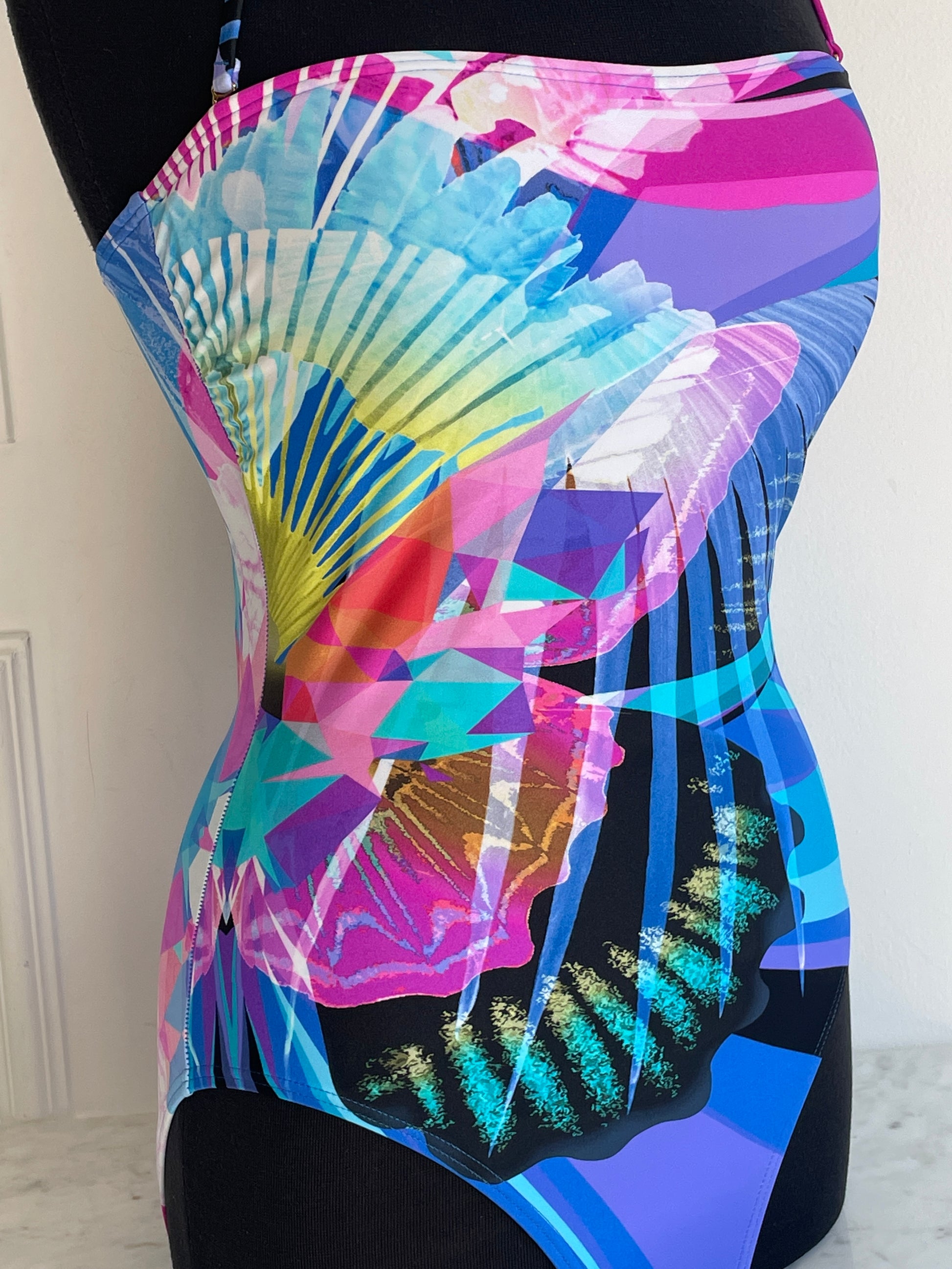 Traje de baño de una sola pieza, de diferentes colores con estampado tropical.