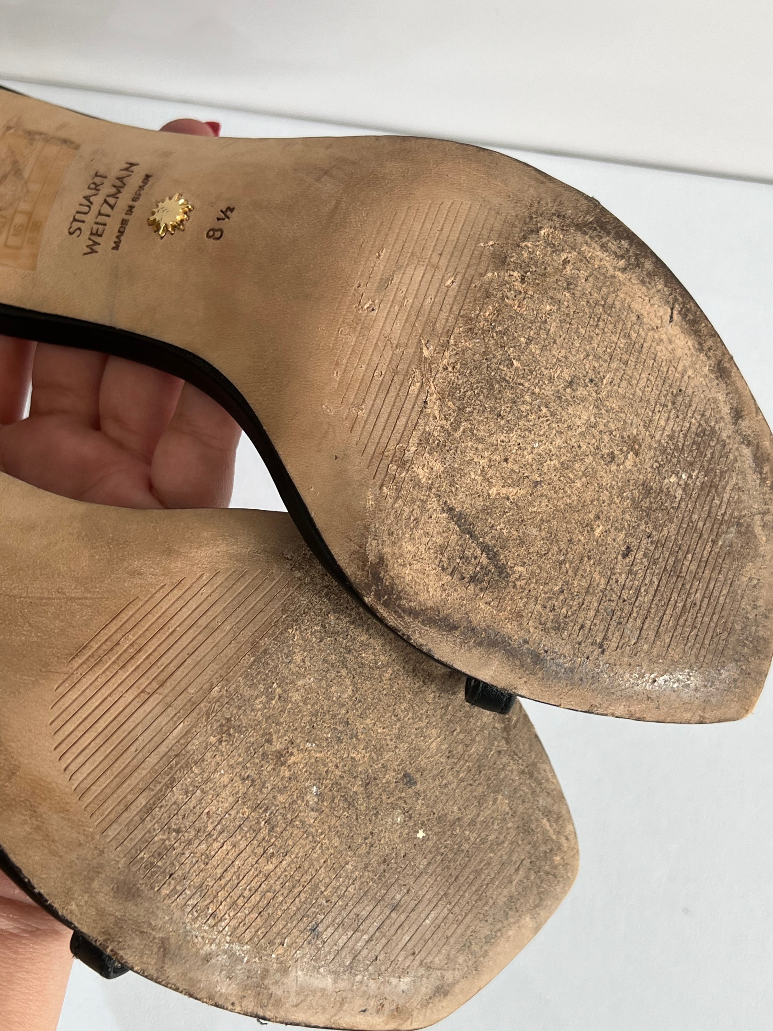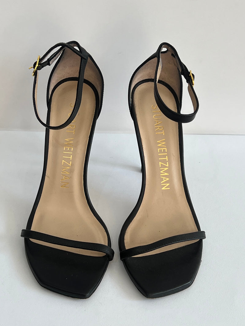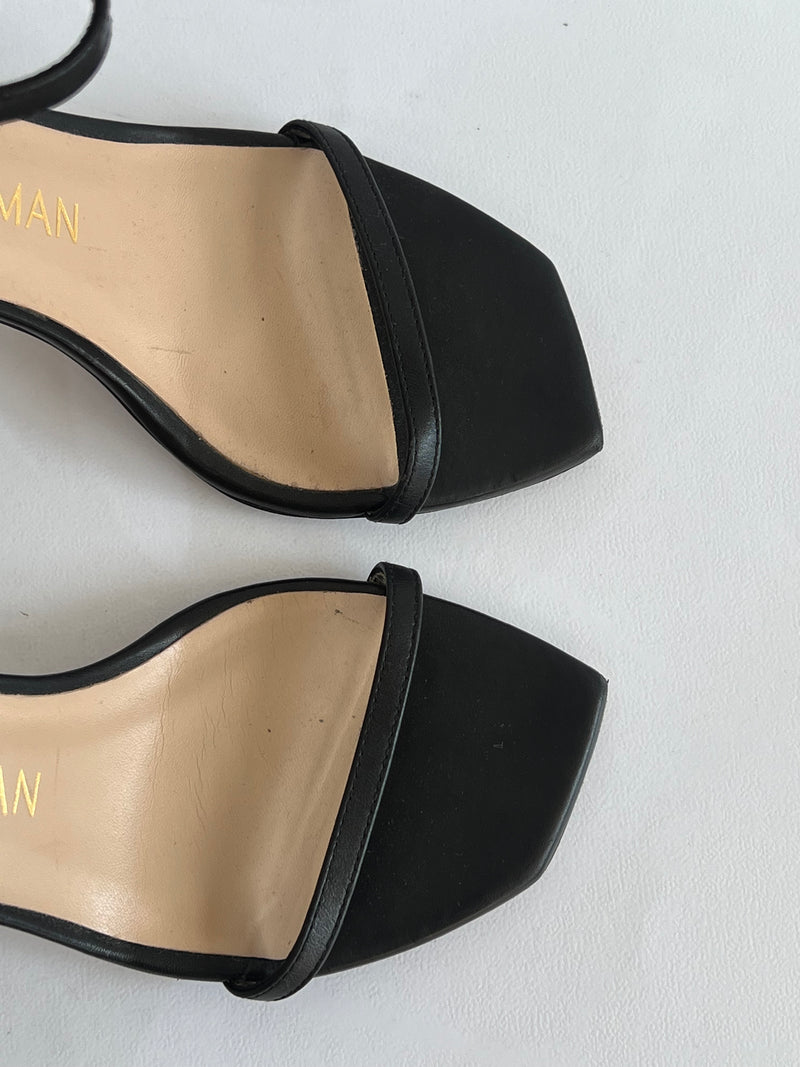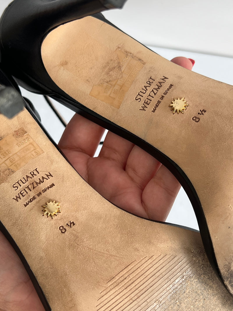 sandalias de cuero con tacón alto y tiras delgadas ajustables en los tobillos.