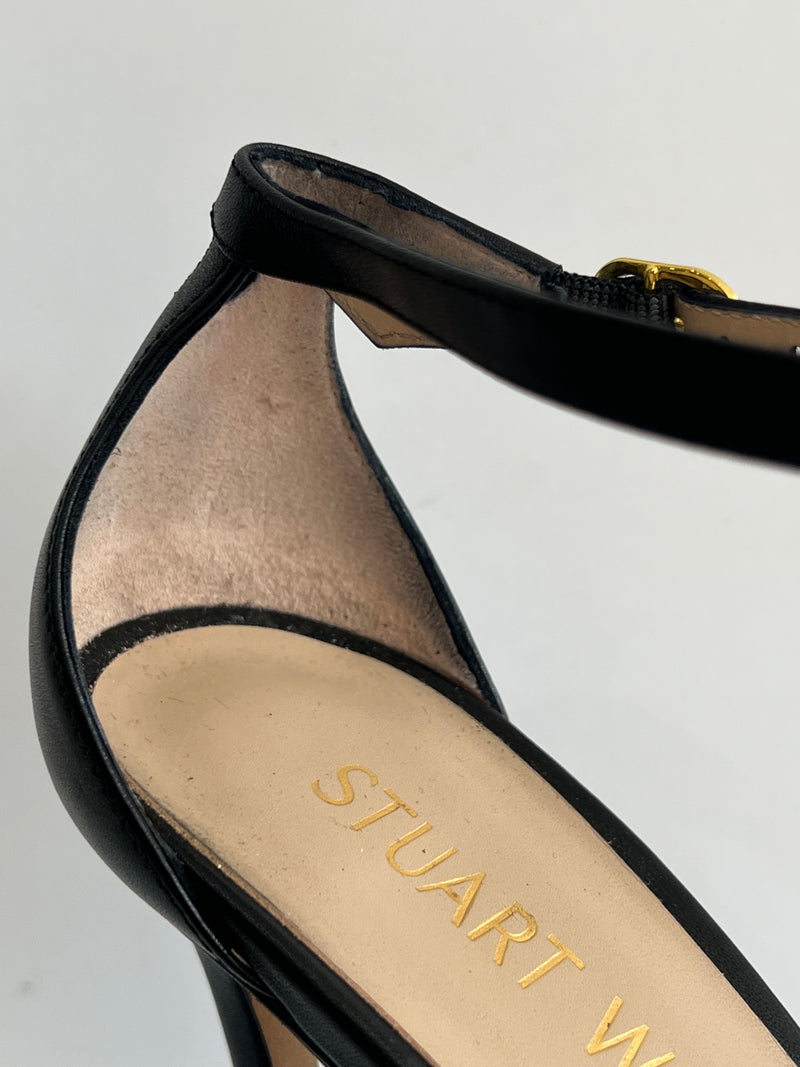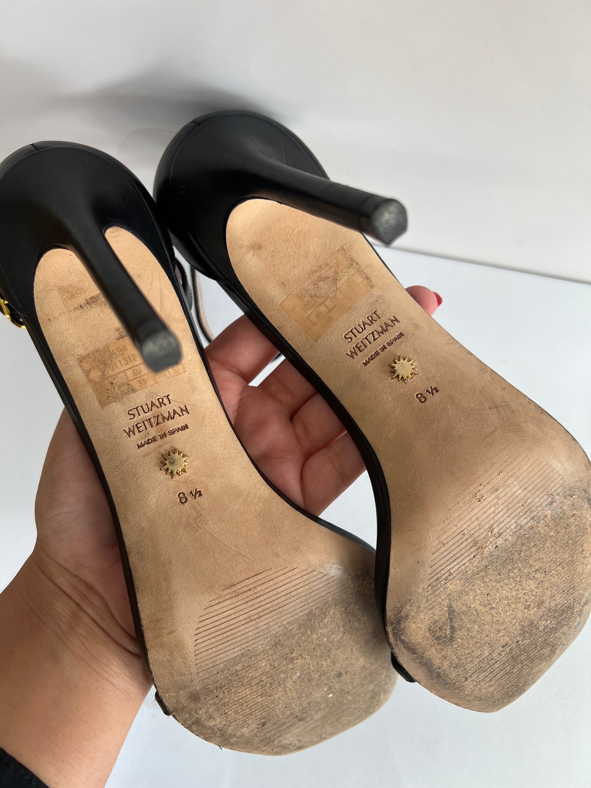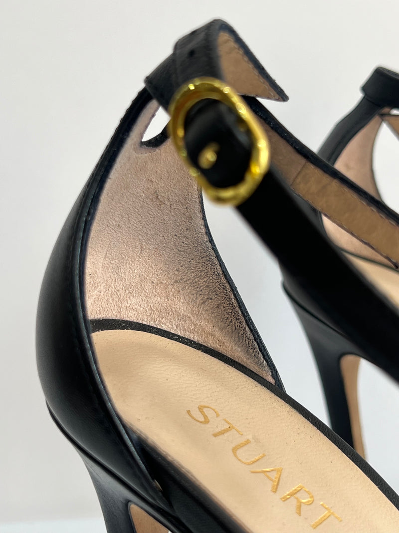 sandalias de cuero con tacón alto y tiras delgadas ajustables en los tobillos.