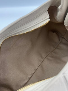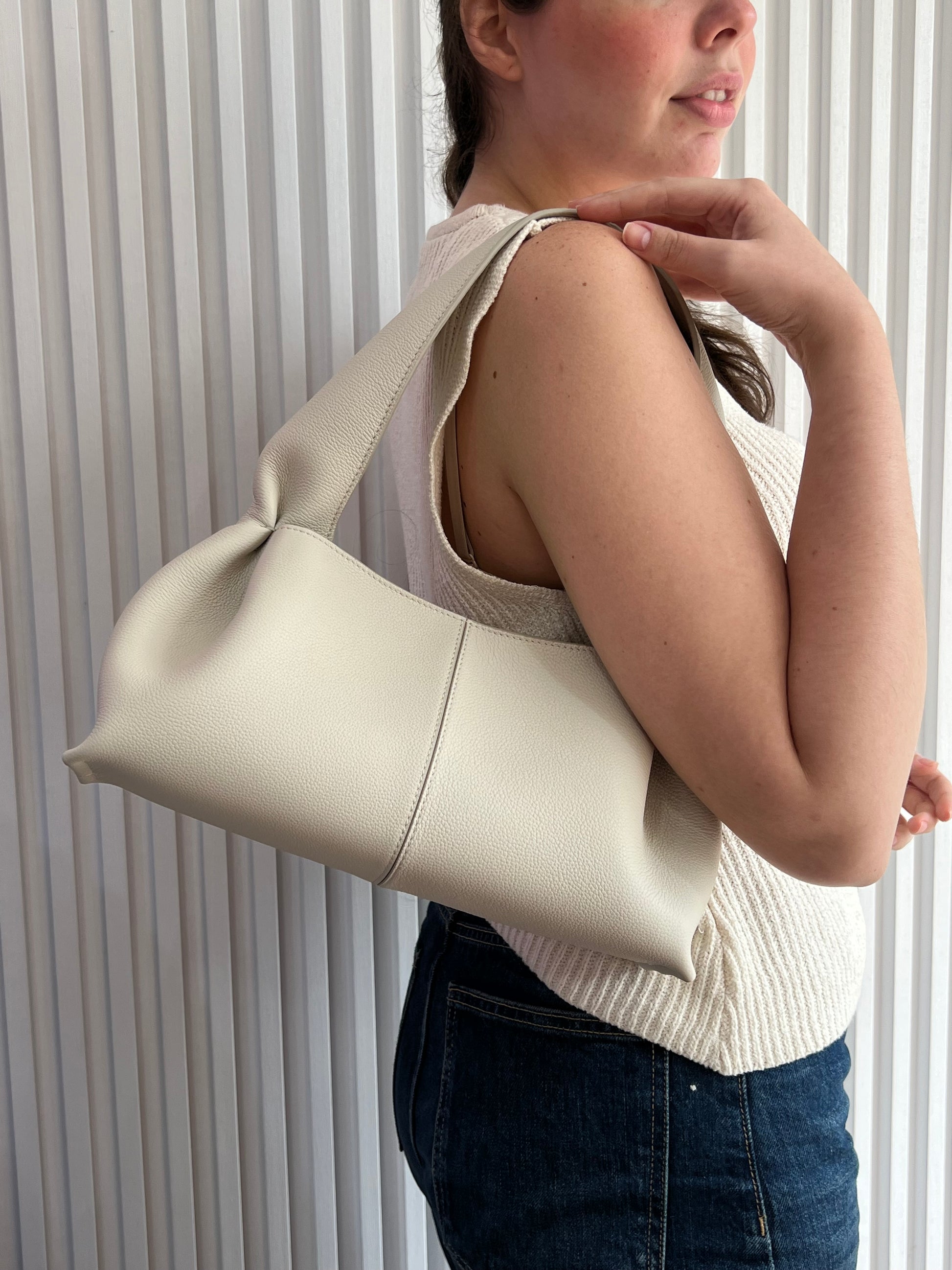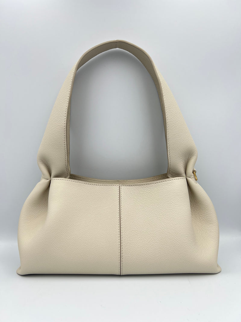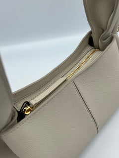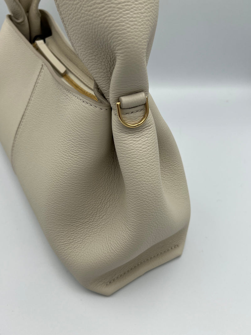 La Polène Numéro Neuf está confeccionada en cuero de becerro italiano plena flor (full‑grain textured calf leather) certificado, con un acabado texturizado y su diseño incluye líneas curvas y paneles plegados. El interior está forrado en algodón 100%, con un compartimento principal amplio y un bolsillo interno tipo parche para organizar pequeños objetos, mientras que el cierre superior es de cremallera metálica resistente