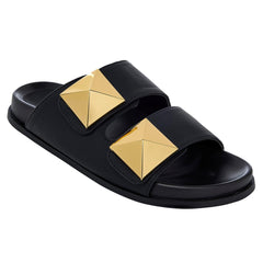 Presenta una banda ancha frontal hecha de cuero liso, decorada al centro con un maxi stud metálico. La sandalia tiene una silueta tipo slide, una plantilla cubierta en cuero y una suela plana de perfil delgado.