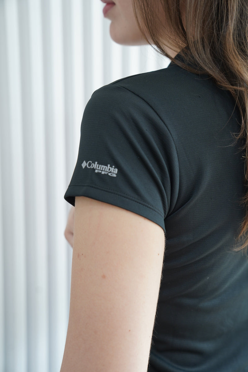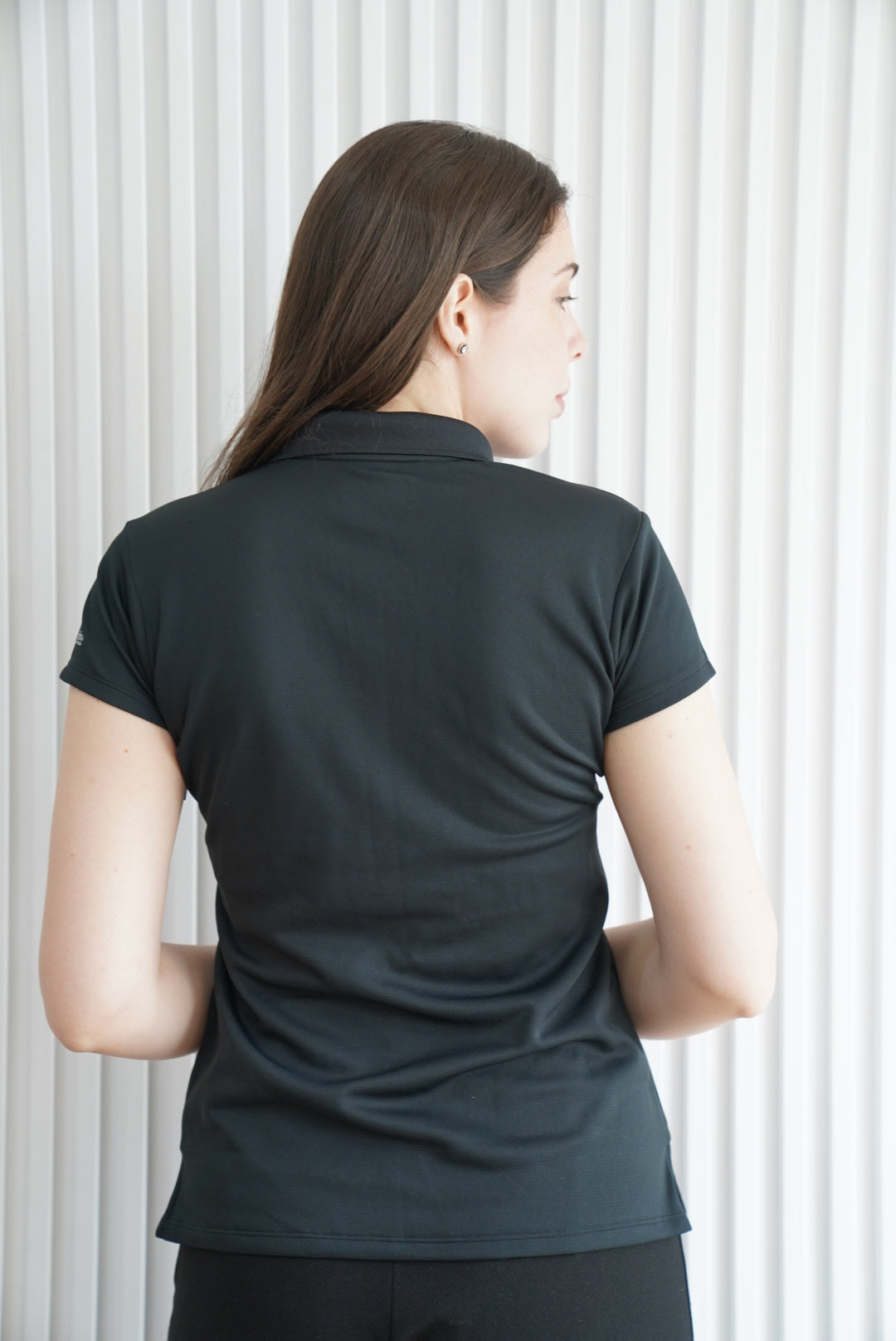 Esta camisa de tela deportiva, de manga corta y botones en la parte frontal.