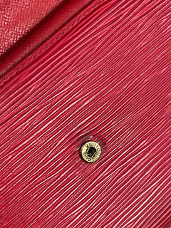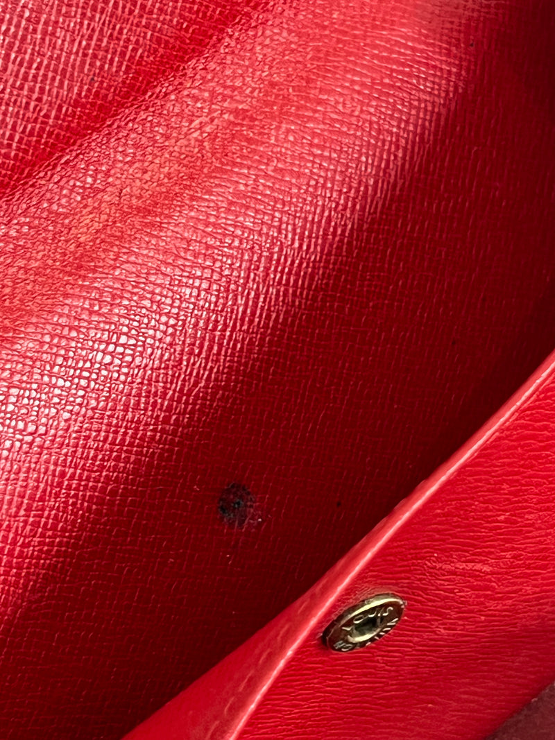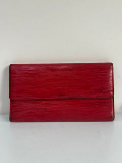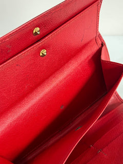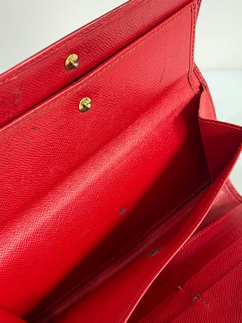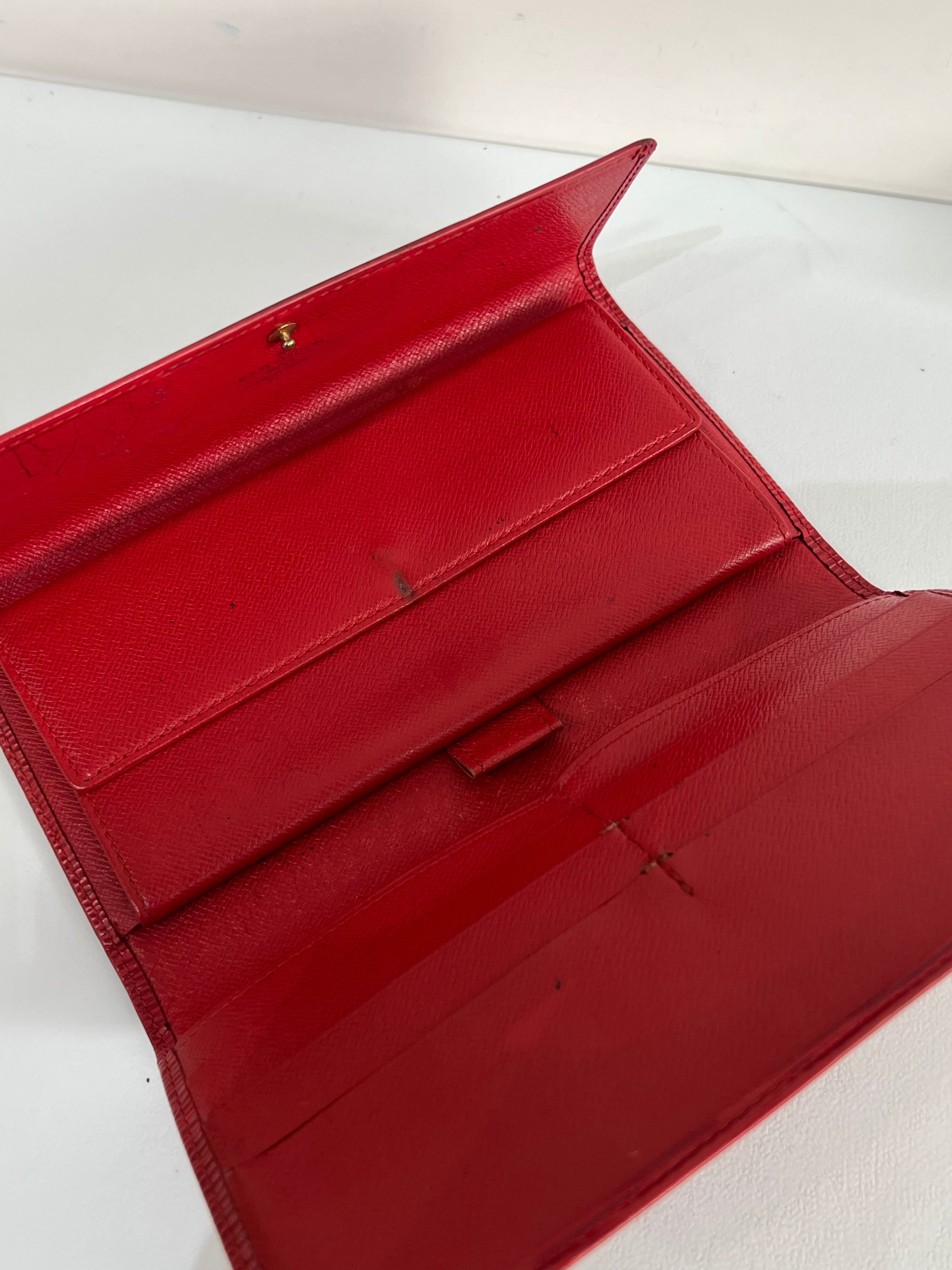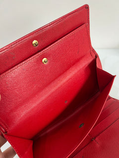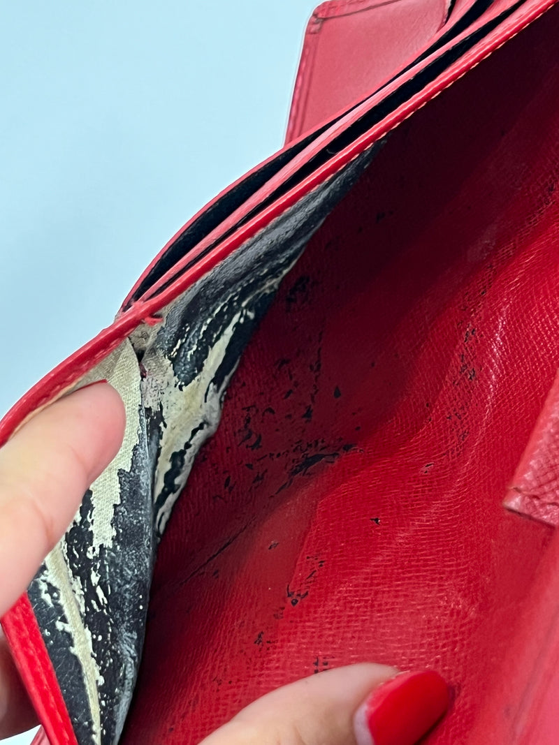 Billetera color rojo vivo, cuenta con multiples compartimentos para tarjetas y efectivo. Codigo en el interior