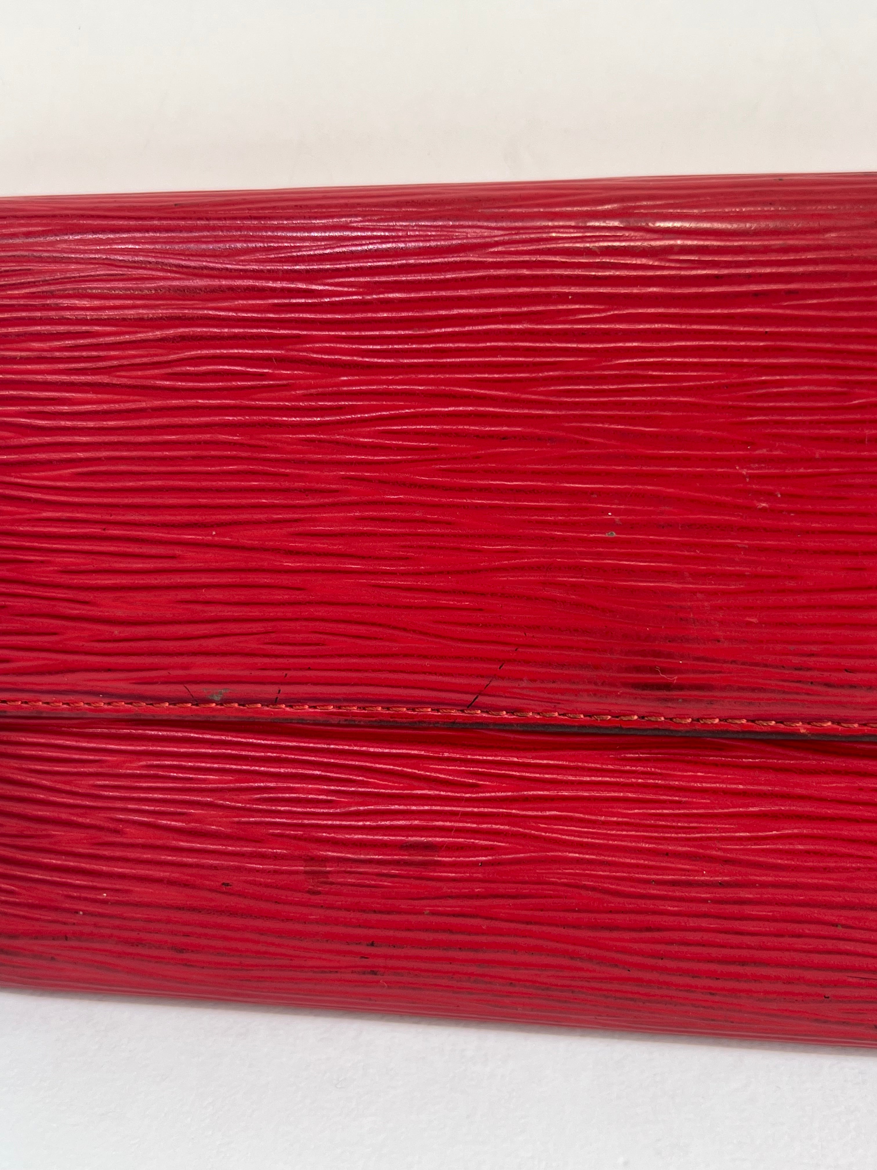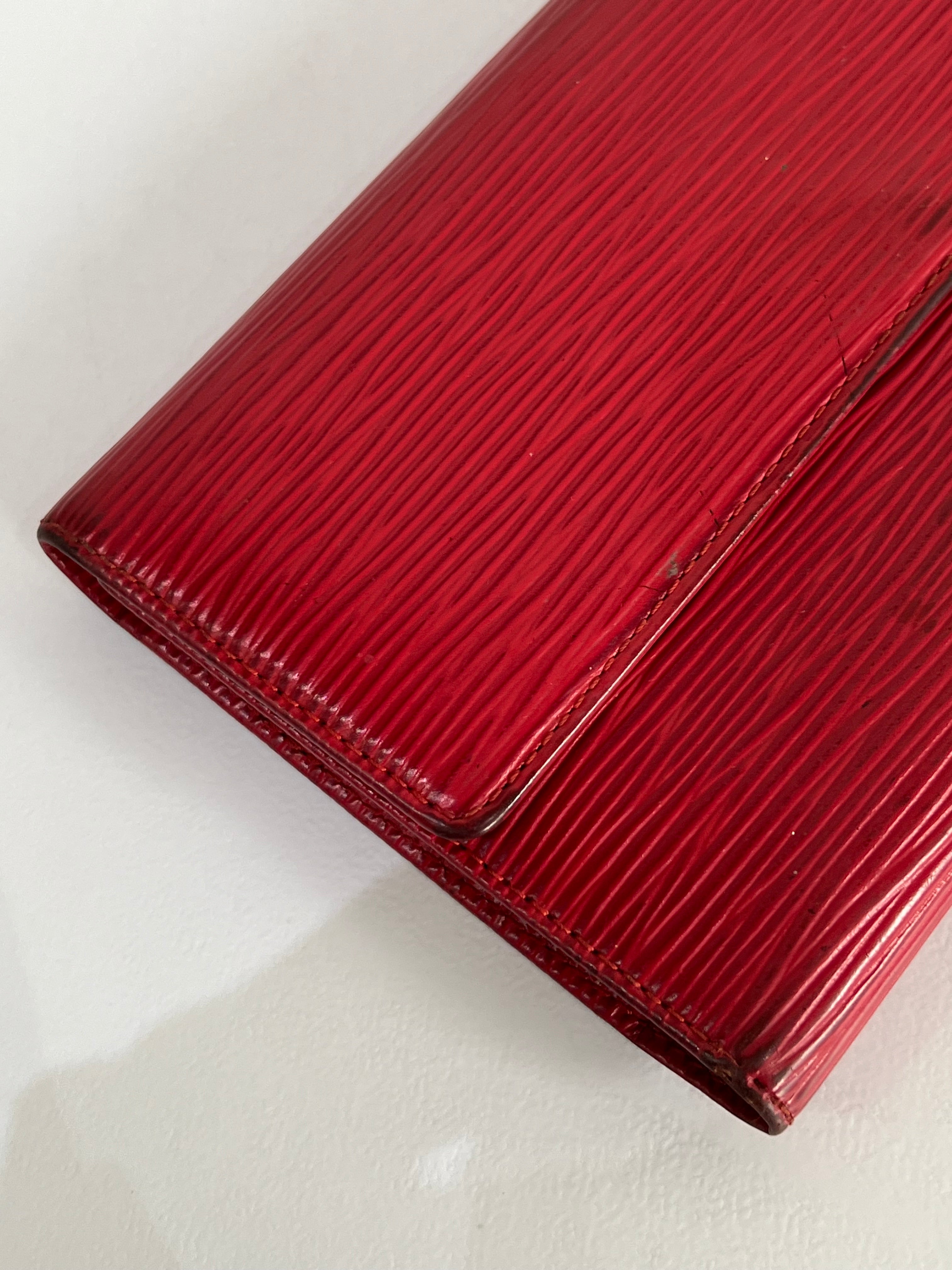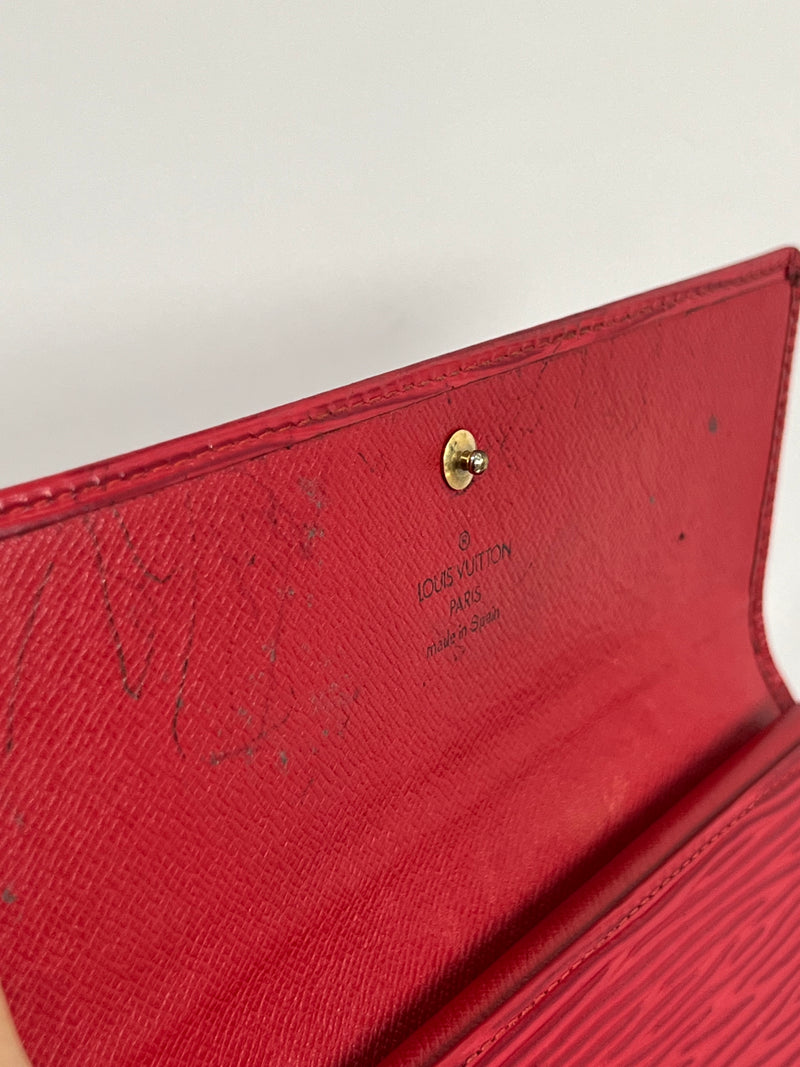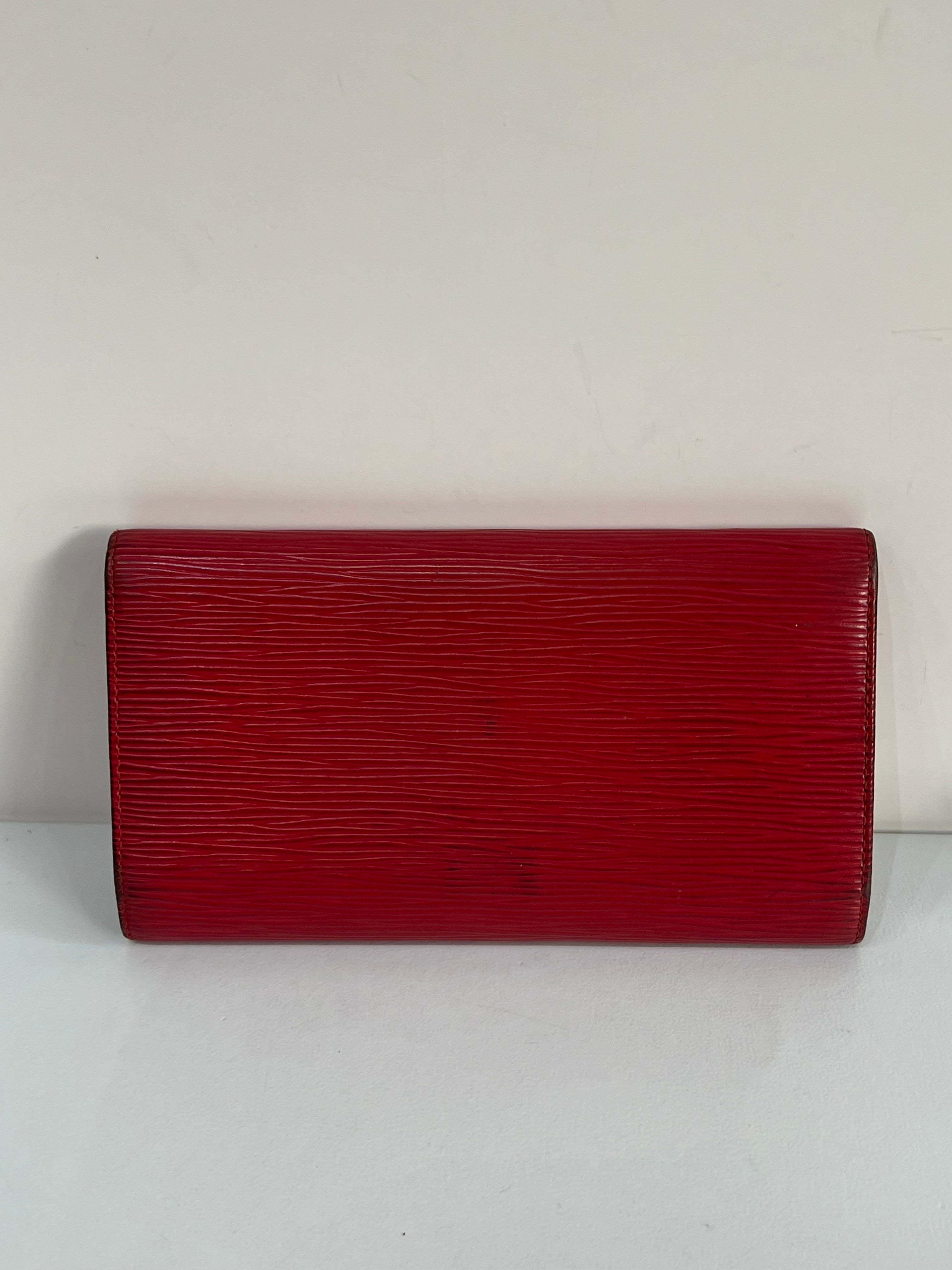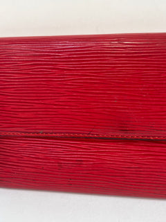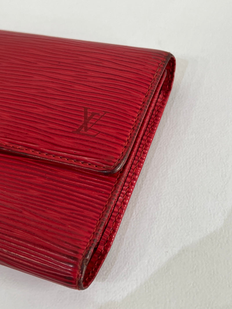 Billetera color rojo vivo, cuenta con multiples compartimentos para tarjetas y efectivo. Codigo en el interior
