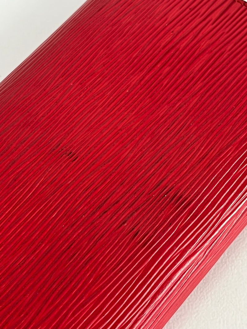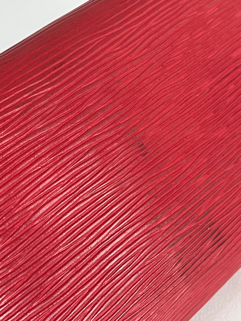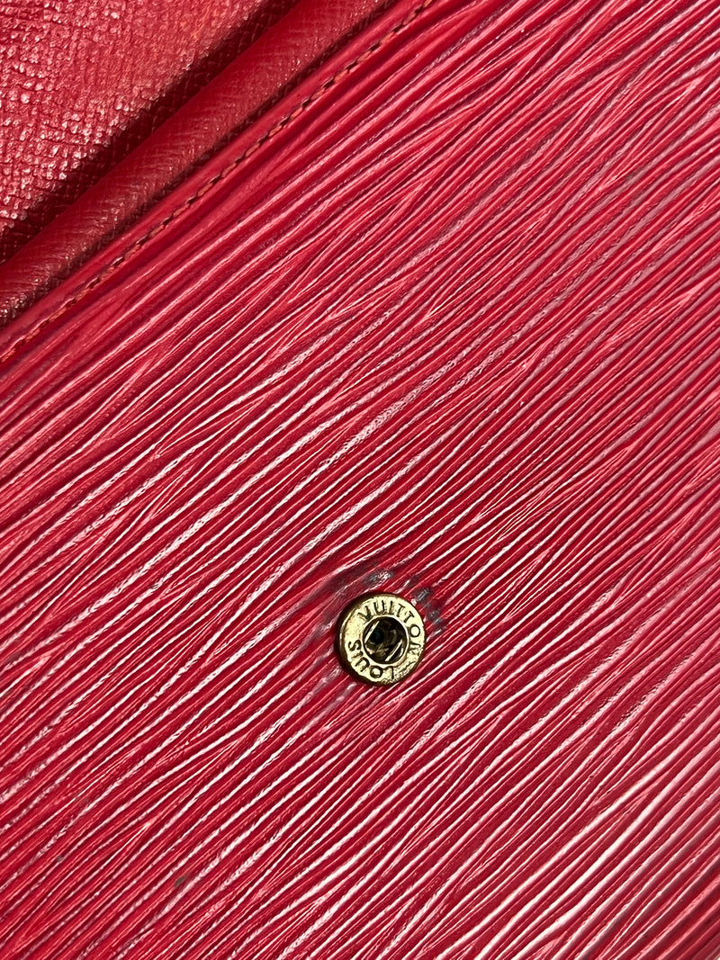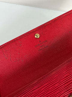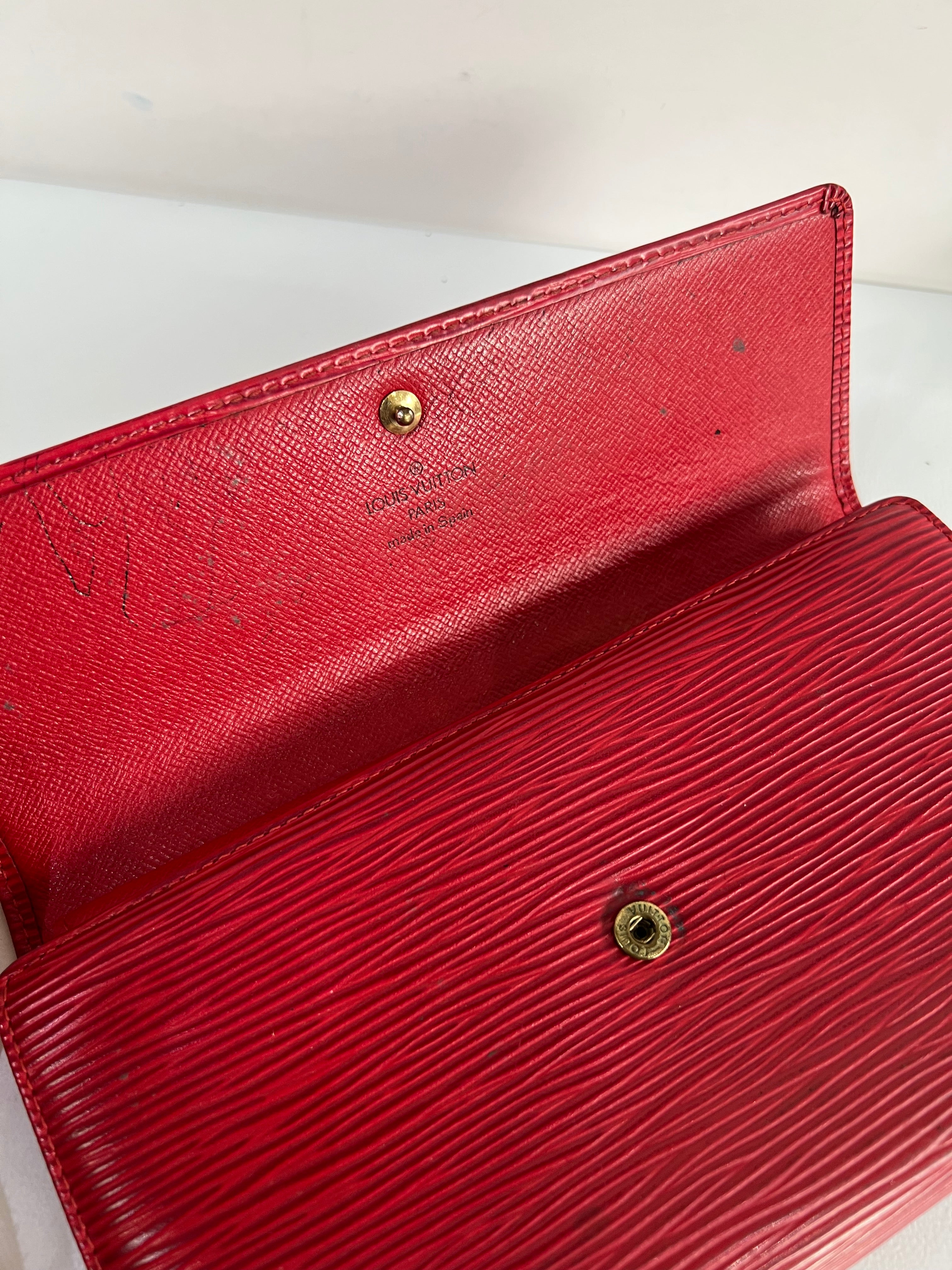 Billetera color rojo vivo, cuenta con multiples compartimentos para tarjetas y efectivo. Codigo en el interior