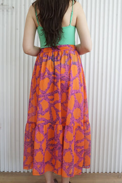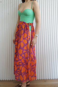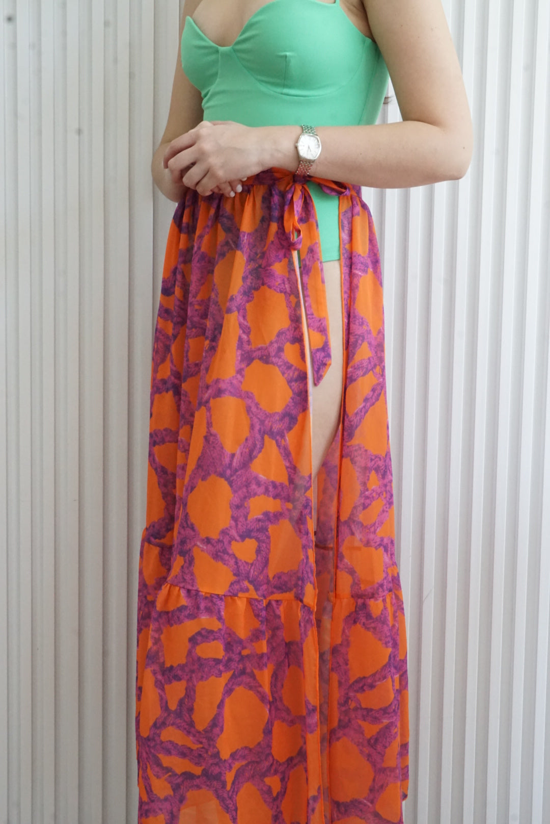 Esta salida de baño se amarra en la cintura con una cinta. Es de tela muy ligera y semi-transparente con un estampado tropical.