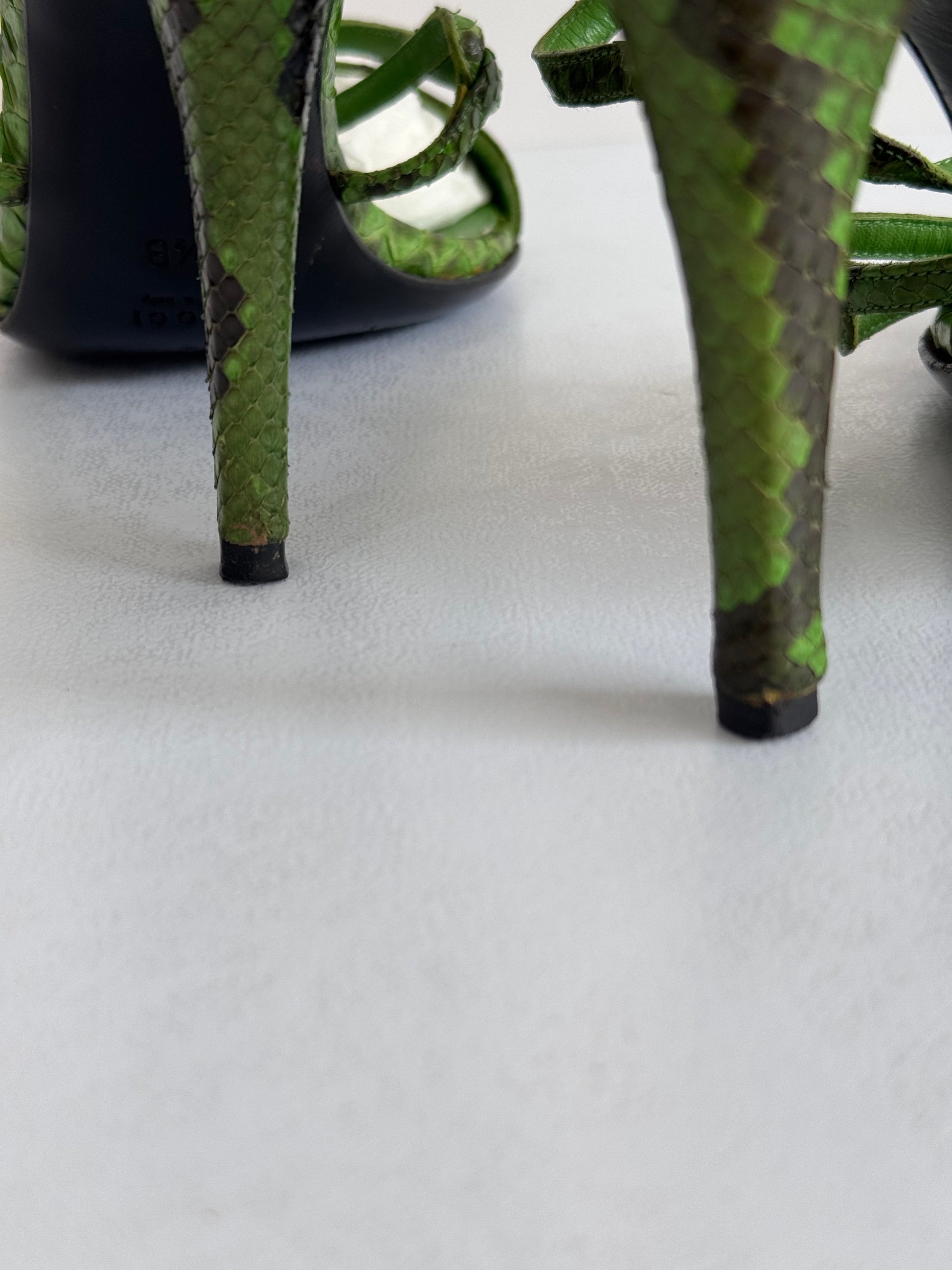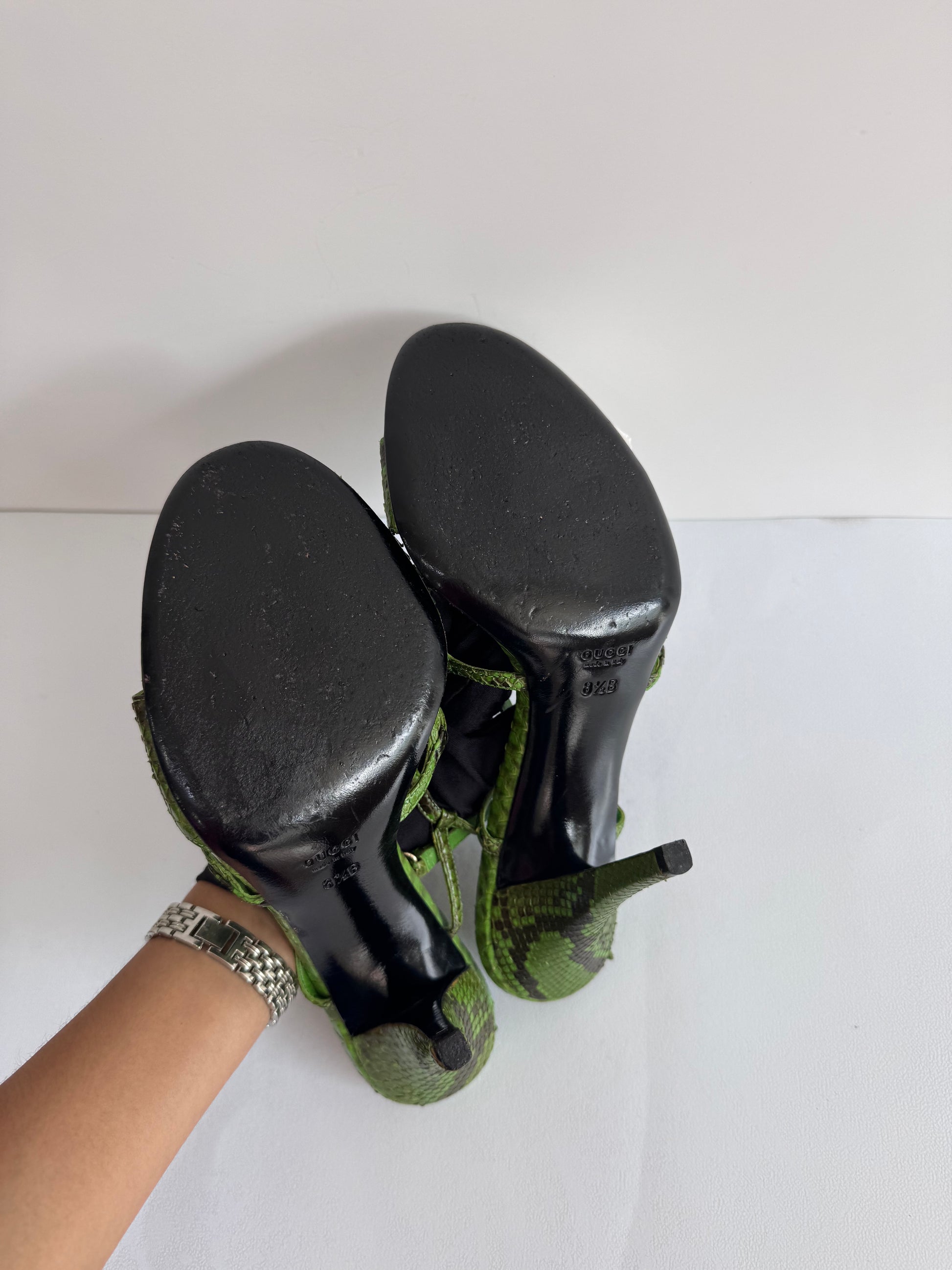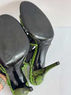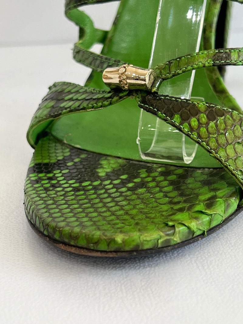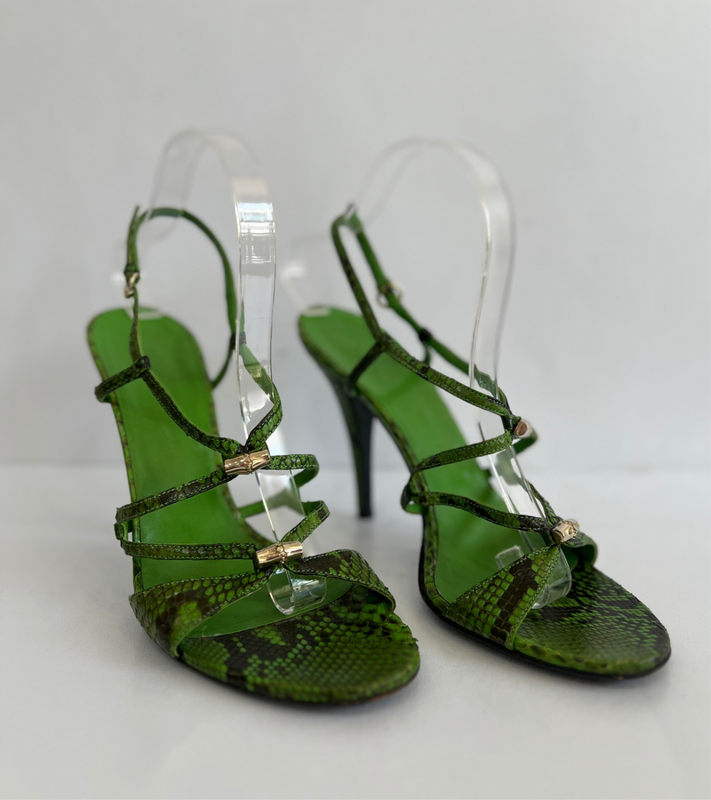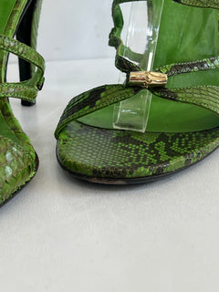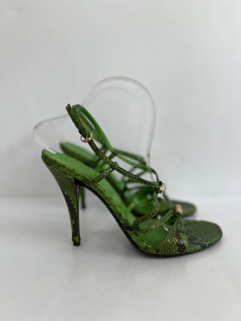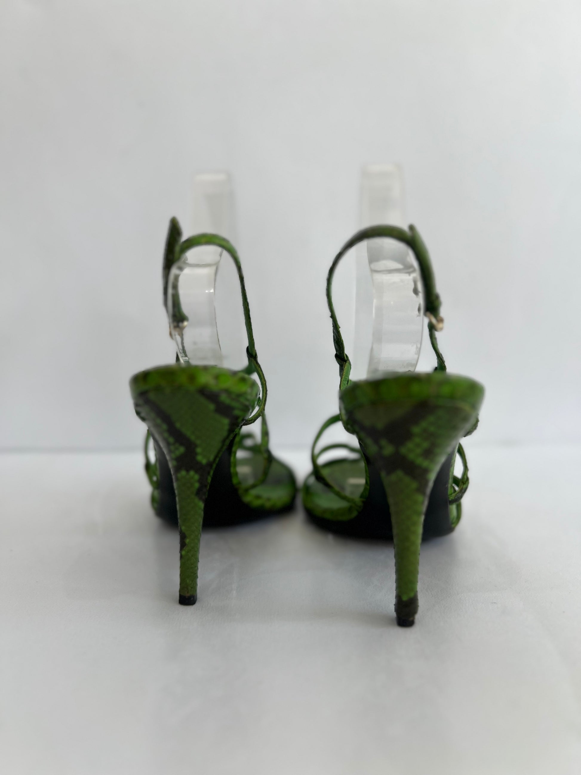 Estos tacones de cuero con estampado de serpiente tiene varios straps entrelazados y detalles en dorado.