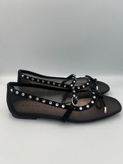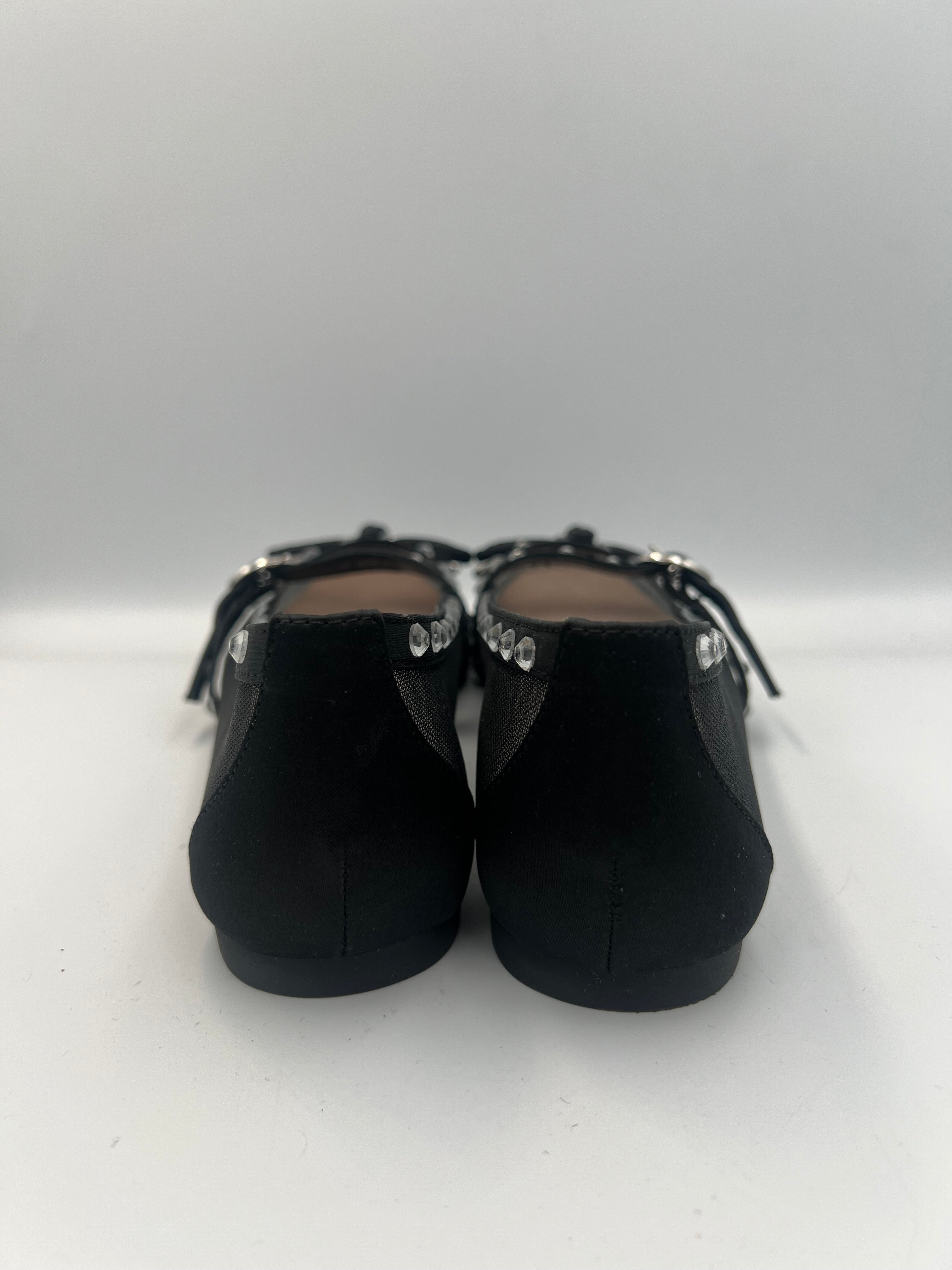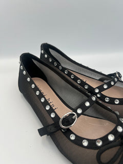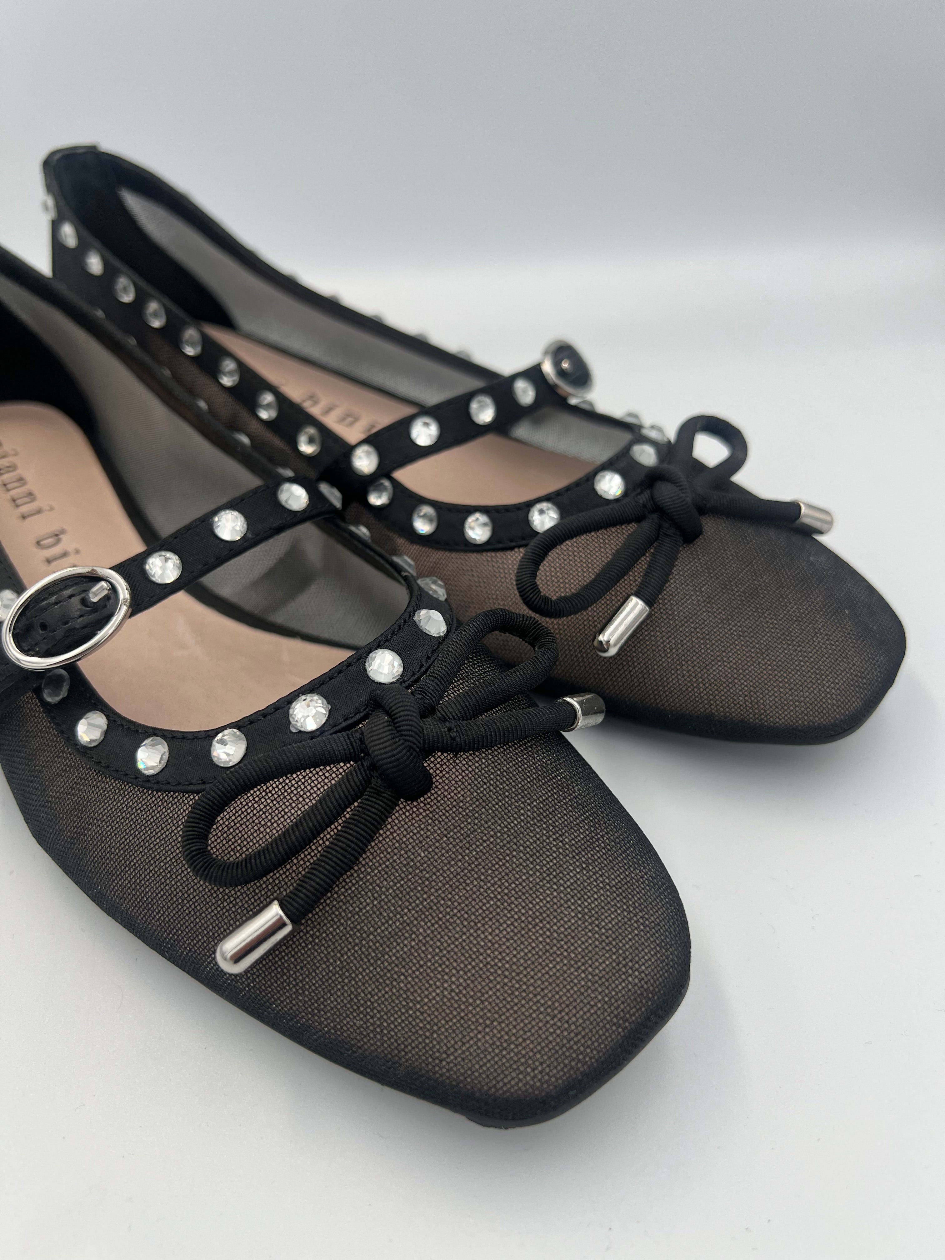 Bailarinas confeccionadas en malla transparente con detalles de pedrería. Presentan tiras con studs decorativos junto a un lazo al frente, combinando un estilo femenino con un toque moderno y llamativo.