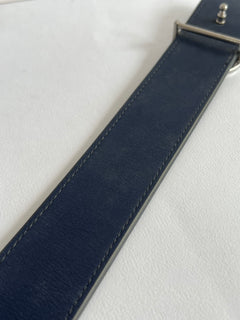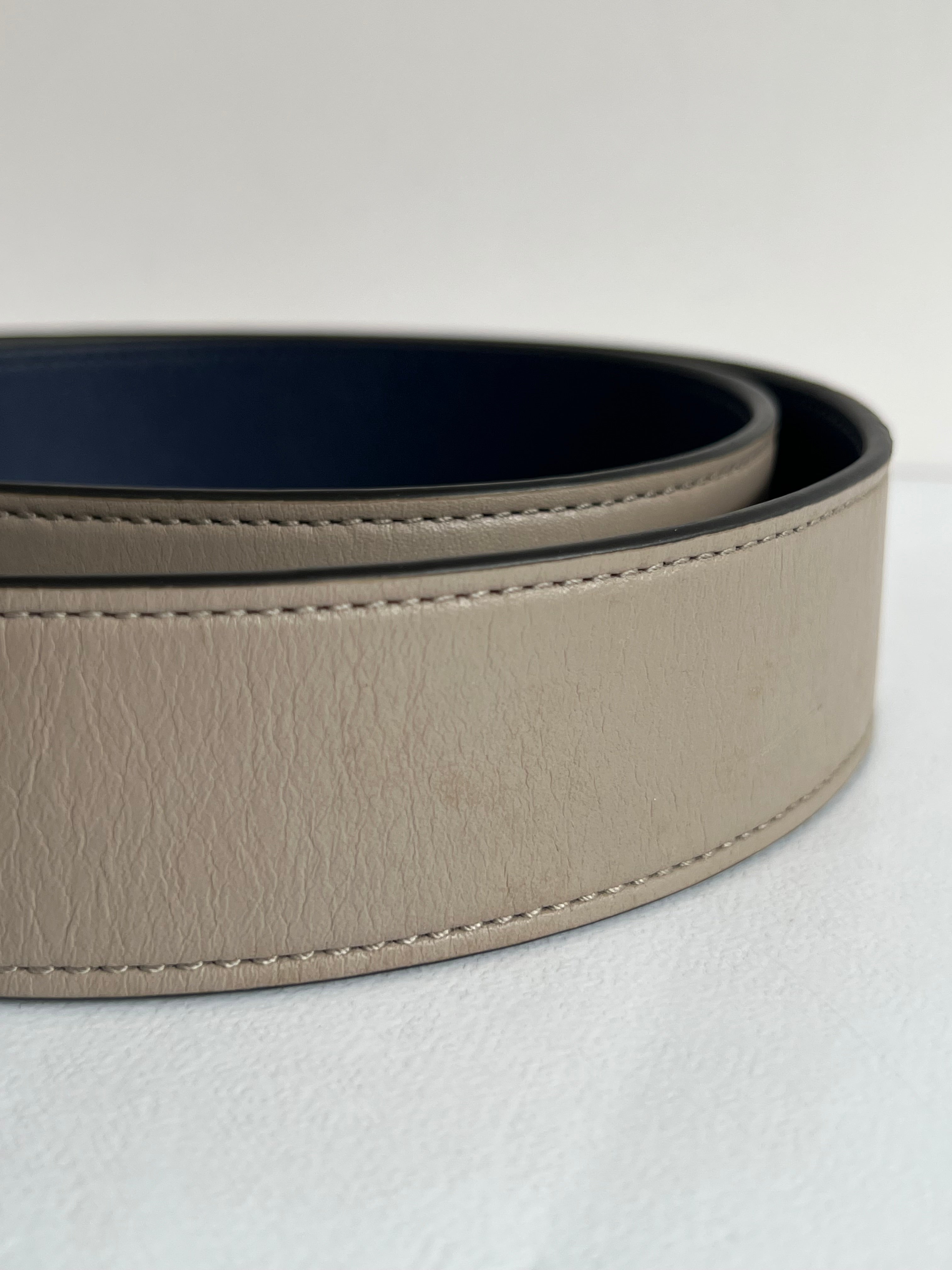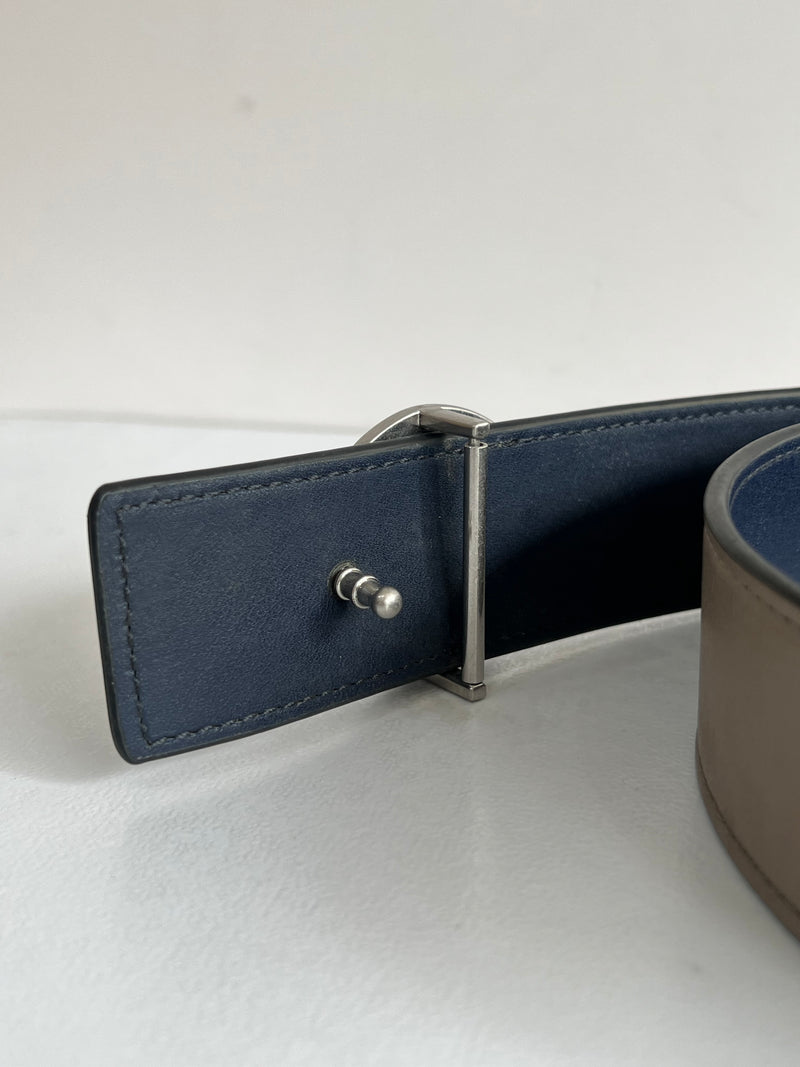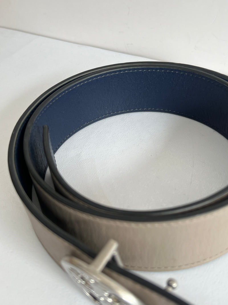 Cinturón de piel reversible en tonos azúl marino y gris, diseñado con hebilla metálica con el icónico logo de la marca.