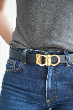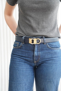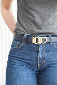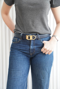 Cinturón de piel reversible en negro y café claro, porta hebilla metálica con icónico logo de la marca.