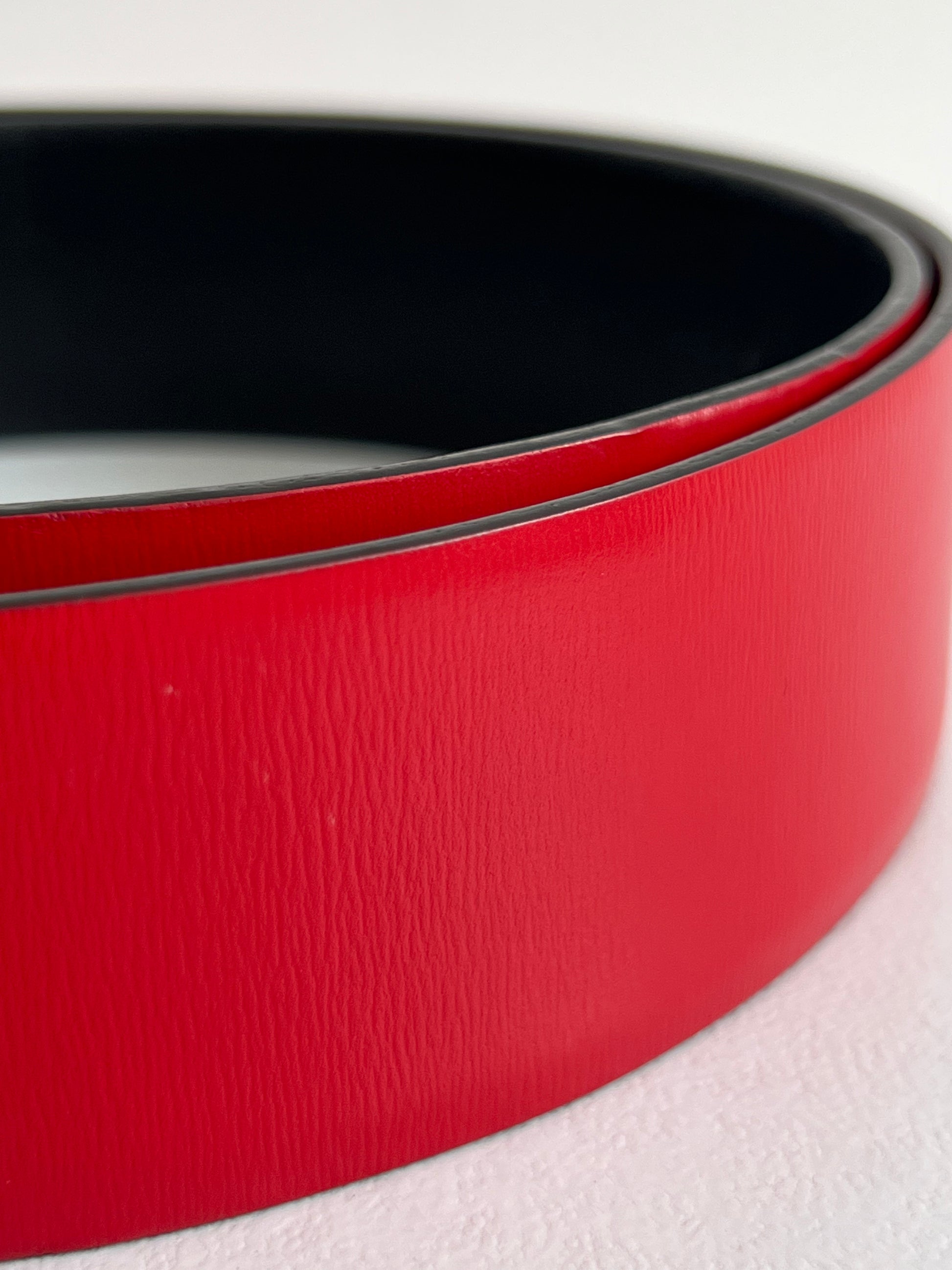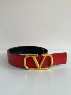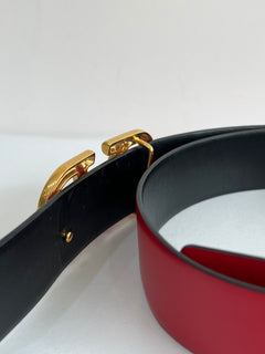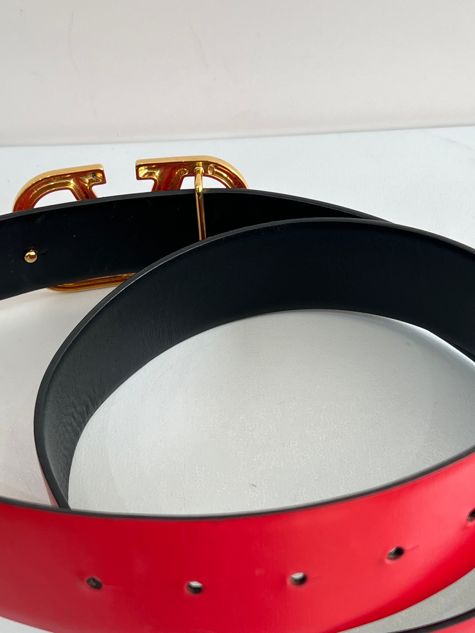 Cinturón Valentino Garavani reversible en piel, con un lado en color rojo y el otro en negro, hebilla metálica con logotipo distintivo.