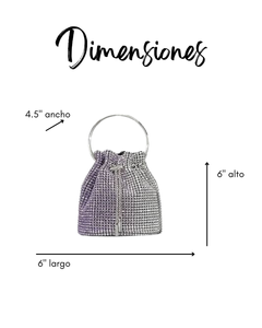 Bolso tipo bucket en formato mini, con superficie cubierta de cristales tipo rhinestone. Base estructurada, cierre superior con cordón y asa corta, además de una correa opcional para llevar al hombro o cruzado.
