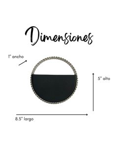 Bolso redondo de estructura rígida, cubierto en la asa de cristales tipo rhinestone con asa metálica y cierre superior metálico.