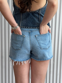 Shorts jean azul claro, cintura alta, corte A, cierre frontal con zíper y botón, 2 bolsillos frontales y 2 traseros, detalles deshilachados en la parte frontal y a los bordes.