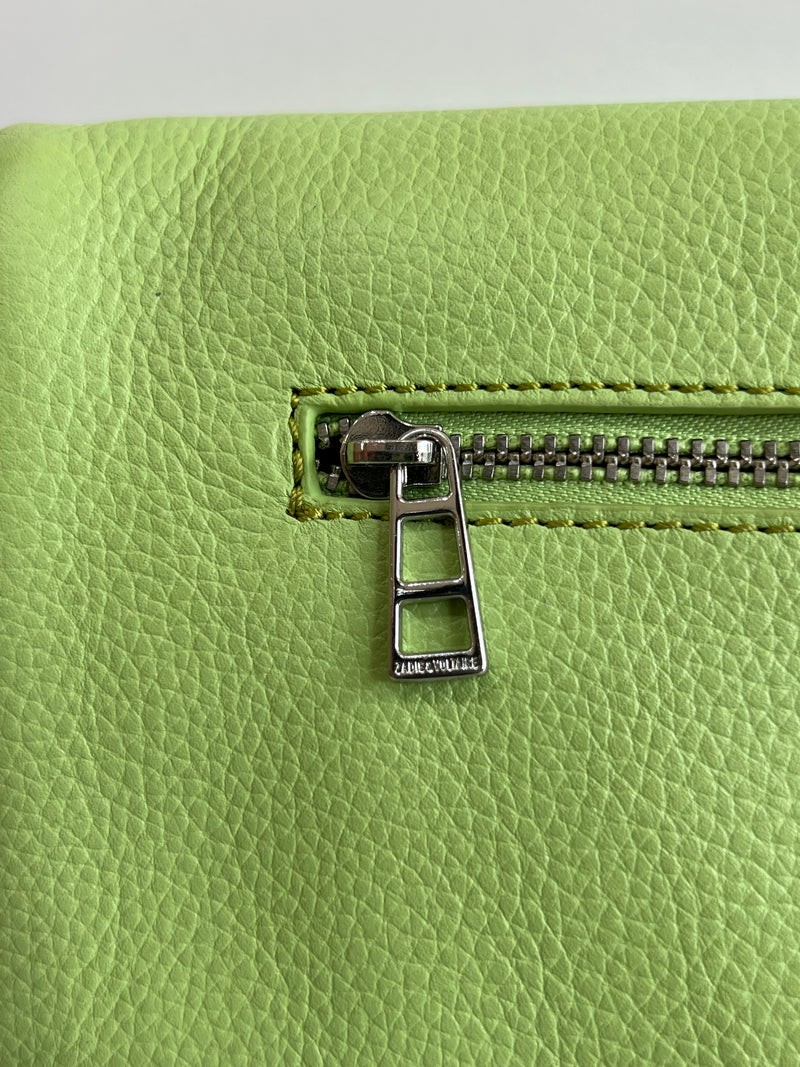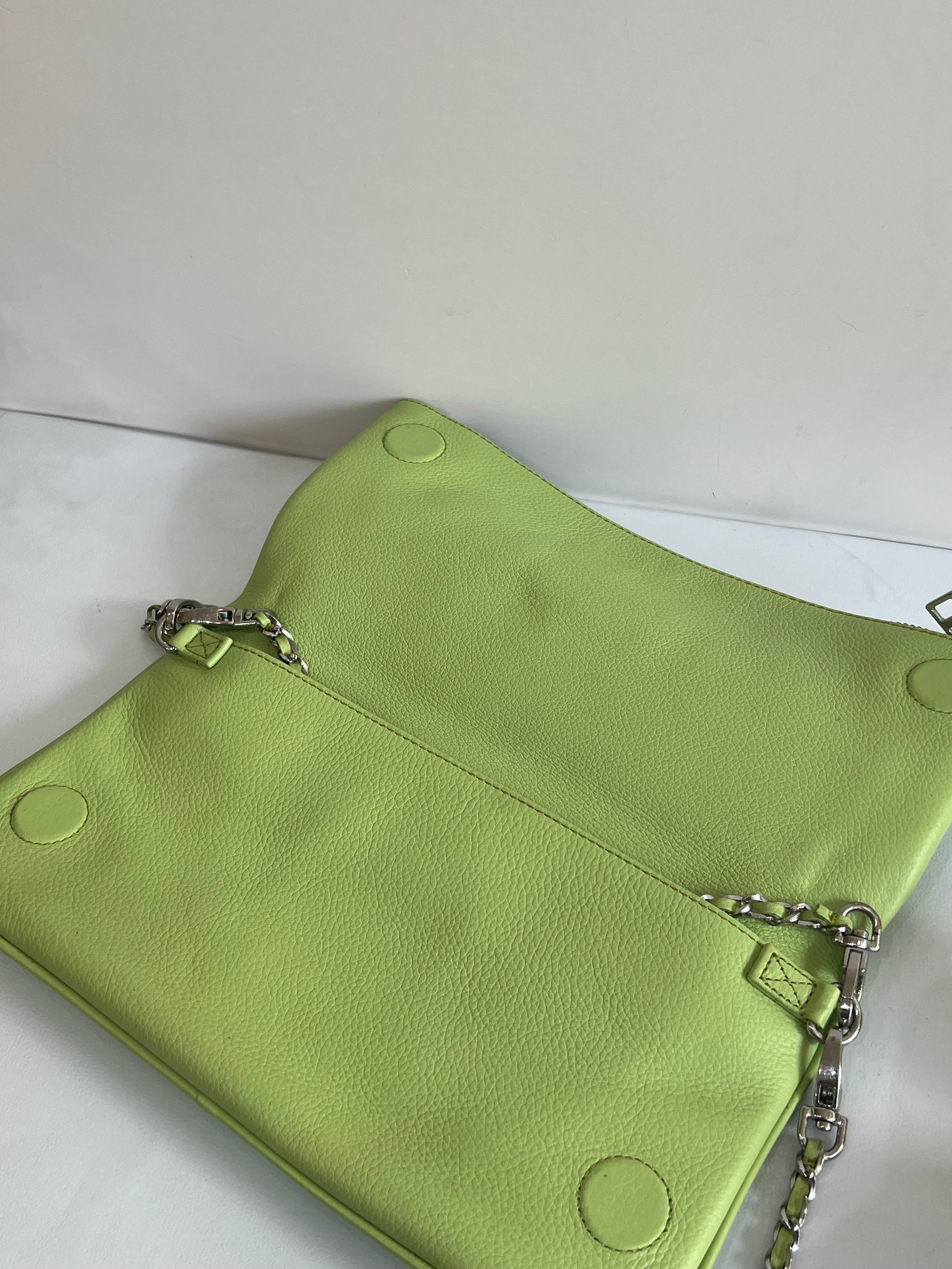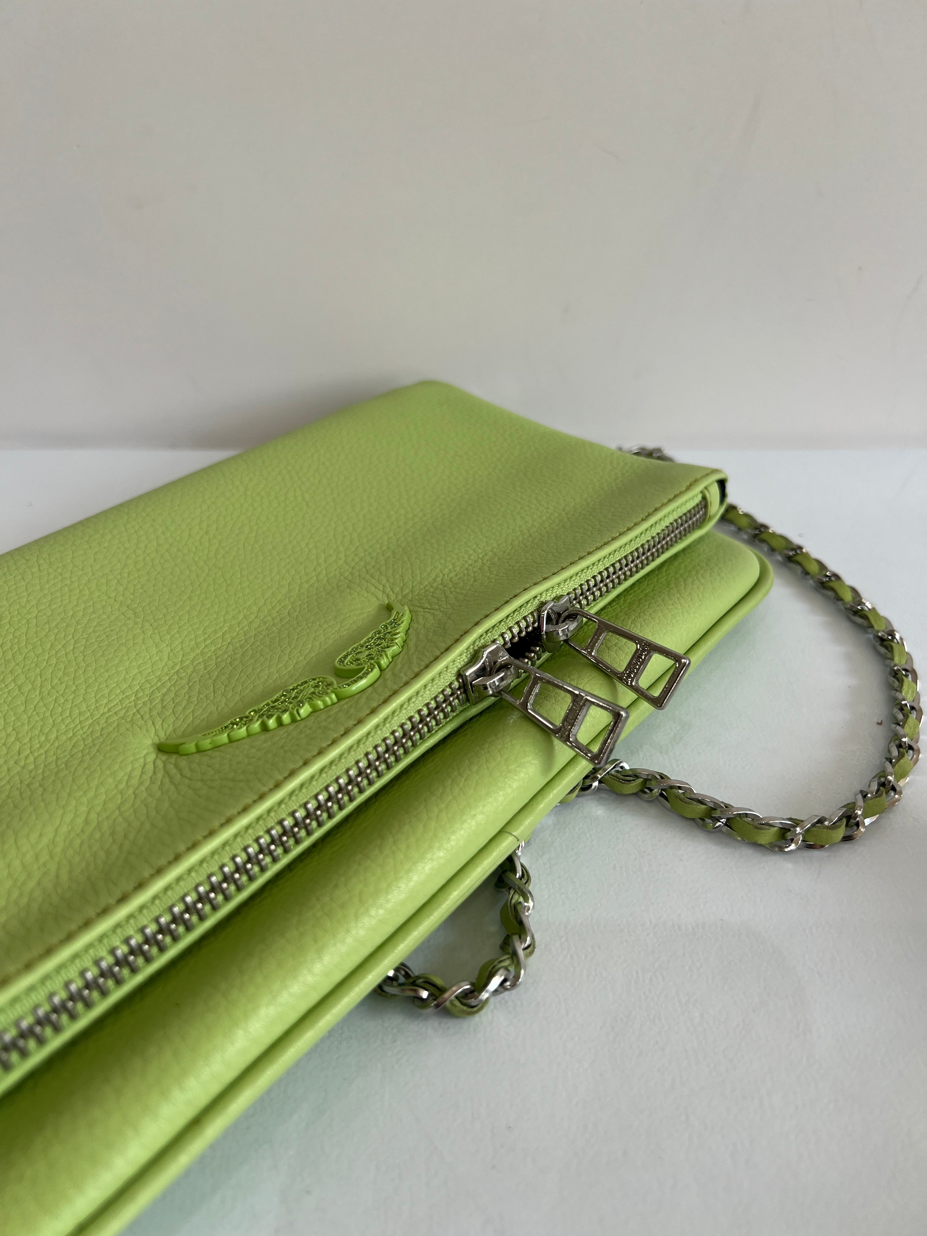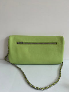 Clutch en piel color verde claro con acabado suave, cierre de cremallera y también de imán, doble cadena desmontable para llevar al hombro o cruzado y bolsillos interiores.