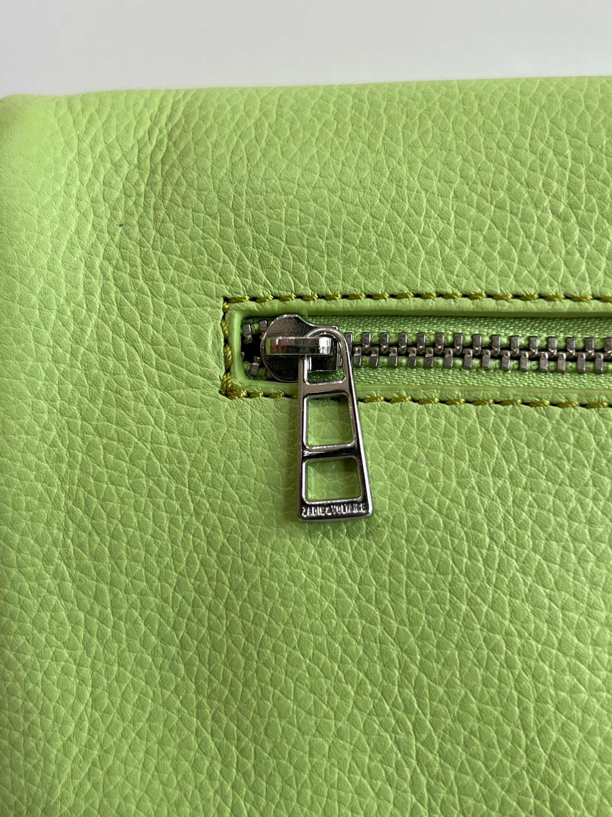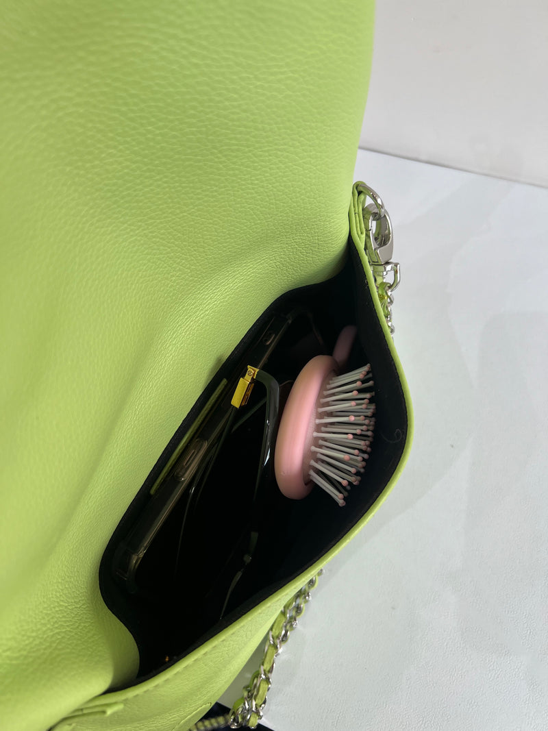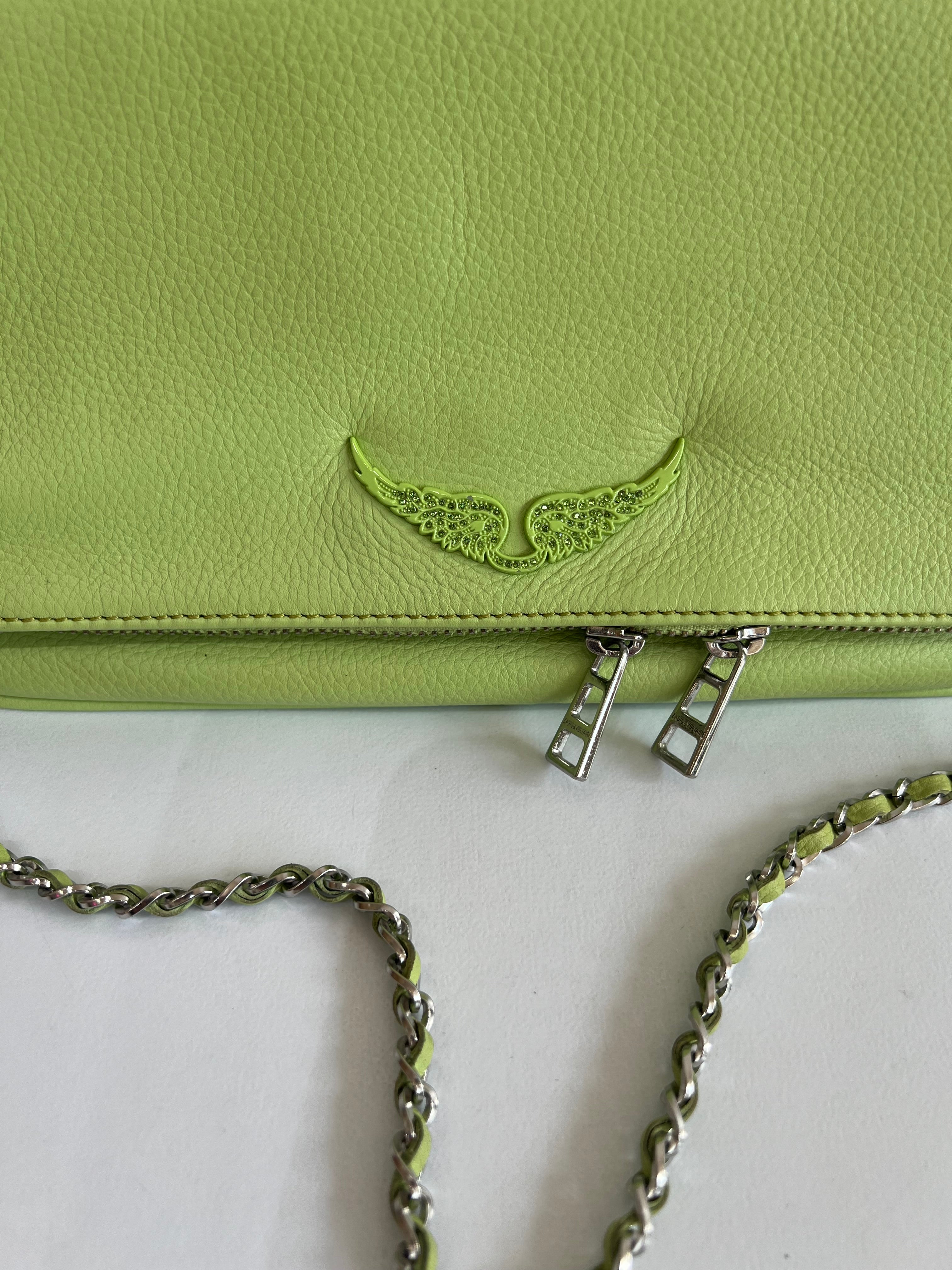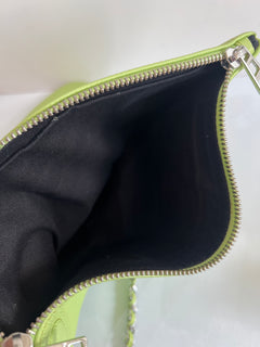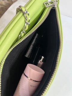 Clutch en piel color verde claro con acabado suave, cierre de cremallera y también de imán, doble cadena desmontable para llevar al hombro o cruzado y bolsillos interiores.