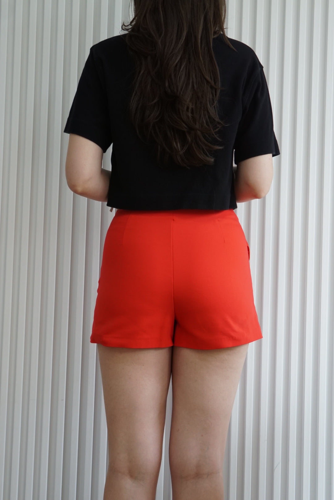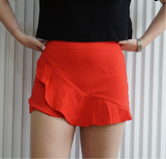 falda/short con detalles de vuelos al frente, cuenta con un cierre de zipper en el lado izquierdo de la cadera.