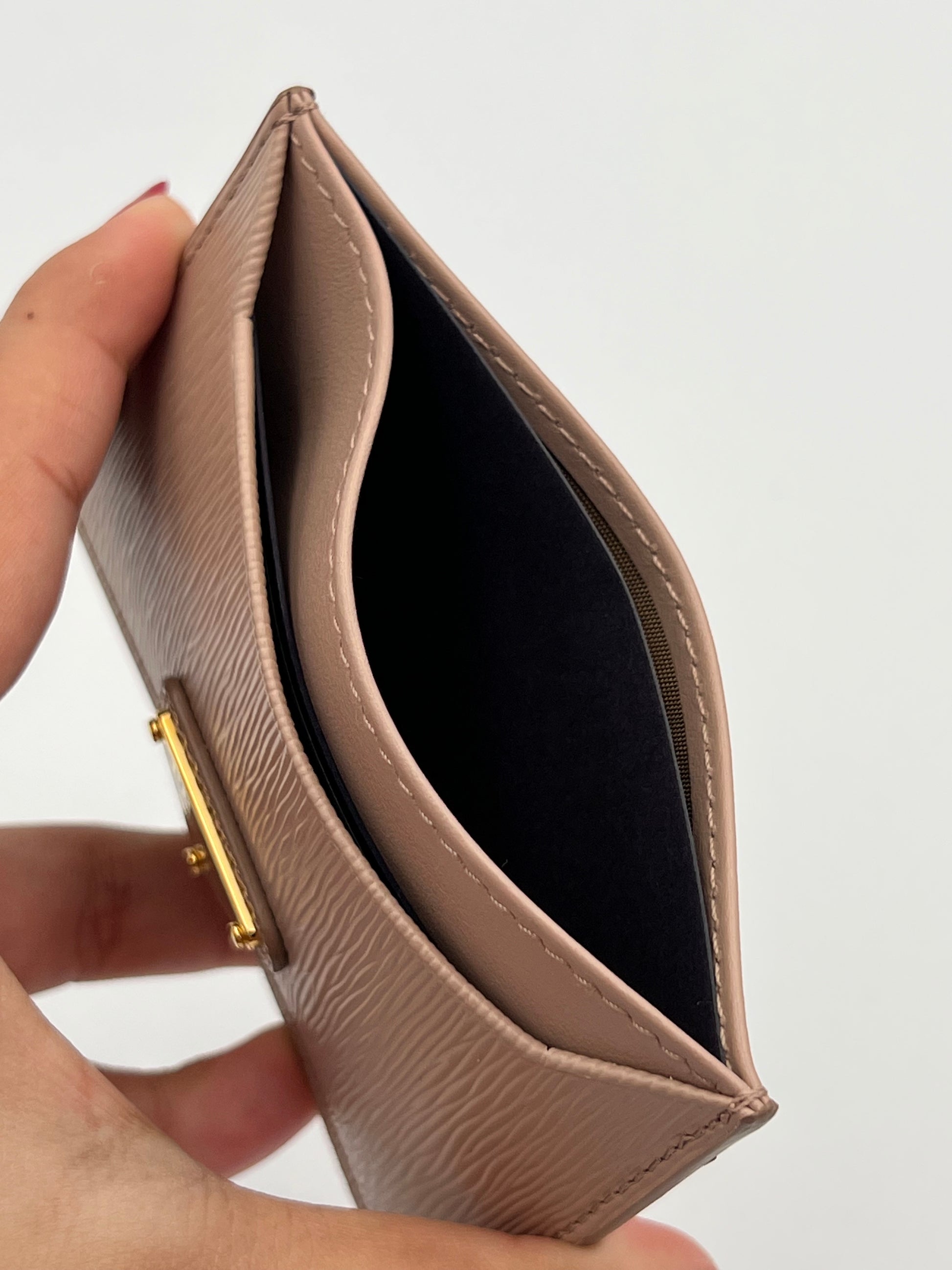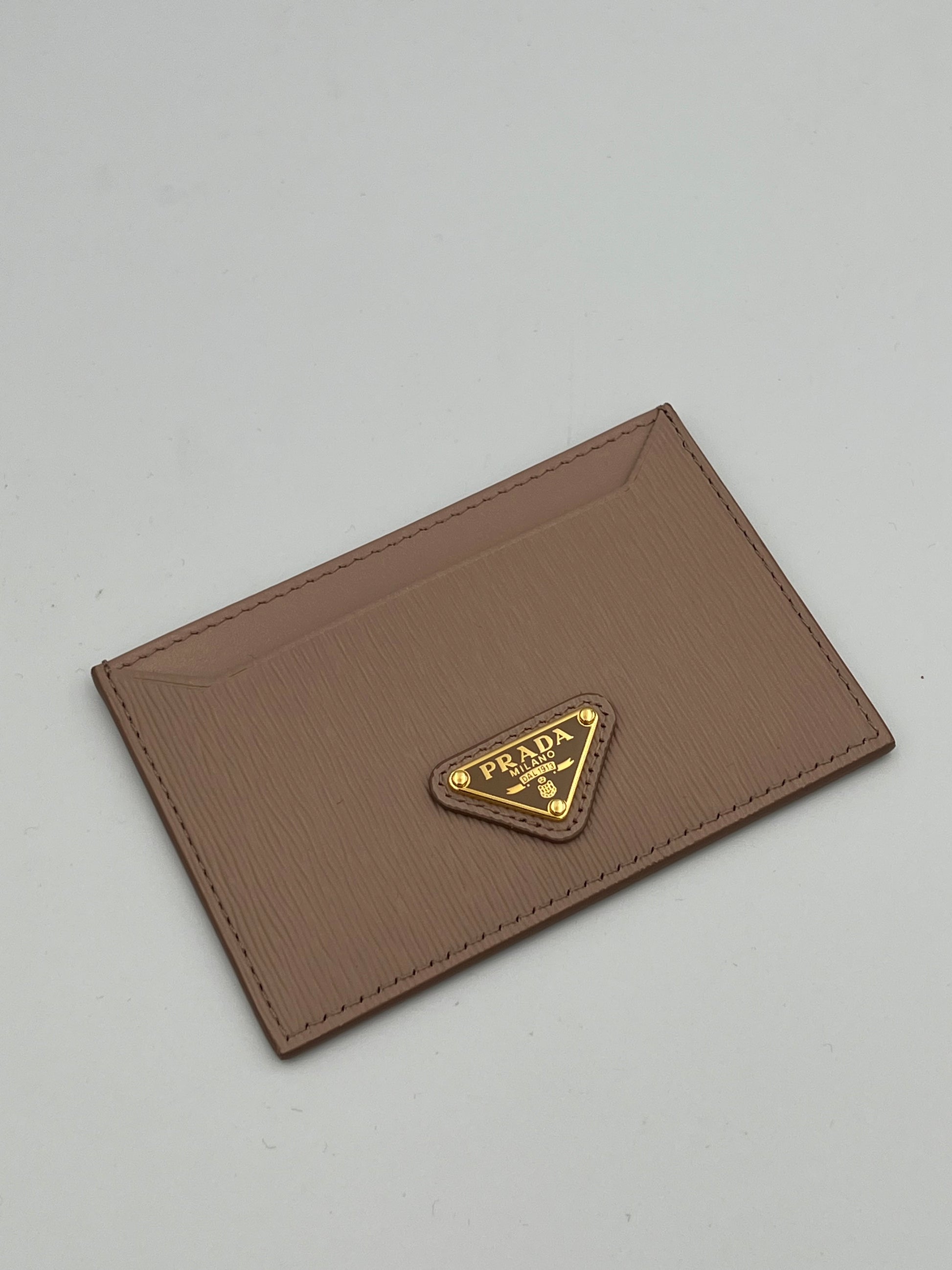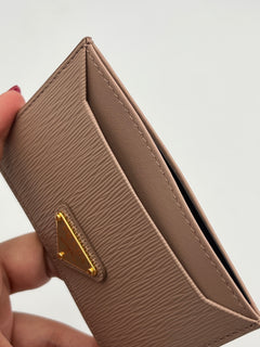 Elaborado en color mauve, es un tarjetero compacto y elegante hecho de cuero Saffiano texturizado de alta calidad con el icónico logo triangular de Prada en el frente. Está diseñado para llevar lo esencial con múltiples ranuras para tarjetas y un bolsillo interior