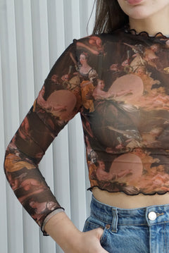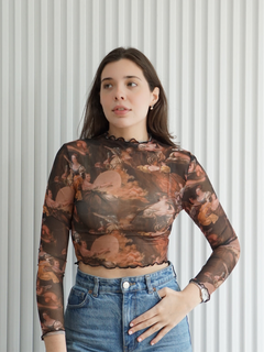 Este top sheer tiene un graphic print y lettuce trim. Ideal para usarlo con un top de su preferencia abajo.