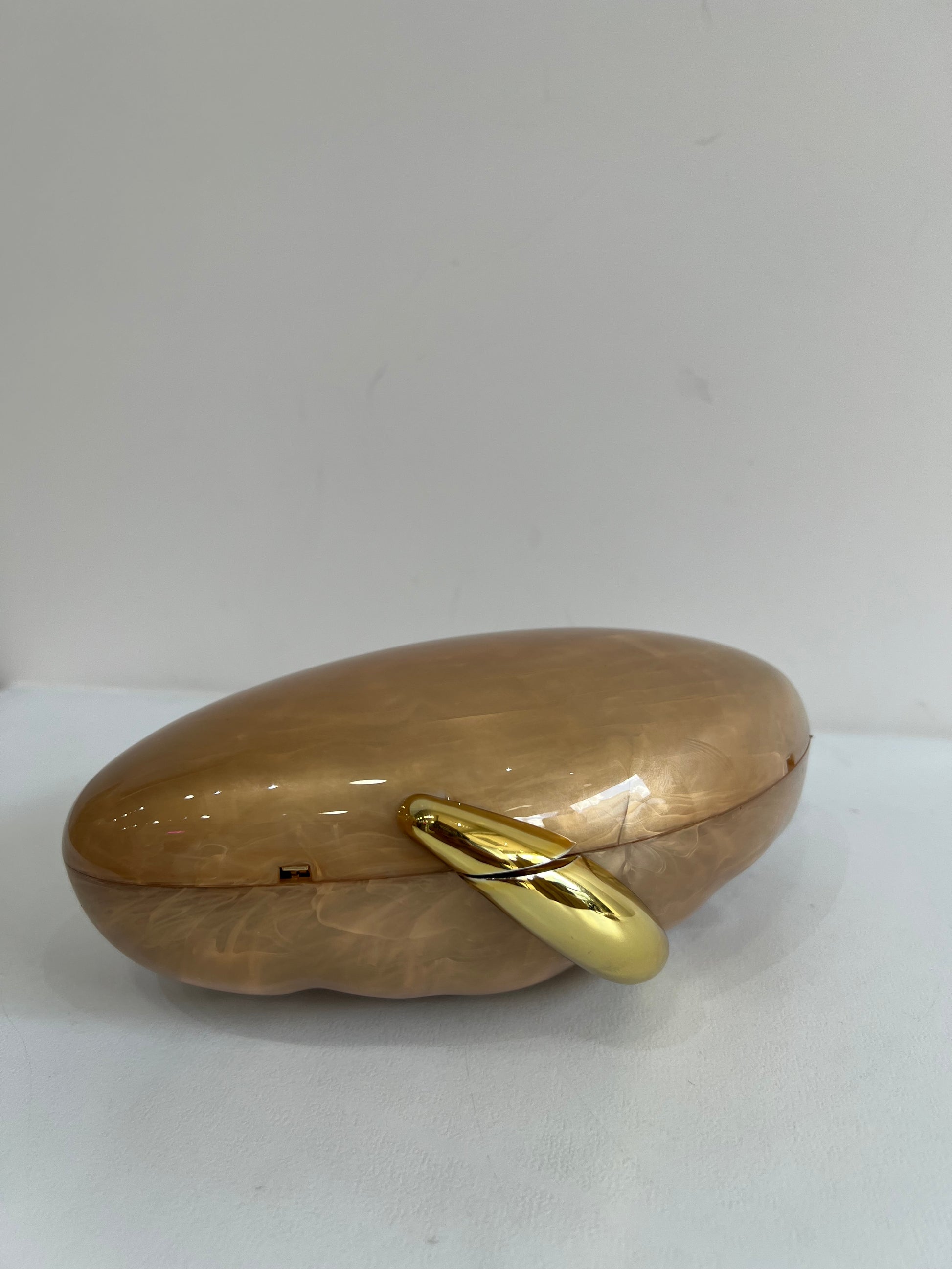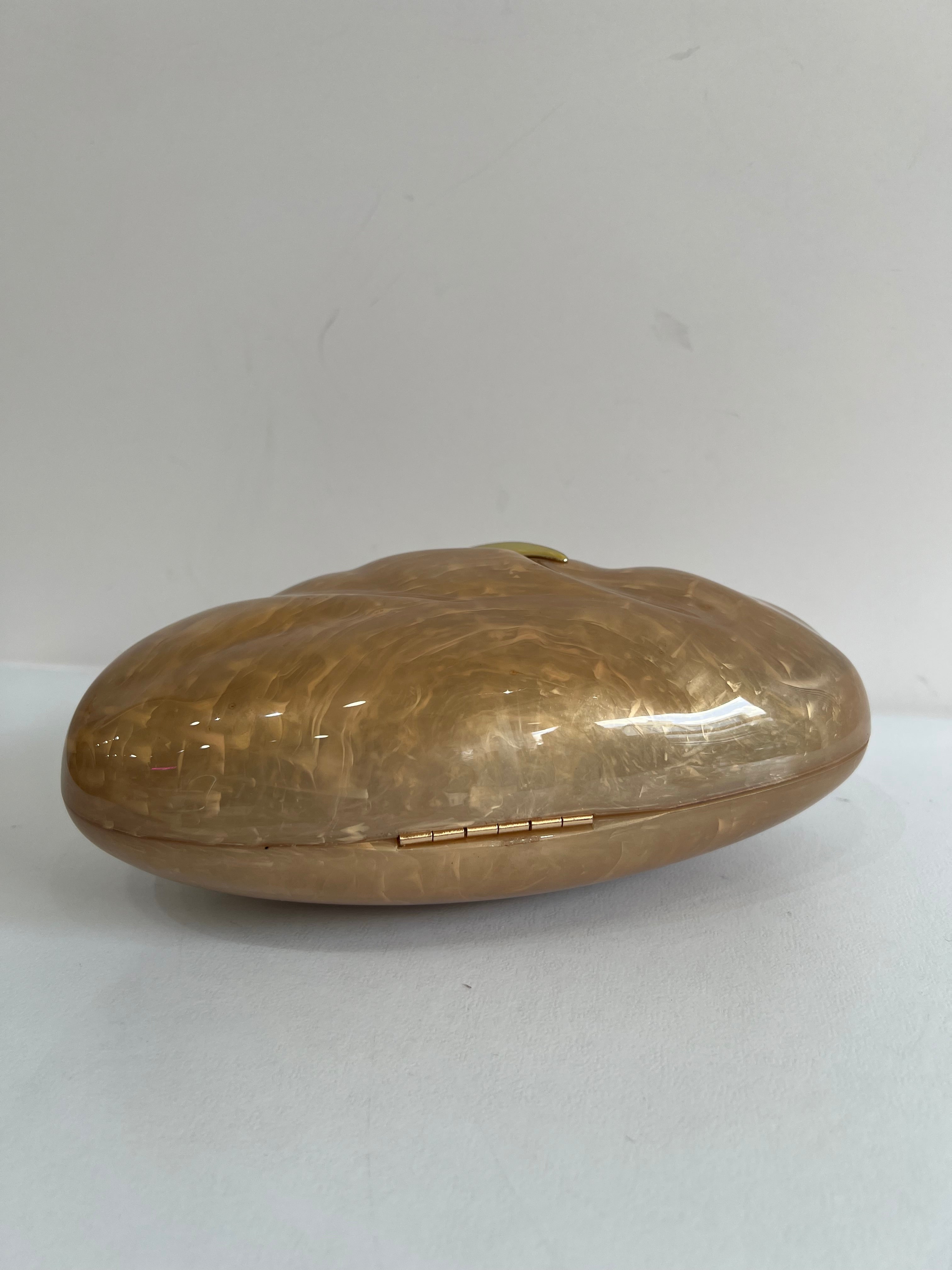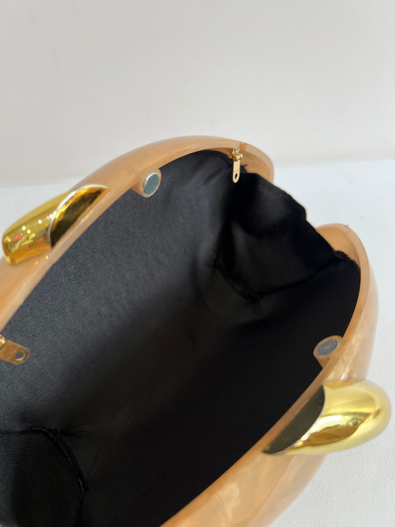 Clutch de mano pequeño con forma inspirada en una concha marina, de diseño rígido y elaborado en acrílico con cierre magnetico.